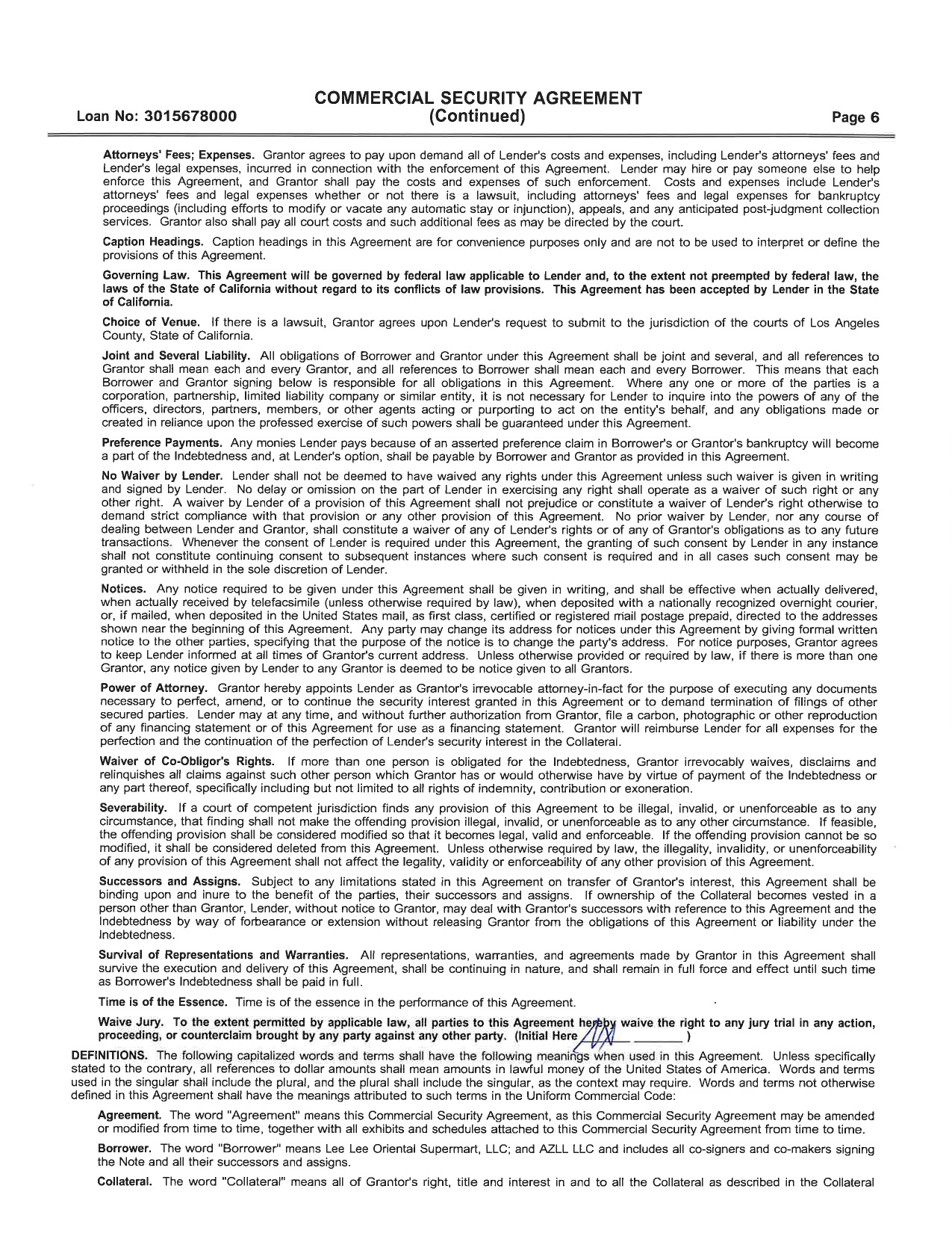Page 5 Loan No: 3015678000 COMMERCIAL SECURITY AGREEMENT (Continued) Page 6 Attorneys' Fees ; Expenses . Grantor agrees to pay upon demand all of Lender's costs and expenses, including Lender's attorneys' fees and Lender's legal expenses, incurred in connection with the enforcement of this Agreement . Lender may hire or pay someone else to help enforce this Agreement, and Grantor shall pay the costs and expenses of such enforcement . Costs and expenses include Lender's attorneys' fees and legal expenses whether or not there is a lawsuit, including attorneys' fees and legal expenses for bankruptcy proceedings (including efforts to modify or vacate any automatic stay or injunction), appeals, and any anticipated post - judgment collection services . Grantor also shall pay all court costs and such additional fees as may be directed by the court . Caption Headings . Caption headings in this Agreement are for convenience purposes only and are not to be used to interpret or define the provisions of this Agreement . Governing Law . This Agreement will be governed by federal law applicable to Lender and, to the extent not preempted by federal law, the laws of the State of California without regard to its conflicts of law provisions . This Agreement has been accepted by Lender in the State of California . Choice of Venue . If there is a lawsuit, Grantor agrees upon Lender's request to submit to the jurisdiction of the courts of Los Angeles County, State of California . Joint and Several Liability . All obligations of Borrower and Grantor under this Agreement shall be joint and several, and all references to Grantor shall mean each and every Grantor, and all references to Borrower shall mean each and every Borrower . This means that each Borrower and Grantor signing below is responsible for all obligations in this Agreement . Where any one or more of the parties is a corporation, partnership, limited liability company or similar entity, it is not necessary for Lender to inquire into the powers of any of the officers, directors, partners, members, or other agents acting or purporting to act on the entity's behalf, and any obligations made or created in reliance upon the professed exercise of such powers shall be guaranteed under this Agreement . Preference Payments . Any monies Lender pays because of an asserted preference claim in Borrower's or Grantor's bankruptcy will become a part of the Indebtedness and, at Lender's option, shall be payable by Borrower and Grantor as provided in this Agreement . No Waiver by Lender . Lender shall not be deemed to have waived any rights under this Agreement unless such waiver is given in writing and signed by Lender . No delay or omission on the part of Lender in exercising any right shall operate as a waiver of such right or any other right . A waiver by Lender of a provision of this Agreement shall not prejudice or constitute a waiver of Lender's right otherwise to demand strict compliance with that provision or any other provision of this Agreement . No prior waiver by Lender, nor any course of dealing between Lender and Grantor, shall constitute a waiver of any of Lender's rights or of any of Grantor's obligations as to any future transactions . Whenever the consent of Lender is required under this Agreement, the granting of such consent by Lender in any instance shall not constitute continuing consent to subsequent instances where such consent is required and in all cases such consent may be granted or withheld in the sole discretion of Lender . Notices . Any notice required to be given under this Agreement shall be given in writing, and shall be effective when actually delivered, when actually received by telefacsimile (unless otherwise required by law), when deposited with a nationally recognized overnight courier, or, if mailed, when deposited in the United States mail, as first class, certified or registered rriail postage prepaid, directed to the addresses shown near the beginning of this Agreement . Any party may change its address for notices under this Agreement by giving formal written notice to the other parties, specifying that the purpose of the notice is to change the party's address . For notice purposes, Grantor agrees to keep Lender informed at all times of Grantor's current address . Unless otherwise provided or required by law, if there is more than one Grantor, any notice given by Lender to any Grantor is deemed to be notice given to all Grantors . Power of Attorney . Grantor hereby appoints Lender as Grantor's irrevocable attorney - in - fact for the purpose of executing any documents necessary to perfect, amend, or to continue the security interest granted in this Agreement or to demand termination of filings of other secured parties . Lender may at any time, and without further authorization from Grantor, file a carbon, photographic or other reproduction of any financing statement or of this Agreement for use as a financing statement . Grantor will reimburse Lender for all expenses for the perfection and the continuation of the perfection of Lender's security interest in the Collateral . Waiver of Co - Obligor's Rights . If more than one person is obligated for the Indebtedness, Grantor irrevocably waives, disclaims and relinquishes all claims against such other person which Grantor has or would otherwise have by virtue of payment of the Indebtedness or any part thereof, specifically including but not limited to all rights of indemnity, contribution or exoneration . Severability . If a court of competent jurisdiction finds any provision of this Agreement to be illegal, invalid, or unenforceable as to any circumstance, that finding shall not make the offending provision illegal, invalid, or unenforceable as to any other circumstance . If feasible, the offending provision shall be considered modified so that it becomes legal, valid and enforceable . If the offending provision cannot be so modified, it shall be considered deleted from thi