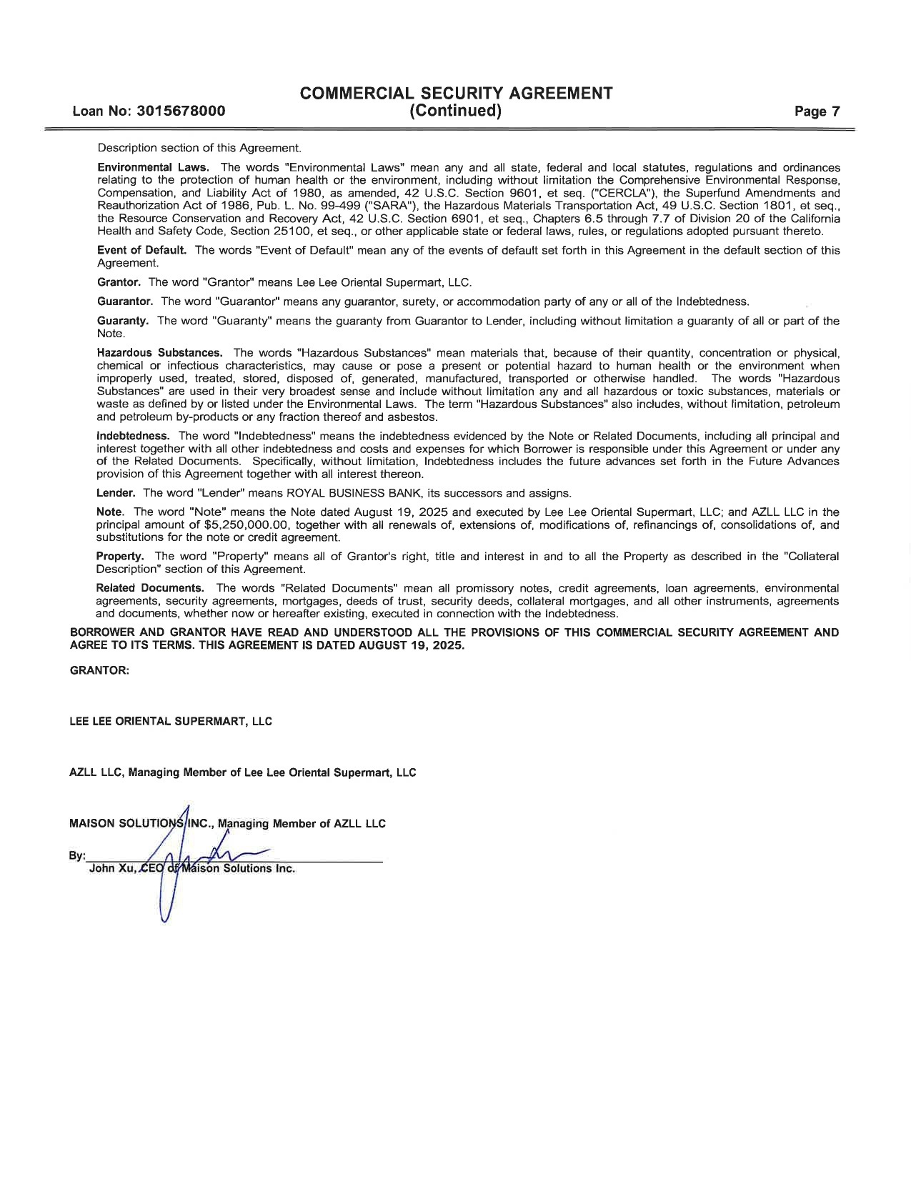 The word "Collateral" means all of Grantor's right, title and interest in and to all the Collateral as described in the Collateral Loan No: 3015678000 COMMERCIAL SECURITY AGREEMENT (Continued) Description section of this Agreement . Environmental Laws . The words "Environmental Laws" mean any and all state, federal and local statutes, regulations and ordinances relating to the protection of human health or the environment, including without limitation the Comprehensive Environmental Response, Compensation, and Liability Act of 1980 , as amended, 42 U . S . C . Section 9601 , et seq . ("CERCLA"), the Superfund Amendments and Reauthorization Act of 1986 , Pub . L . No . 99 - 499 ("SARA"), the Hazardous Materials Transportation Act, 49 U . S . C . Section 1801 , et seq . , the Resource Conservation and Recovery Act, 42 U . S . C . Section 6901 , et seq . , Chapters 6 . 5 through 7 . T of Division 20 of the California Health and Safety Code, Section 25100 , et seq . , or other applicable state or federal laws, rules, or regulations adopted pursuant thereto . Event of Default. The words "Event of Default" mean any of the events of default set forth in this Agreement in the default section of this Agreement. Grantor. The word "Grantor" means Lee Lee Oriental Supermart, LLC. Guarantor. The word "Guarantor" means any guarantor, surety, or accommodation party of any or all of the Indebtedness. Guaranty. The word "Guaranty" means the guaranty from Guarantor to Lender, including without limitation a guaranty of all or part of the Note. Hazardous Substances . The words "Hazardous Substances" mean materials that, because of their quantity, concentration or physical, chemical or infectious characteristics, may cause or pose a present or potential hazard to human health or the environment when improperly used, treated, stored, disposed of, generated, manufactured, transported or otherwise handled . The words "Hazardous Substances" are used in their very broadest sense and include without limitation any and all hazardous or toxic substances, materials or waste as defined by or listed under the Environmental Laws . The term "Hazardous Substances" also includes, without limitation, petroleum and petroleum by - products or any fraction thereof and asbestos . Indebtedness . The word "Indebtedness" means the indebtedness evidenced by the Note or Related Documents, including all principal and interest together with all other indebtedness and costs and expenses for which Borrower is responsible under this Agreement or under any of the Related Documents . Specifically, without limitation, Indebtedness includes the future advances set forth in the Future Advances provision of this Agreement together with all interest thereon . Lender . The word "Lender" means ROYAL BUSINESS BANK, its successors and assigns . Note . The word "Note" means the Note dated August 19 , 2025 and executed by Lee Lee Oriental Supermart, LLC ; and AZLL LLC in the principal amount of $ 5 , 250 , 000 . 00 , together with all renewals of, extensions of, modifications of, refinancings of, consolidations of, and substitutions for the note or credit agreement . Property . The word "Property" means all of Grantor's right, title and interest in and to all the Property as described in the "Collateral Description" section of this Agreement . Related Documents . The words "Related Documents" mean all promissory notes, credit agreements, loan agreements, environmental agreements, security agreements, mortgages, deeds of trust, security deeds, collateral mortgages, and all other instruments, agreements and documents, whether now or hereafter existing, executed in connection with the Indebtedness . BORROWER AND GRANTOR HAVE READ AND UNDERSTOOD ALL THE PROVISIONS OF THIS COMMERCIAL SECURITY AGREEMENT AND AGREE TO ITS TERMS. THIS AGREEMENT IS DATED AUGUST 19, 2025. GRANTOR: Page 7 LEE LEE ORIENTAL SUPERMART, LLC AZLL LLC, Managing Member of Lee Lee Oriental Supermart, LLC MAISON SOLUTtO ANC., Managing Member of AZLL LLC By: John Xu. E ison Solutions Inc.