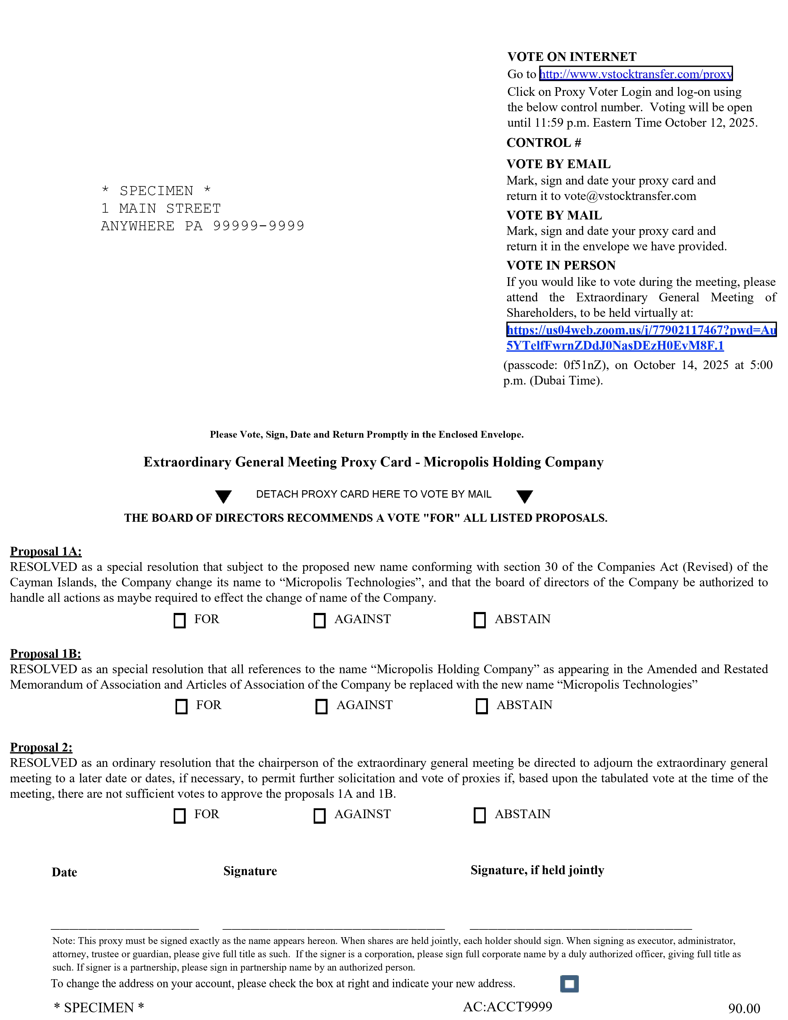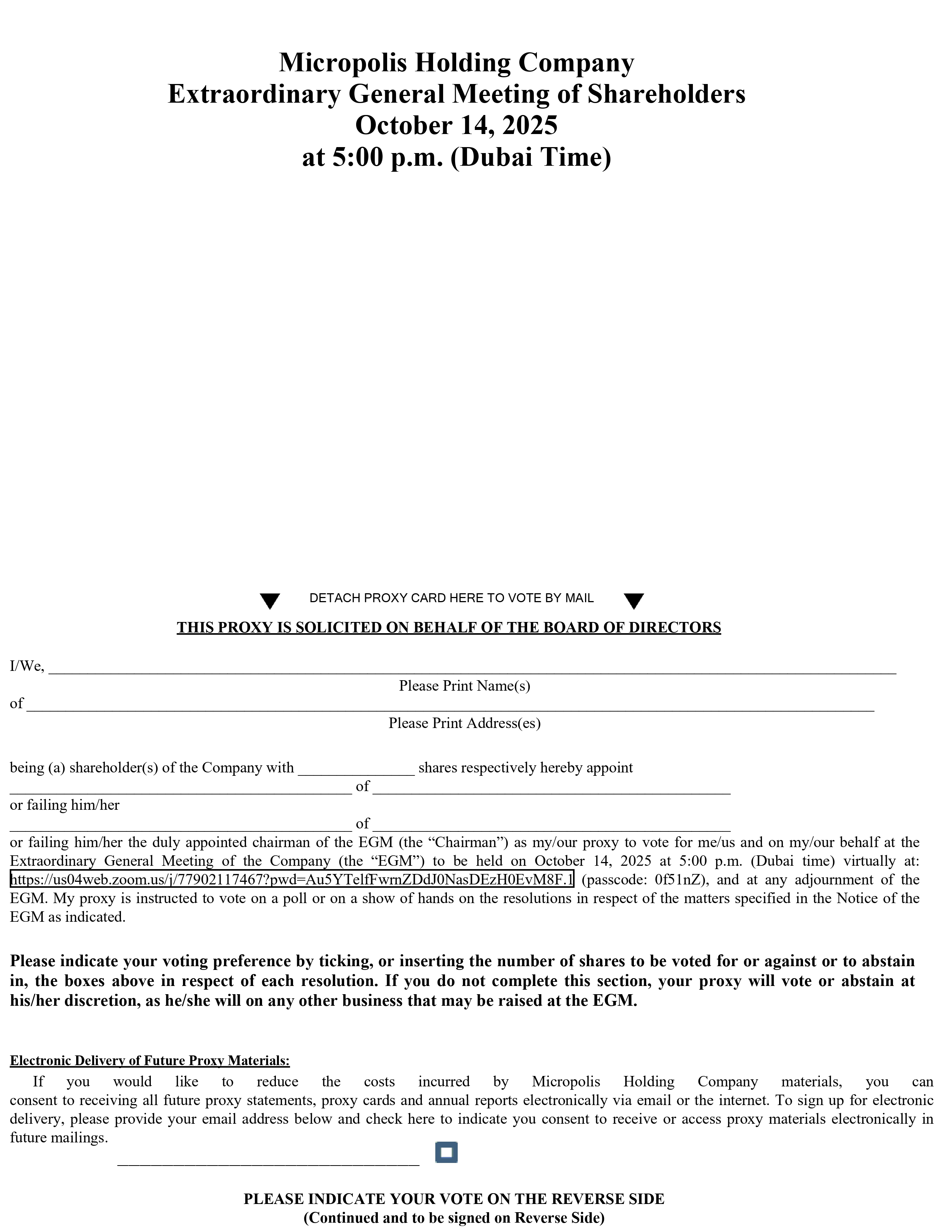 * SPECIMEN * AC:ACCT9999 90.00 Micropolis Holding Company Extraordinary General Meeting of Shareholders October 14, 2025 at 5:00 p.m. (Dubai Time) DETACH PROXY CARD HERE TO VOTE BY MAIL THIS PROXY IS SOLICITED ON BEHALF OF THE BOARD OF DIRECTORS I/We, Please Print Name(s) of Please Print Address(es) being (a) shareholder(s) of the Company with shares respectively hereby appoint of or failing him/her of or failing him/her the duly appointed chairman of the EGM (the “Chairman”) as my/our proxy to vote for me/us and on my/our behalf at the Extraordinary General Meeting of the Company (the “EGM”) to be held on October 14 , 2025 at 5 : 00 p . m . (Dubai time) virtually at : https : //us 04 web . zoom . us/j/ 77902117467 ?pwd=Au 5 YTelfFwrnZDdJ 0 NasDEzH 0 EvM 8 F . 1 (passcode : 0 f 51 nZ), and at any adjournment of the EGM . My proxy is instructed to vote on a poll or on a show of hands on the resolutions in respect of the matters specified in the Notice of the EGM as indicated . Please indicate your voting preference by ticking, or inserting the number of shares to be voted for or against or to abstain in, the boxes above in respect of each resolution . If you do not complete this section, your proxy will vote or abstain at his/her discretion, as he/she will on any other business that may be raised at the EGM . Electronic Delivery of Future Proxy Materials : If you would like to reduce the costs incurred by Micropolis Holding Company materials, you can consent to receiving all future proxy statements, proxy cards and annual reports electronically via email or the internet . To sign up for electronic delivery, please provide your email address below and check here to indicate you consent to receive or access proxy materials electronically in future mailings . PLEASE INDICATE YOUR VOTE ON THE REVERSE SIDE (Continued and to be signed on Reverse Side)