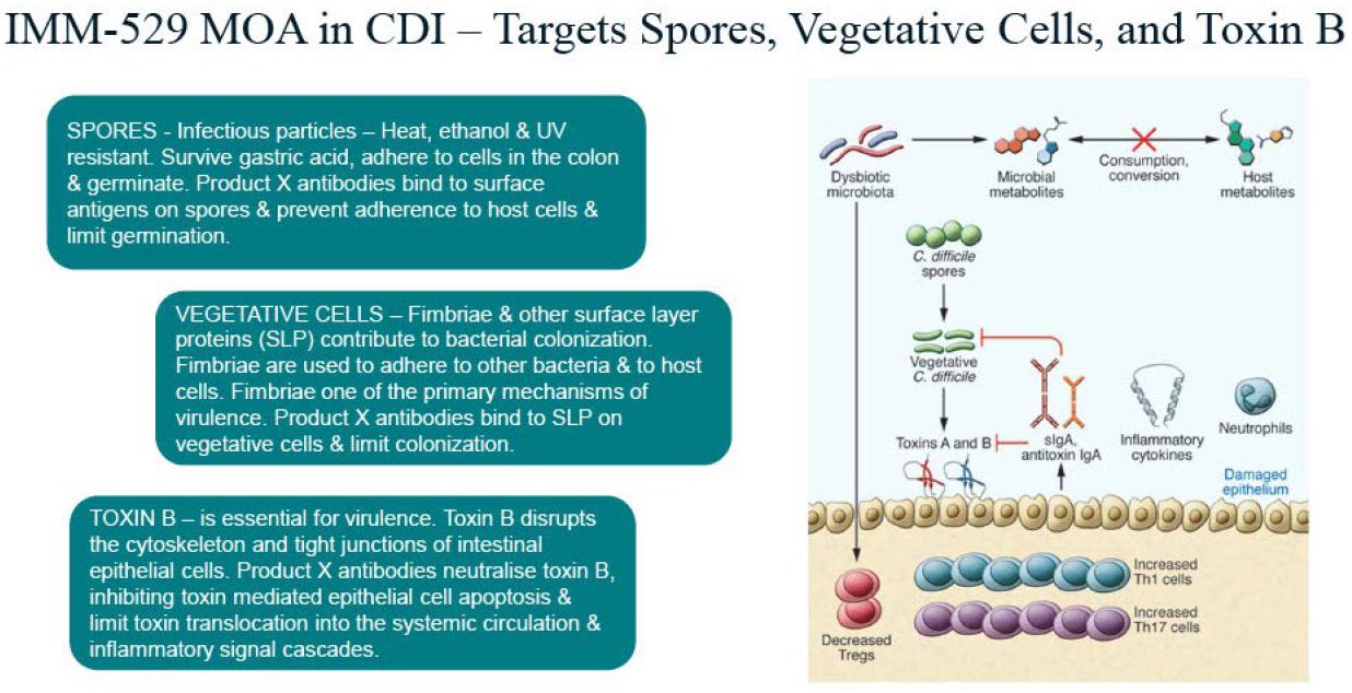 To address this need, Immuron is developing IMM-529 as an adjunctive therapy in combination with standard of care antibiotics for the treatment of CDI and prevention recurrent CDI. IMM-529 has been designed with antibodies that target the key essential virulence components of C. diff, with the potential to accelerate the clearance of CDI infection and support rapid restoration of healthy gut microbiota. This mechanism of action positions IMM-529 as a compelling oral therapeutic drug candidate for the treatment of CDI and preventative of disease recurrent CDI, addressing a critical unmet need in infectious disease management.Immuron is collaborating with Dr. Dena Lyras and her team at Monash University, Australia to develop vaccines designed to elicit antibodies against essential C. diff virulence components. IMM-529 specifically targets Toxin B (TcB), the spores, and the surface layer proteins of the vegetative cells (refer to MOA schematic - below).