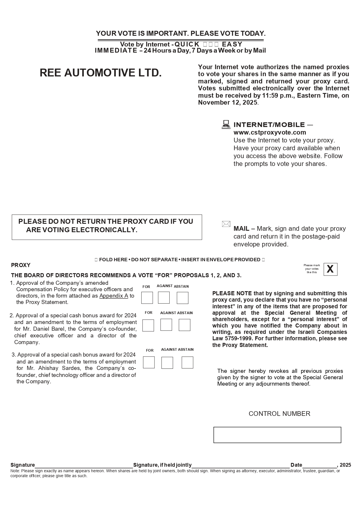 YOUR VOTE IS IMPORTANT. PLEASE VOTE TODAY. Vote by Internet - QUICK EASY IMMEDIATE - 24 Hours a Day, 7 Days a Week or by Mail Your Internet vote authorizes the named proxies to vote your shares in the same manner as if you marked, signed and returned your proxy card . Votes submitted electronically over the Internet must be received by 11 : 59 p . m . , Eastern Time, on November 12 , 2025 . REE AUTOMOTIVE LTD. INTERNET/MOBILE – www.cstproxyvote.com Use the Internet to vote your proxy. Have your proxy card available when you access the above website. Follow the prompts to vote your shares. MAIL – Mark, sign and date your proxy card and return it in the postage - paid envelope provided. FOLD HERE • DO NOT SEPARATE • INSERT IN ENVELOPE PROVIDED PROXY Please mark your votes like this THE BOARD OF DIRECTORS RECOMMENDS A VOTE “FOR” PROPOSALS 1, 2, AND 3. 1. Approval of the Company’s amended Compensation Policy for executive officers and directors, in the form attached as Appendix A to the Proxy Statement. 3 . Approval of a special cash bonus award for 2024 and an amendment to the terms of employment for Mr . Ahishay Sardes, the Company’s co - founder, chief technology officer and a director of the Company . FOR AGAINST ABSTAIN 2 . Approval of a special cash bonus award for 2024 and an amendment to the terms of employment for Mr . Daniel Barel, the Company’s co - founder, chief executive officer and a director of the Company . CONTROL NUMBER Signature Signature, if held jointly Date , 2025 Note: Please sign exactly as name appears hereon. When shares are held by joint owners, both should sign. When signing as attorney, executor, administrator, trustee, guardian, or corporate officer, please give title as such. X PLEASE DO NOT RETURN THE PROXY CARD IF YOU ARE VOTING ELECTRONICALLY. FOR AGAINST ABSTAIN AGAINST ABSTAIN FOR The signer hereby revokes all previous proxies given by the signer to vote at the Special General Meeting or any adjournments thereof . PLEASE NOTE that by signing and submitting this proxy card, you declare that you have no “personal interest” in any of the items that are proposed for approval at the Special General Meeting of shareholders, except for a “personal interest” of which you have notified the Company about in writing, as required under the Israeli Companies Law 5759 - 1999 . For further information, please see the Proxy Statement .