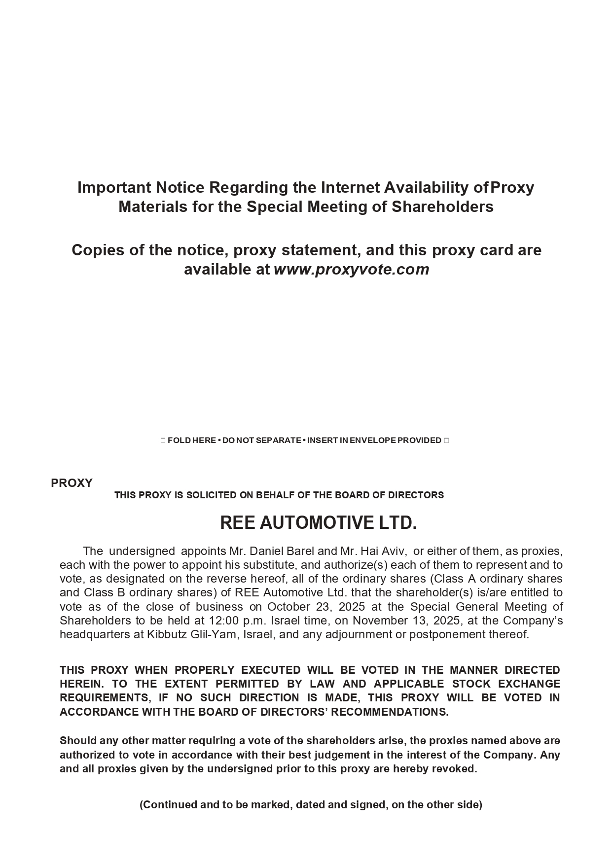 Important Notice Regarding the Internet Availability of Proxy Materials for the Special Meeting of Shareholders Copies of the notice, proxy statement, and this proxy card are available at www.proxyvote.com FOLD HERE • DO NOT SEPARATE • INSERT IN ENVELOPE PROVIDED PROXY THIS PROXY IS SOLICITED ON BEHALF OF THE BOARD OF DIRECTORS REE AUTOMOTIVE LTD. The undersigned appoints Mr . Daniel Barel and Mr . Hai Aviv, or either of them, as proxies, each with the power to appoint his substitute, and authorize(s) each of them to represent and to vote, as designated on the reverse hereof, all of the ordinary shares (Class A ordinary shares and Class B ordinary shares) of REE Automotive Ltd . that the shareholder(s) is/are entitled to vote as of the close of business on October 23 , 2025 at the Special General Meeting of Shareholders to be held at 12 : 00 p . m . Israel time, on November 13 , 2025 , at the Company’s headquarters at Kibbutz Glil - Yam, Israel, and any adjournment or postponement thereof . THIS PROXY WHEN PROPERLY EXECUTED WILL BE VOTED IN THE MANNER DIRECTED HEREIN . TO THE EXTENT PERMITTED BY LAW AND APPLICABLE STOCK EXCHANGE REQUIREMENTS, IF NO SUCH DIRECTION IS MADE, THIS PROXY WILL BE VOTED IN ACCORDANCE WITH THE BOARD OF DIRECTORS’ RECOMMENDATIONS . Should any other matter requiring a vote of the shareholders arise, the proxies named above are authorized to vote in accordance with their best judgement in the interest of the Company . Any and all proxies given by the undersigned prior to this proxy are hereby revoked . (Continued and to be marked, dated and signed, on the other side)