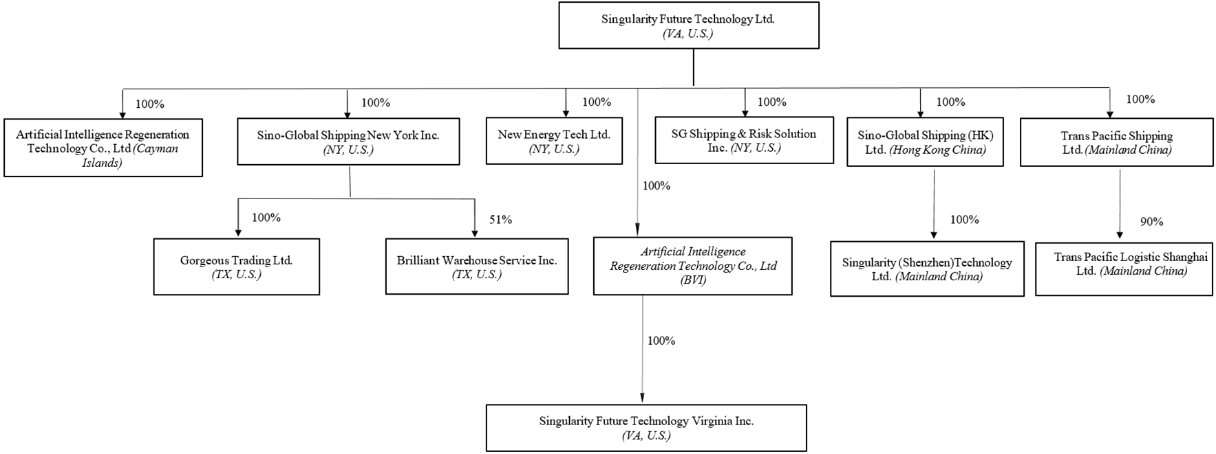 | Sino-Global Shipping New York Inc. | New York, U.S. | Singularity Future Technology Ltd. (100% Owned) | ||||