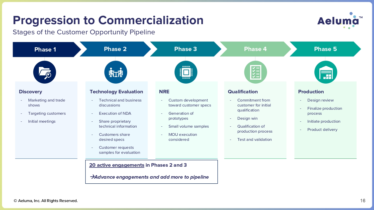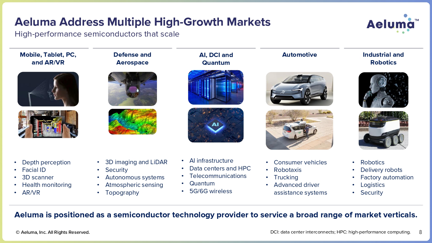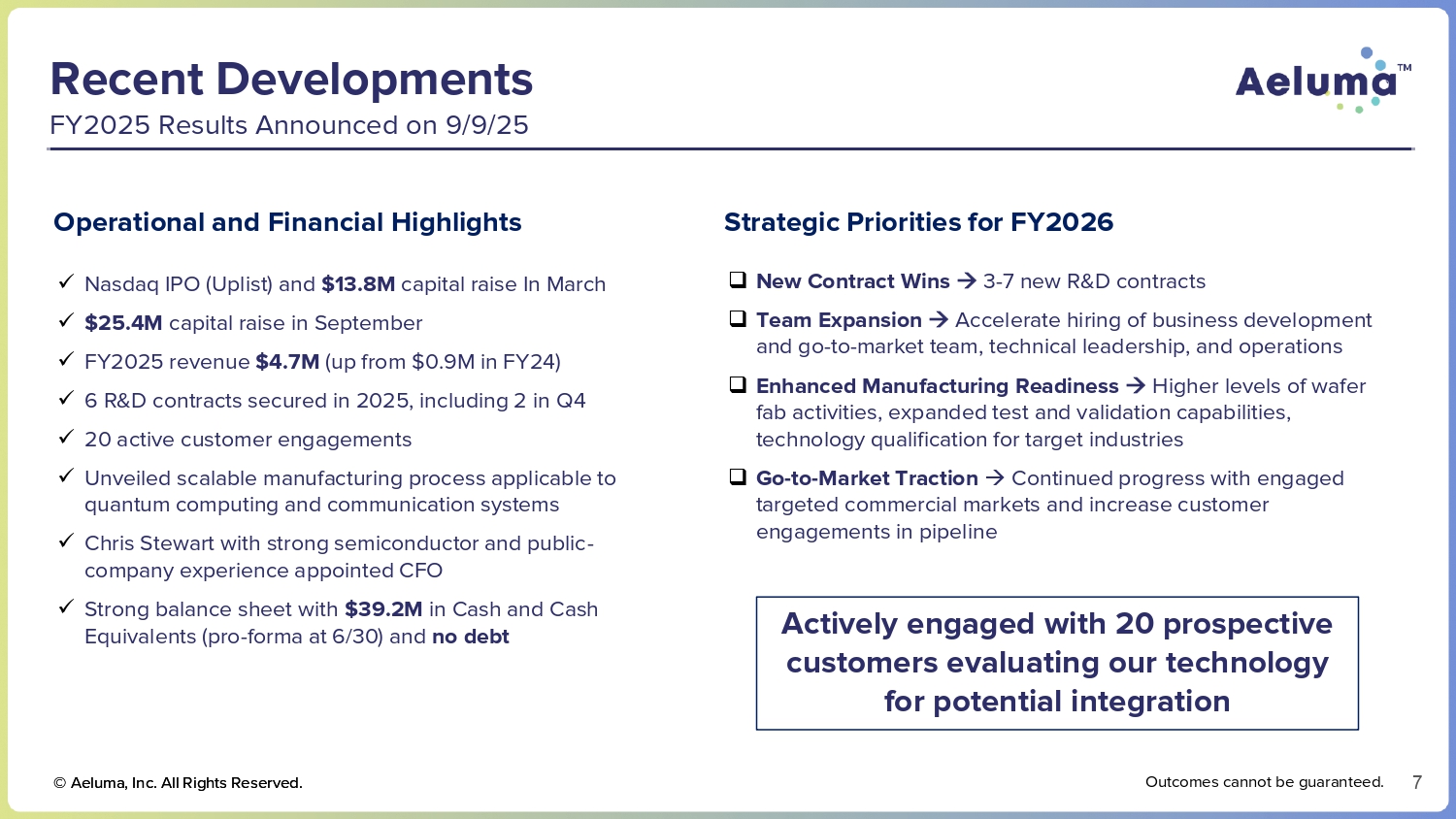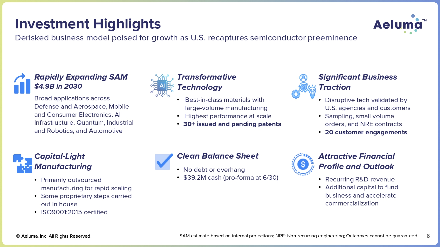 Aeluma’s Indium Gallium Arsenide (InGaAs) Breakthrough Best - in - class materials with scalable manufacturing InGaAs is the best material for shortwave infrared (SWIR) applications, impacting defense & aerospace, mobile and consumer electronics, AI infrastructure, industrial and robotics, quantum, and automotive. Eye safe, operation in direct sunlight, night vision, higher sensitivity, higher speed, lower power consumption, and lower cost “InGaAs on silicon won’t work, people have tried.” “You can’t grow quantum dots by MOCVD.” Aeluma (2022) © Aeluma, Inc. All Rights Reserved. MOCVD: metalorganic chemical vapor deposition; Outcomes cannot be guaranteed. 5 Investment Highlights Derisked business model poised for growth as U.S. recaptures semiconductor preeminence Rapidly Expanding SAM $4.9B in 2030 Broad applications across Defense and Aerospace, Mobile and Consumer Electronics, AI Infrastructure, Quantum, Industrial and Robotics, and Automotive Transformative Technology • Best - in - class materials with large - volume manufacturing • Highest performance at scale • 30+ issued and pending patents Significant Business Traction • Disruptive tech validated by U.S. agencies and customers • Sampling, small volume orders, and NRE contracts • 20 customer engagements Capital - Light Manufacturing • Primarily outsourced manufacturing for rapid scaling • Some proprietary steps carried out in house • ISO9001:2015 certified Clean Balance Sheet • No debt or overhang • $39.2M cash (pro - forma at 6/30) Attractive Financial Profile and Outlook • Recurring R&D revenue • Additional capital to fund business and accelerate commercialization © Aeluma, Inc. All Rights Reserved. SAM estimate based on internal projections; NRE: Non - recurring engineering; Outcomes cannot be guaranteed. 6 Recent Developments FY2025 Results Announced on 9/9/25 Operational and Financial Highlights x Nasdaq IPO (Uplist) and $13.8M capital raise In March x $25.4M capital raise in September x FY2025 revenue $4.7M (up from $0.9M in FY24) x 6 R&D contracts secured in 2025, including 2 in Q4 x 20 active customer engagements x Unveiled scalable manufacturing process applicable to quantum computing and communication systems x Chris Stewart with strong semiconductor and public - company experience appointed CFO x Strong balance sheet with $39.2M in Cash and Cash Equivalents (pro - forma at 6/30) and no debt Strategic Priorities for FY2026 □ New Contract Wins 3 - 7 new R&D contracts □ Team Expansion Accelerate hiring of business development and go - to - market team, technical leadership, and operations □ Enhanced Manufacturing Readiness Higher levels of wafer fab activities, expanded test and validation capabilities, technology qualification for target industries □ Go - to - Market Traction Continued progress with engaged targeted commercial markets and increase customer engagements in pipeline Actively engaged with 20 prospective customers evaluating our technology for potential integration © Aeluma, Inc. All Rights Reserved. Outcomes cannot be guaranteed. 7