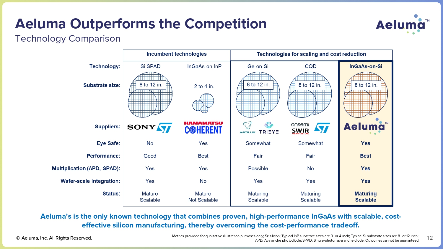 Manufacturing for a Mass Market Aeluma’s large - diameter manufacturing economies of scale Incumbent technologies cannot meet volume requirements for consumer markets Aeluma’s manufacturing enables scaling and cost reduction required for current mass market applications Typical fab capacity Wafers required for 20m sensor chips Substrate size 1k - 10k wafers per month 425k wafers 3 - inch Incumbent Technology 1k - 10k wafers per month 213k wafers 4 - inch 10k - 100k per month 43k wafers 8 - inch Large - diameter platform 10k - 100k per month 18k wafers 12 - inch Manufacturing Capacity Bottleneck: Producing 20 million sensor chips for consumer market Aeluma’s Large - Diameter Wafer Platform © Aeluma, Inc. All Rights Reserved. Values are provided for qualitative illustration purposes only; Outcomes cannot be guaranteed. 11 APD: Avalanche photodiode; SPAD: Single - photon avalanche diode; Outcomes cannot be guaranteed.
