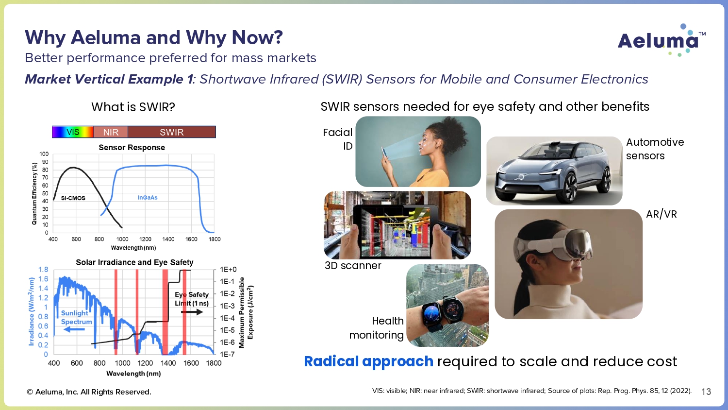 Aeluma Outperforms the Competition Technology Comparison Aeluma’s is the only known technology that combines proven, high - performance InGaAs with scalable, cost - effective silicon manufacturing, thereby overcoming the cost - performance tradeoff. Metrics provided for qualitative illustration purposes only; Si: silicon; Typical InP substrate sizes are 3 - or 4 - inch; Typical Si substrate sizes are 8 - or 12 - inch.; 12 © Aeluma, Inc. All Rights Reserved.