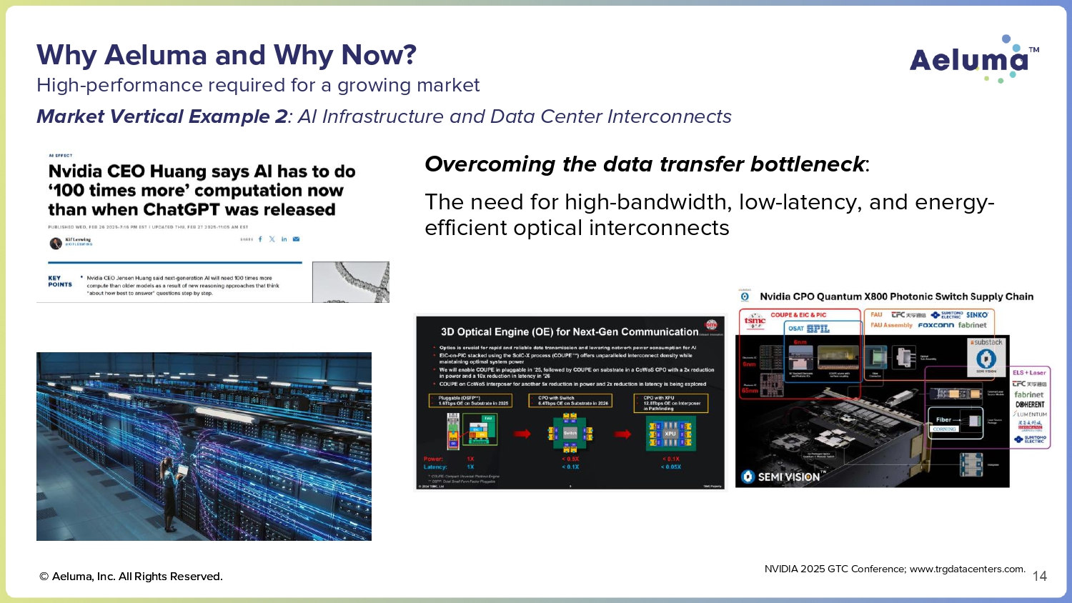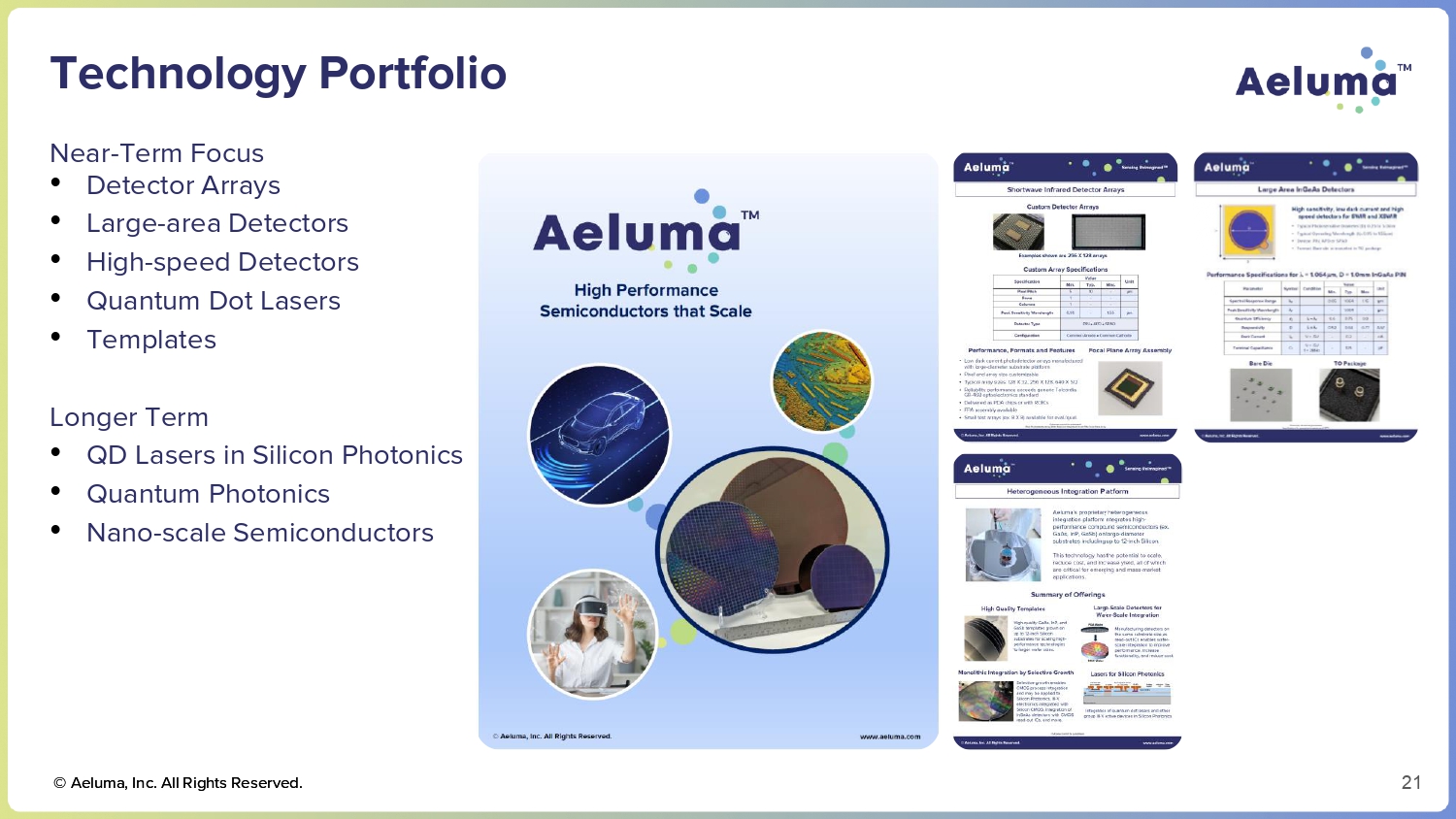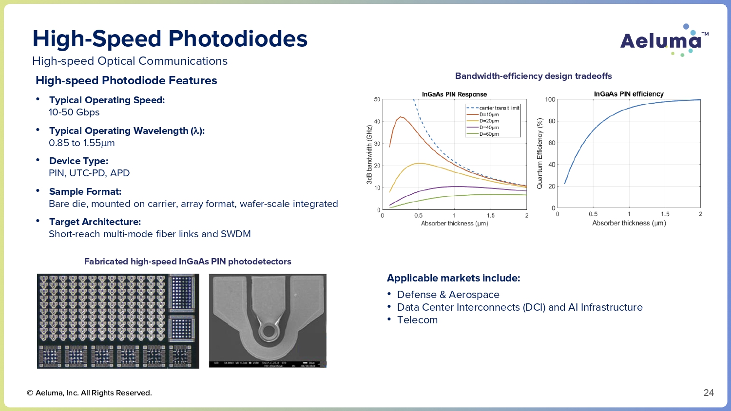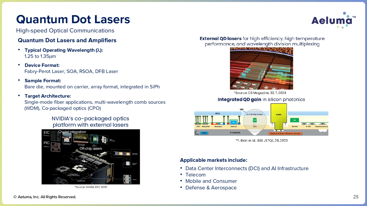 High - Speed Photodiodes Bandwidth - efficiency design tradeoffs High - speed Optical Communications High - speed Photodiode Features © Aeluma, Inc. All Rights Reserved. 24 • Typical Operating Speed: 10 - 50 Gbps • Typical Operating Wavelength ( ): 0.85 to 1.55 m • Device Type: PIN, UTC - PD, APD • Sample Format: Bare die, mounted on carrier, array format, wafer - scale integrated • Target Architecture: Short - reach multi - mode fiber links and SWDM Fabricated high - speed InGaAs PIN photodetectors Applicable markets include: • Defense & Aerospace • Data Center Interconnects (DCI) and AI Infrastructure • Telecom Quantum Dot Lasers Applicable markets include: • Data Center Interconnects (DCI) and AI Infrastructure • Telecom • Mobile and Consumer • Defense & Aerospace High - speed Optical Communications Quantum Dot Lasers and Amplifiers • Typical Operating Wavelength ( ): 1.25 to 1.35 m • Device Format: Fabry - Perot Laser, SOA, RSOA, DFB Laser • Sample Format: Bare die, mounted on carrier, array format, integrated in SiPh • Target Architecture: Single - mode fiber applications, multi - wavelength comb sources (WDM), Co - packaged optics (CPO) NVIDIA’s co - packaged optics platform with external lasers © Aeluma, Inc. All Rights Reserved. 25