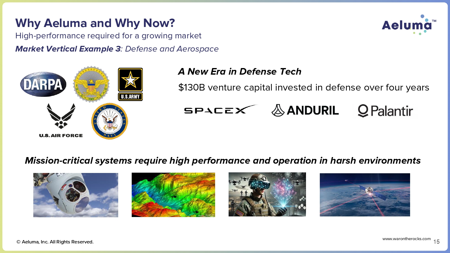 Why Aeluma and Why Now? High - performance required for a growing market Market Vertical Example 2 : AI Infrastructure and Data Center Interconnects Overcoming the data transfer bottleneck : The need for high - bandwidth, low - latency, and energy - efficient optical interconnects NVIDIA 2025 GTC Conference; www.trgdatacenters.com. © Aeluma, Inc. All Rights Reserved. 14 Why Aeluma and Why Now? High - performance required for a growing market Market Vertical Example 3 : Defense and Aerospace A New Era in Defense Tech $130B venture capital invested in defense over four years Mission - critical systems require high performance and operation in harsh environments www.warontherocks.com © Aeluma, Inc. All Rights Reserved. 15