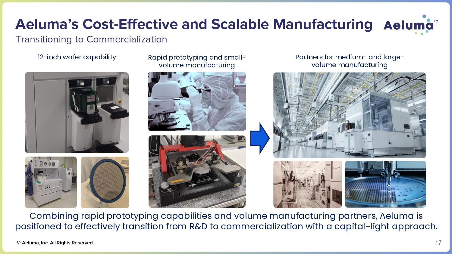 Discovery - Marketing and trade shows - Targeting customers - Initial meetings Qualification - Commitment from customer for initial qualification - Design win - Qualification of production process - Test and validation Phase 1 Phase 2 Phase 3 Phase 4 Phase 5 Production © Aeluma, Inc. All Rights Reserved. 16 - Design review - Finalize production process - Initiate production - Product delivery NRE - Custom development toward customer specs - Generation of prototypes - Small volume samples - MOU execution considered Technology Evaluation - Technical and business discussions - Execution of NDA - Share proprietary technical information - Customers share desired specs - Customer requests samples for evaluation 20 active engagements in Phases 2 and 3 Advance engagements and add more to pipeline Progression to Commercialization Stages of the Customer Opportunity Pipeline Aeluma’s Cost - Effective and Scalable Manufacturing Transitioning to Commercialization 12 - inch wafer capability Combining rapid prototyping capabilities and volume manufacturing partners, Aeluma is positioned to effectively transition from R&D to commercialization with a capital - light approach.