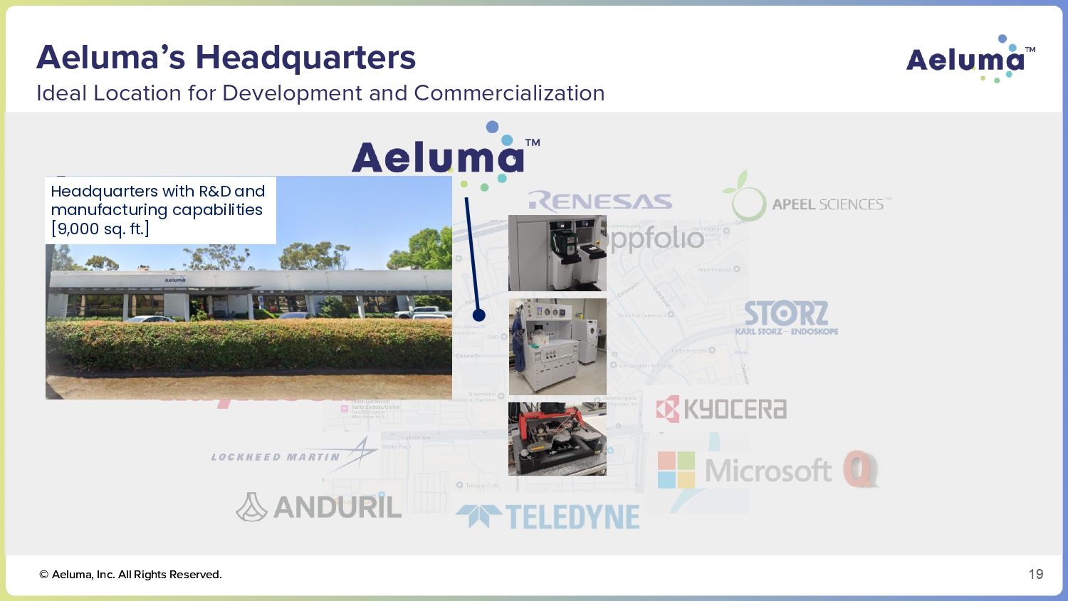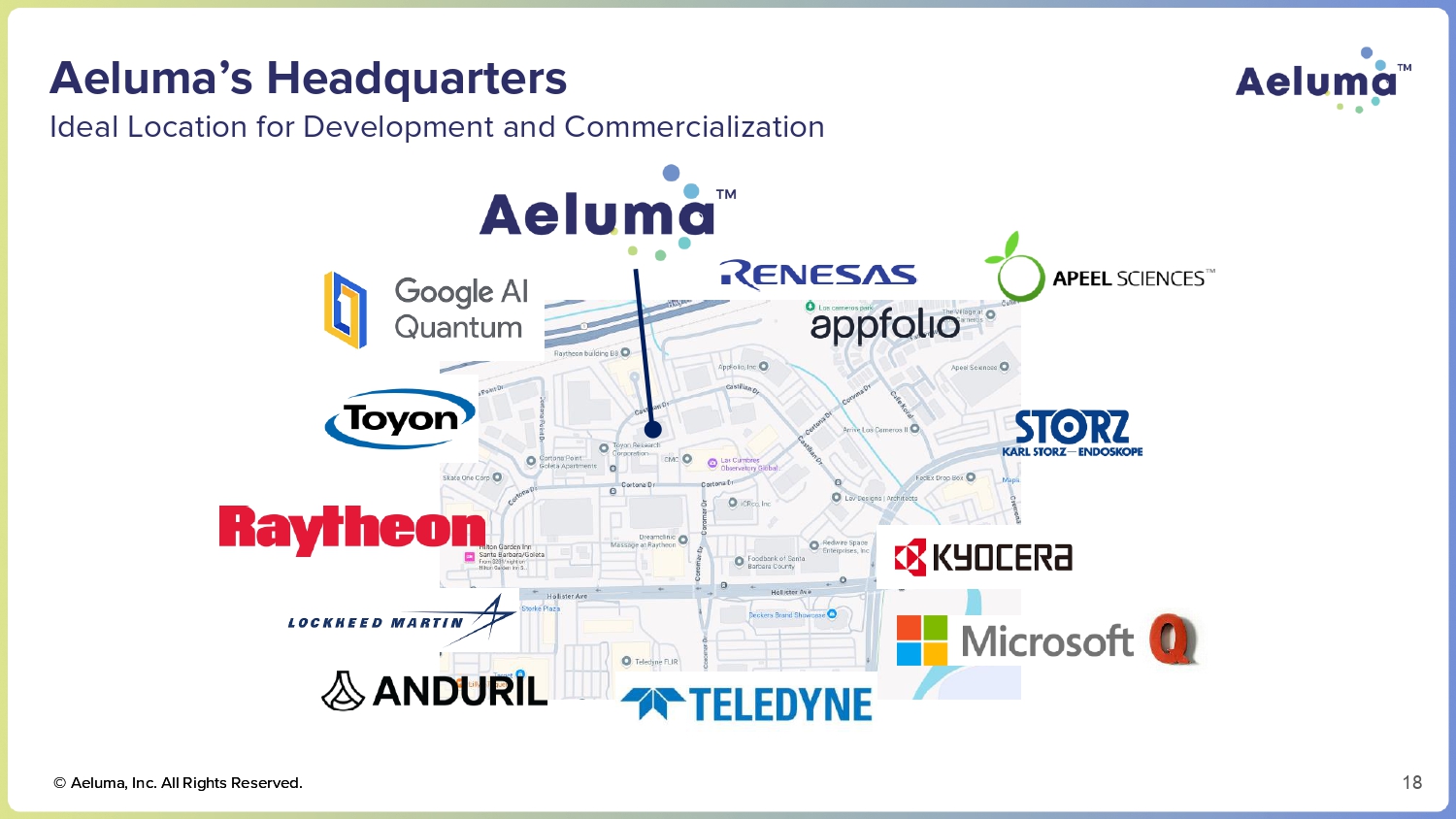 Rapid prototyping and small - volume manufacturing Partners for medium - and large - volume manufacturing © Aeluma, Inc. All Rights Reserved. 17 Aeluma’s Headquarters Ideal Location for Development and Commercialization © Aeluma, Inc. All Rights Reserved. 18