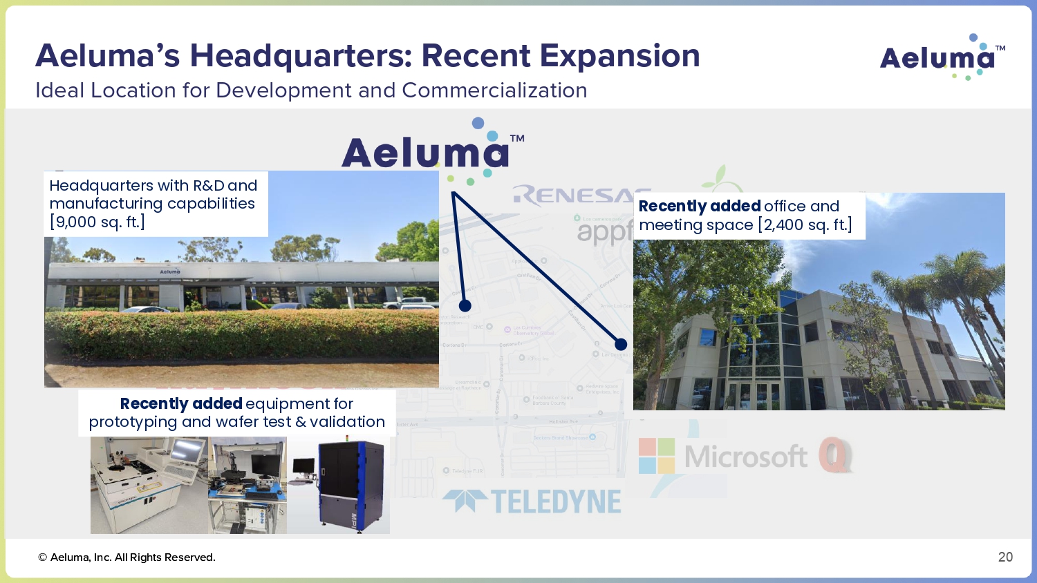 Aeluma’s Headquarters Ideal Location for Development and Commercialization Headquarters with R&D and manufacturing capabilities [ 9 , 000 sq . ft . ] © Aeluma, Inc. All Rights Reserved. 19 Aeluma’s Headquarters: Recent Expansion Ideal Location for Development and Commercialization Headquarters with R&D and manufacturing capabilities [ 9 , 000 sq . ft . ] Recently added equipment for prototyping and wafer test & validation Recently added office and meeting space [2,400 sq. ft.] © Aeluma, Inc. All Rights Reserved. 20