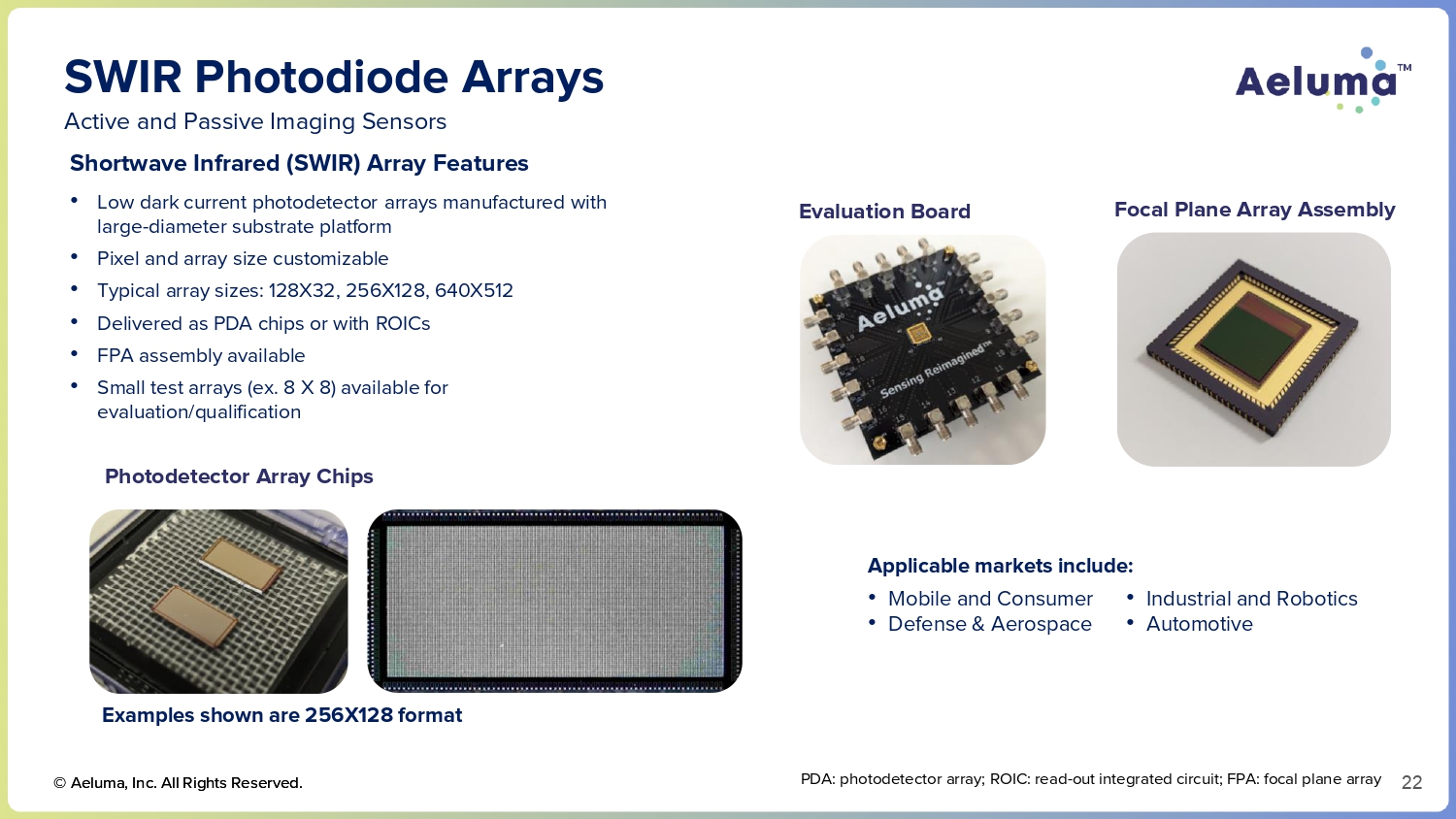 Technology Portfolio © Aeluma, Inc. All Rights Reserved. 21 Near - Term Focus • Detector Arrays • Large - area Detectors • High - speed Detectors • Quantum Dot Lasers • Templates Longer Term • QD Lasers in Silicon Photonics • Quantum Photonics • Nano - scale Semiconductors SWIR Photodiode Arrays Active and Passive Imaging Sensors Shortwave Infrared (SWIR) Array Features • Low dark current photodetector arrays manufactured with large - diameter substrate platform • Pixel and array size customizable • Typical array sizes: 128X32, 256X128, 640X512 • Delivered as PDA chips or with ROICs • FPA assembly available • Small test arrays (ex.