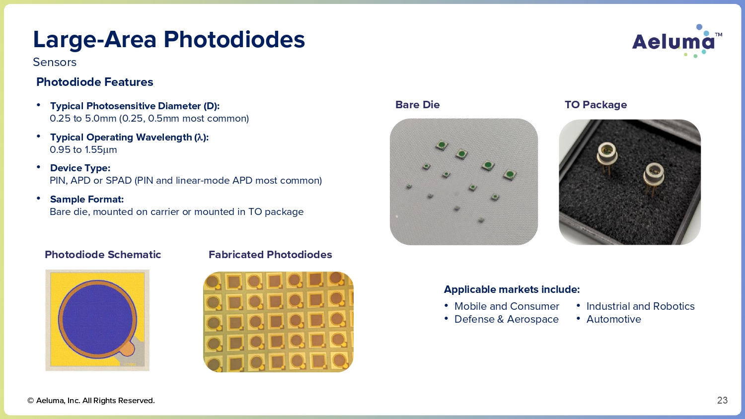 8 X 8) available for evaluation/qualification Examples shown are 256X128 format Focal Plane Array Assembly Evaluation Board PDA: photodetector array; ROIC: read - out integrated circuit; FPA: focal plane array © Aeluma, Inc. All Rights Reserved. 22 Photodetector Array Chips • Mobile and Consumer • Defense & Aerospace • Industrial and Robotics • Automotive Applicable markets include: