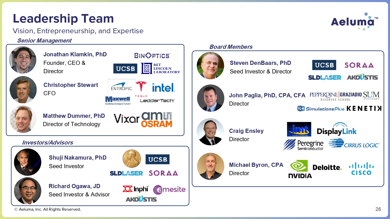Leadership Team Steven DenBaars, PhD Seed Investor & Director John Paglia, PhD, CPA, CFA Director Craig Ensley Director Shuji Nakamura, PhD Seed Investor Richard Ogawa, JD Seed Investor & Advisor Vision, Entrepreneurship, and Expertise Senior Management Board Members Investors/Advisors Michael Byron, CPA Director Jonathan Klamkin, PhD Founder, CEO & Director Christopher Stewart CFO Matthew Dummer, PhD Director of Technology © Aeluma, Inc. All Rights Reserved. 26 © Aeluma, Inc. All Rights Reserved. info@aeluma.com | www.aeluma.com © Aeluma, Inc. All Rights Reserved.