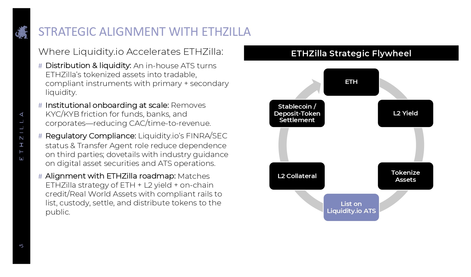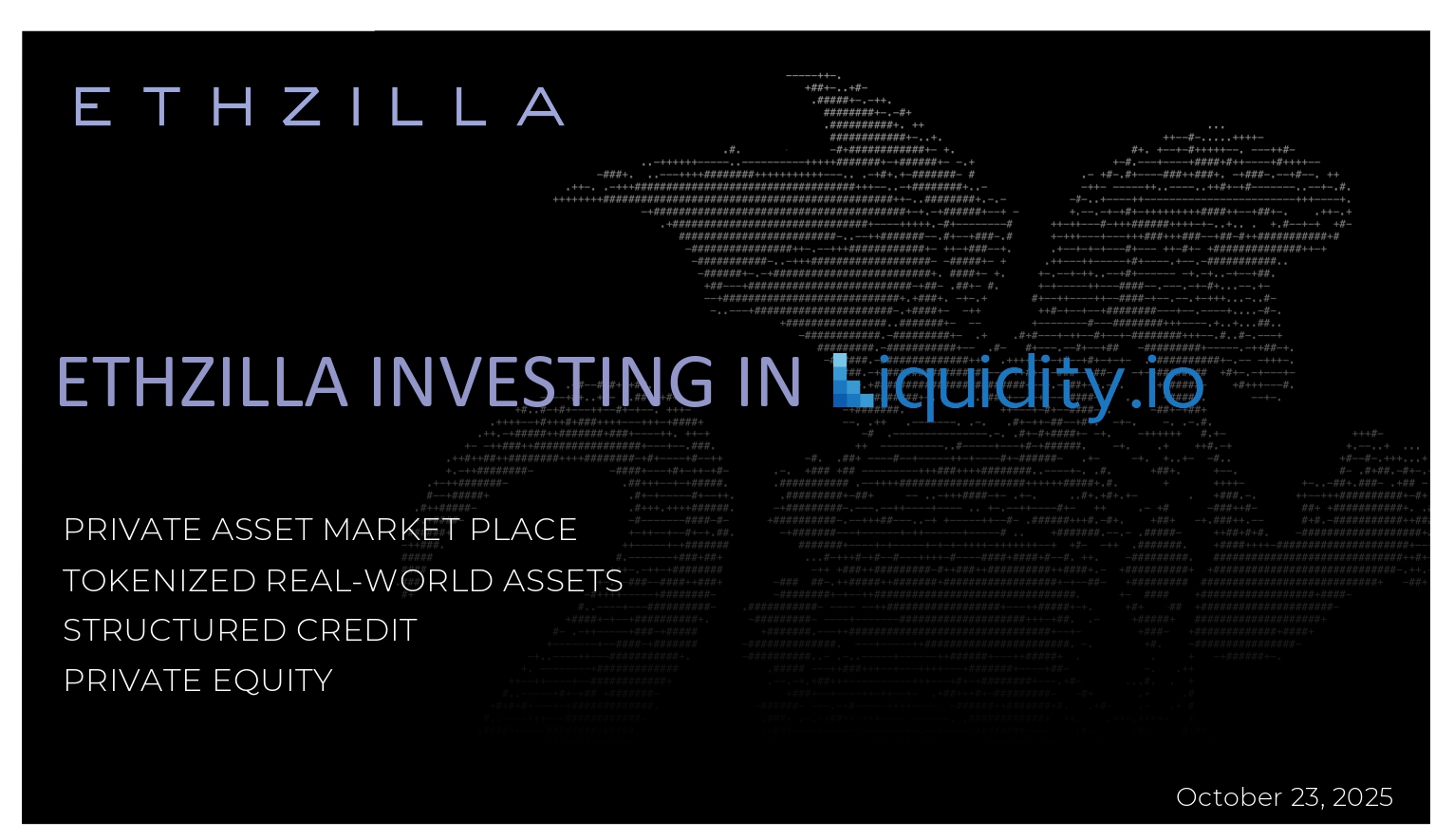 PALM BEACH, Fla., Oct. 23, 2025 /PRNewswire/ -- ETHZilla Corporation (Nasdaq: ETHZ) (“ETHZilla” or the “Company”), a technology company bridging traditional finance and decentralized finance, today announced a strategic partnership with Liquidity.io, a regulated broker-dealer and operator of a Digital Alternative Trading System (ATS), and a wholly owned subsidiary of Satschel, Inc. The partnership is expected to accelerate ETHZilla’s institutional-grade tokenization capabilities, enabling secure, compliant, and liquid access to real-world assets (RWAs) through Ethereum Layer 2 networks. The partnership will include a $15 million investment by ETHZilla in Satschel, Inc. ($5 million in cash and $10 million in equity).