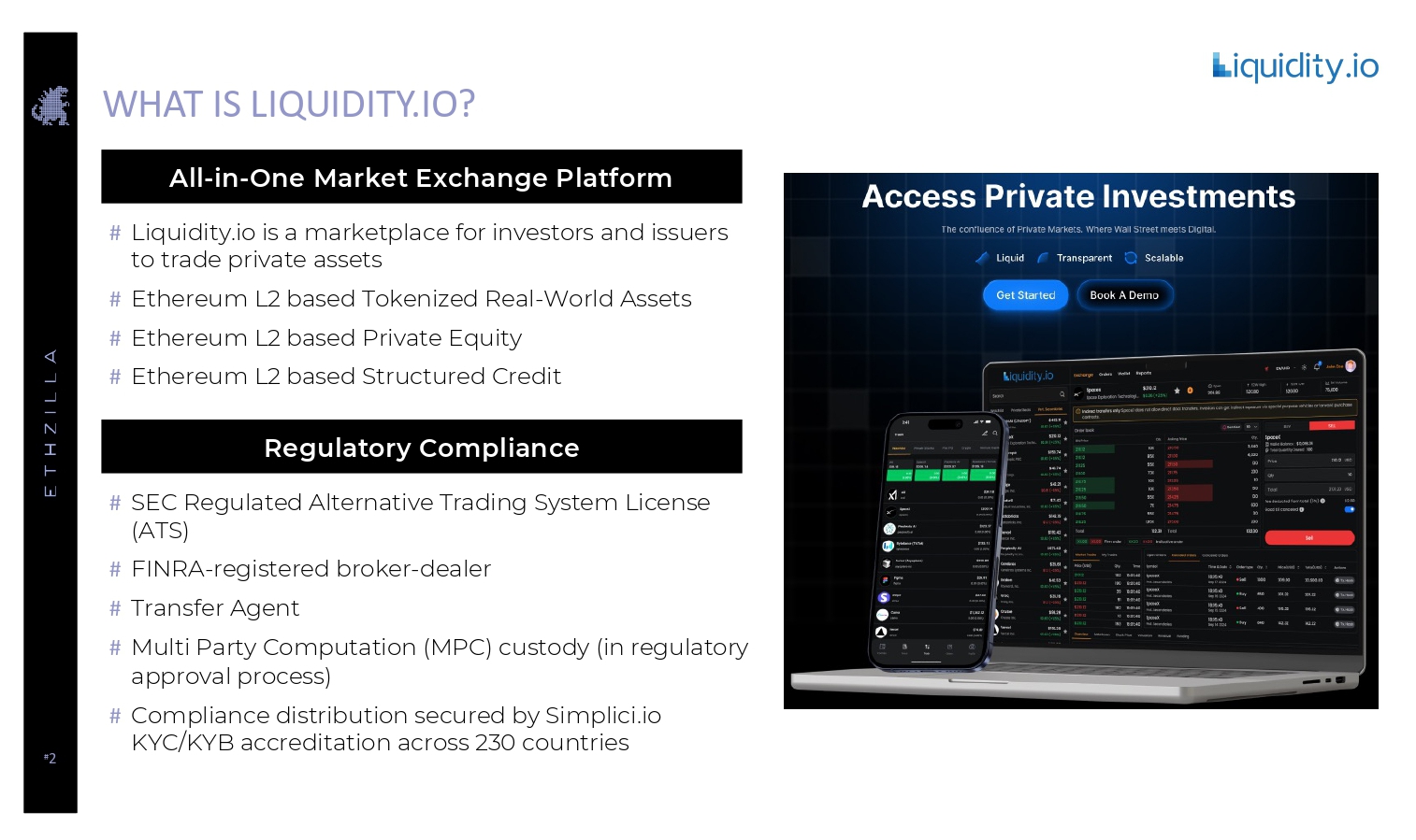 Liquidity.io delivers a fully regulated marketplace for trading private assets, combining Securities and Exchange Commission (SEC)-licensed exchange infrastructure with Ethereum L2 tokenization. The Platform enables institutional and accredited investors to access private secondaries, structured credit, and real-world assets (RWAs) through a single compliant marketplace with instant settlement and liquidity.