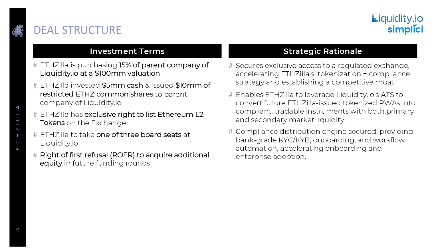 ETHZILLA INVESTING IN PRIVATE ASSET MARKET PLACE TOKENIZED REAL - WORLD ASSETS STRUCTURED CREDIT PRIVATE EQUITY October 23, 2025 # 2 WHAT IS LIQUIDITY.IO? All - in - One Market Exchange Platform # Liquidity.io is a marketplace for investors and issuers to trade private assets # Ethereum L2 based Tokenized Real - World Assets # Ethereum L2 based Private Equity # Ethereum L2 based Structured Credit Regulatory Compliance # SEC Regulated Alternative Trading System License (ATS) # FINRA - registered broker - dealer # Transfer Agent # Multi Party Computation (MPC) custody (in regulatory approval process) # Compliance distribution secured by Simplici.io KYC/KYB accreditation across 230 countries # 3 DEAL STRUCTURE # ETHZilla is purchasing 15% of parent company of Liquidity.io at a $100mm valuation # ETHZilla invested $5mm cash & issued $10mm of restricted ETHZ common shares to parent company of Liquidity.io # ETHZilla has exclusive right to list Ethereum L2 Tokens on the Exchange # ETHZilla to take one of three board seats at Liquidity.io # Right of first refusal (ROFR) to acquire additional equity in future funding rounds Investment Terms Strategic Rationale # Secures exclusive access to a regulated exchange, accelerating ETHZilla's tokenization + compliance strategy and establishing a competitive moat # Enables ETHZilla to leverage Liquidity.io’s ATS to convert future ETHZilla - issued tokenized RWAs into compliant, tradable instruments with both primary and secondary market liquidity.