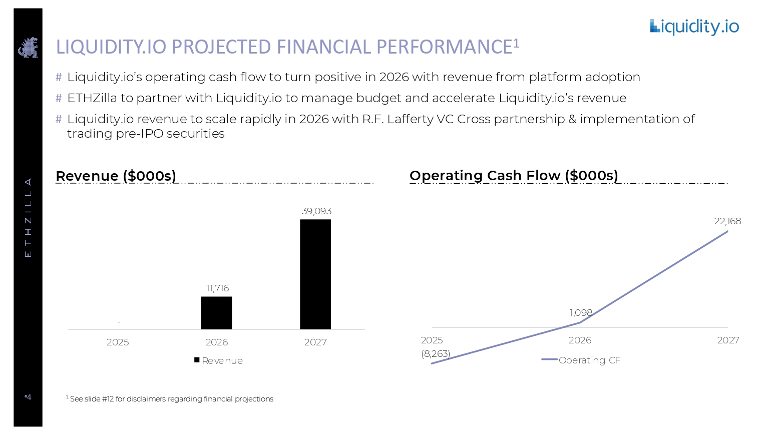 # 4 LIQUIDITY.IO PROJECTED FINANCIAL PERFORMANCE 1 # Liquidity.io’s operating cash flow to turn positive in 2026 with revenue from platform adoption # ETHZilla to partner with Liquidity.io to manage budget and accelerate Liquidity.io’s revenue # Liquidity.io revenue to scale rapidly in 2026 with R.F. Lafferty VC Cross partnership & implementation of trading pre - IPO securities - 11,716 39,093 2025 2026 2027 Revenue (8,263) 1,098 22,168 2025 2026 2027 Operating CF Revenue ($000s) Operating Cash Flow ($000s) 1.