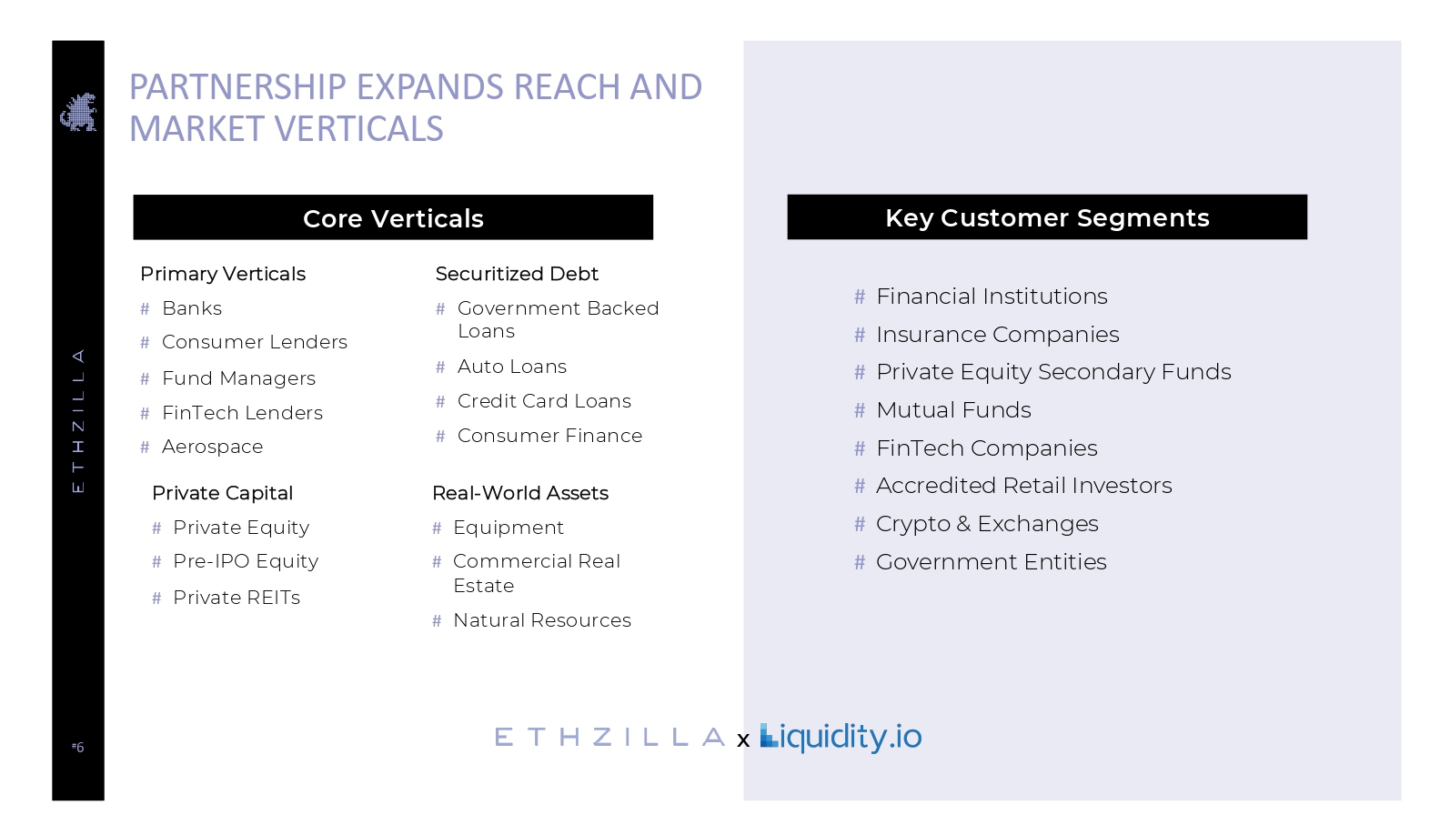 See slide #12 for disclaimers regarding financial projections # 5 STRATEGIC ALIGNMENT WITH ETHZILLA ETH L2 Yield Tokenize Assets List on Liquidity.io ATS L2 Collateral Stablecoin / Deposit - Token Settlement ETHZilla Strategic Flywheel Where Liquidity.io Accelerates ETHZilla : # Distribution & liquidity: An in - house ATS turns ETHZilla’s tokenized assets into tradable, compliant instruments with primary + secondary liquidity. # Institutional onboarding at scale: Removes KYC/KYB friction for funds, banks, and corporates — reducing CAC/time - to - revenue. # Regulatory Compliance: Liquidity.io’s FINRA/SEC status & Transfer Agent role reduce dependence on third parties; dovetails with industry guidance on digital asset securities and ATS operations. # Alignment with ETHZilla roadmap: Matches ETHZilla strategy of ETH + L2 yield + on - chain credit/Real World Assets with compliant rails to list, custody, settle, and distribute tokens to the public.