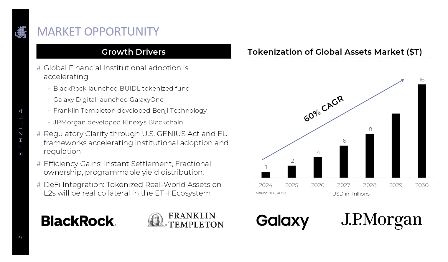 # 6 PARTNERSHIP EXPANDS REACH AND MARKET VERTICALS Primary Verticals # Banks # Consumer Lenders # Fund Managers # FinTech Lenders # Aerospace # Financial Institutions # Insurance Companies # Private Equity Secondary Funds # Mutual Funds # FinTech Companies # Accredited Retail Investors # Crypto & Exchanges # Government Entities Real - World Assets # Equipment # Commercial Real Estate # Natural Resources Securitized Debt # Government Backed Loans # Auto Loans # Credit Card Loans # Consumer Finance Private Capital # Private Equity # Pre - IPO Equity # Private REITs Core Verticals Key Customer Segments X # 7 MARKET OPPORTUNITY 1 2 4 6 8 11 16 2024 2025 2026 2027 2028 2029 2030 # Global Financial Institutional adoption is accelerating + BlackRock launched BUIDL tokenized fund + Galaxy Digital launched GalaxyOne + Franklin Templeton developed Benji Technology + JPMorgan developed Kinexys Blockchain # Regulatory Clarity through U.S. GENIUS Act and EU frameworks accelerating institutional adoption and regulation # Efficiency Gains: Instant Settlement, Fractional ownership, programmable yield distribution. # DeFi Integration: Tokenized Real - World Assets on L2s will be real collateral in the ETH Ecosystem Growth Drivers USD in Trillions Source: BCG, ADDX Tokenization of Global Assets Market ($T)