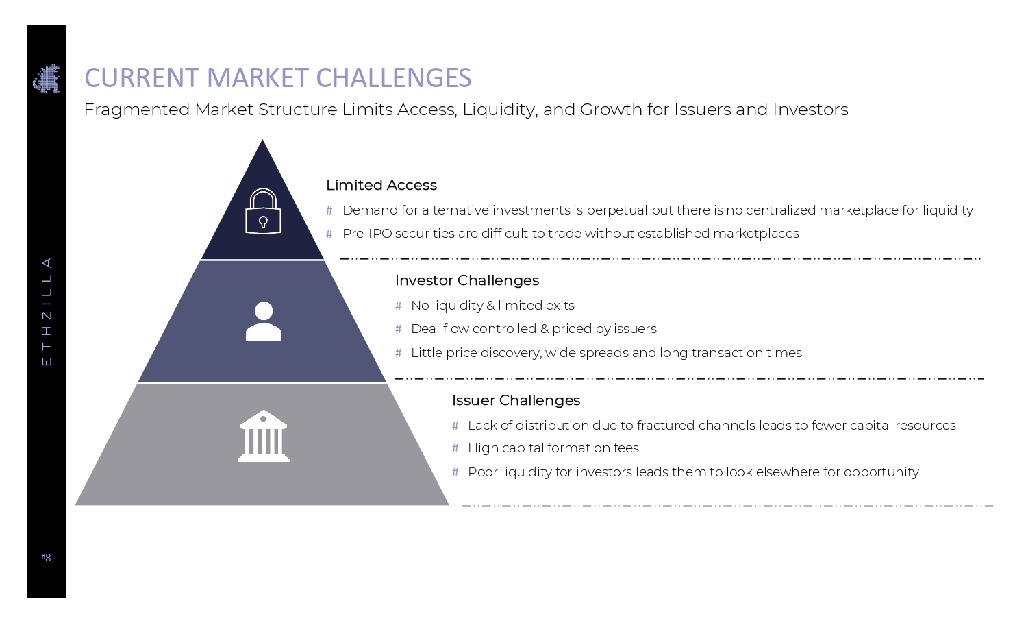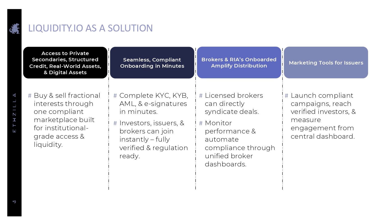 # 8 CURRENT MARKET CHALLENGES Limited Access # Demand for alternative investments is perpetual but there is no centralized marketplace for liquidity # Pre - IPO securities are difficult to trade without established marketplaces Investor Challenges # No liquidity & limited exits # Deal flow controlled & priced by issuers # Little price discovery, wide spreads and long transaction times Issuer Challenges # Lack of distribution due to fractured channels leads to fewer capital resources # High capital formation fees # Poor liquidity for investors leads them to look elsewhere for opportunity Fragmented Market Structure Limits Access, Liquidity, and Growth for Issuers and Investors # 9 LIQUIDITY.IO AS A SOLUTION # Buy & sell fractional interests through one compliant marketplace built for institutional - grade access & liquidity.