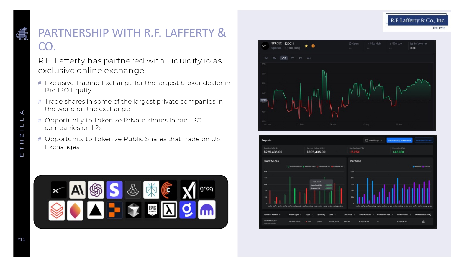Access to Private Secondaries, Structured Credit, Real - World Assets, & Digital Assets Marketing Tools for Issuers Brokers & RIA’s Onboarded Amplify Distribution Seamless, Compliant Onboarding in Minutes # 10 BENEFITS ACROSS STAKEHOLDERS Investor # Better price discovery, lower fees, more liquidity # Expanded offerings # Access to assets normally reserved for institutions # Frictionless onboarding with quick funding Issuer # Global distribution and greater liquidity # No - code APIs digitize into private portfolios into tradeable SPVs within hours # Expansive distribution network # Reduces capital formation fees Investment Bank/Broker # Transaction Slice: Commissions in perpetuity for registered participants who list assets & transact on behalf of clients # 11 PARTNERSHIP WITH R.F. LAFFERTY & CO. R.F. Lafferty has partnered with Liquidity.io as exclusive online exchange # Exclusive Trading Exchange for the largest broker dealer in Pre IPO Equity # Trade shares in some of the largest private companies in the world on the exchange # Opportunity to Tokenize Private shares in pre - IPO companies on L2s # Opportunity to Tokenize Public Shares that trade on US Exchanges