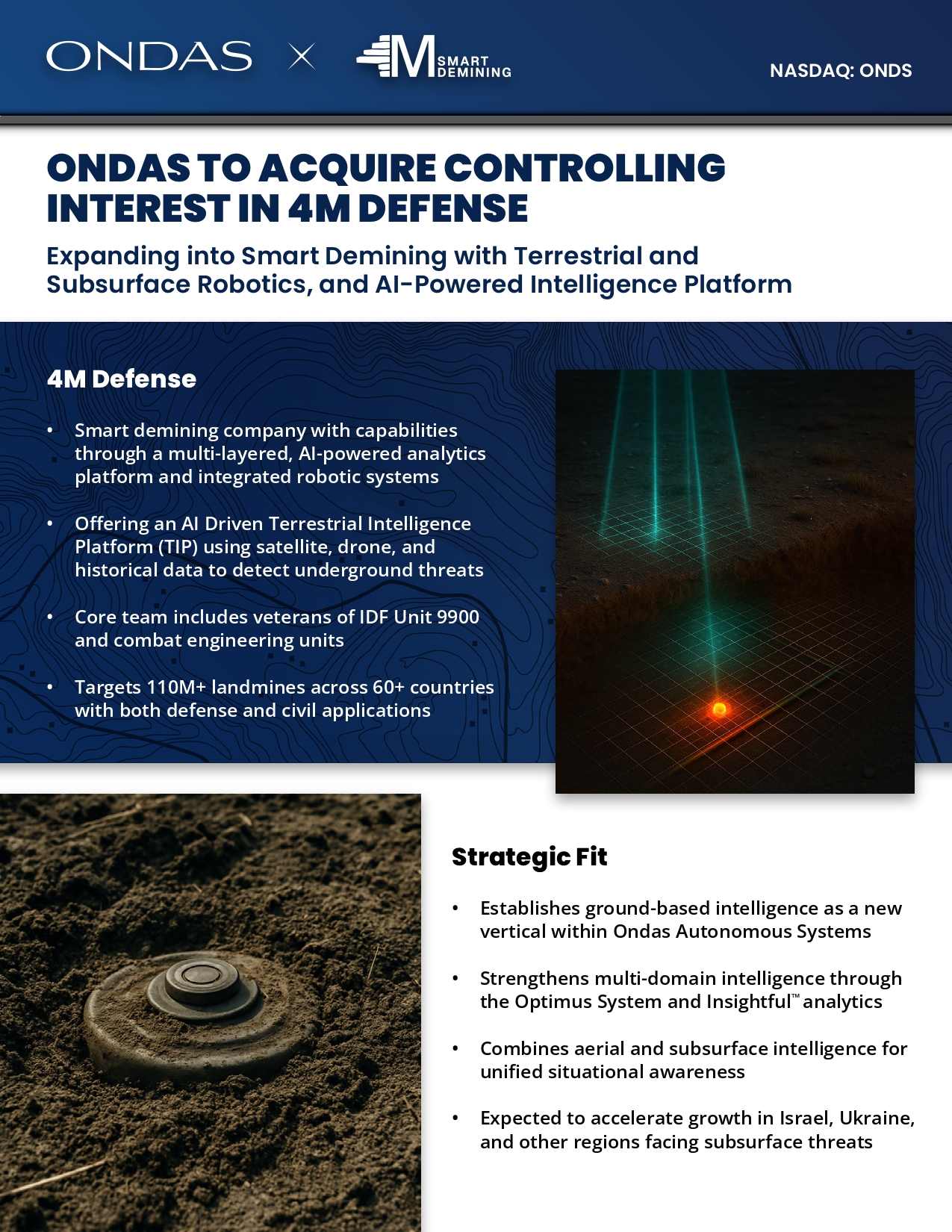 4M Defense • Smart demining company with capabilities through a multi - layered, AI - powered analytics platform and integrated robotic systems • Offering an AI Driven Terrestrial Intelligence Platform (TIP) using satellite, drone, and historical data to detect underground threats • Core team includes veterans of IDF Unit 9900 and combat engineering units • Targets 110M+ landmines across 60+ countries with both defense and civil applications ONDAS TO ACQUIRE CONTROLLING INTEREST IN 4M DEFENSE Expanding into Smart Demining with Terrestrial and Subsurface Robotics, and AI - Powered Intelligence Platform Strategic Fit • Establishes ground - based intelligence as a new vertical within Ondas Autonomous Systems • Strengthens multi - domain intelligence through the Optimus System and Insightful analytics • Combines aerial and subsurface intelligence for unified situational awareness • Expected to accelerate growth in Israel, Ukraine, and other regions facing subsurface threats NASDAQ: ONDS Market Opportunity S10B+ landmine clearance market 1 S20 – S40B subsurface mapping & terrain intelligence market 1 Growth Potential • Expands Ondas Autonomous Systems’ addressable market to include subsurface intelligence and landmine clearance, estimated at over $30B globally 1 • Introduces a subscription - based analytics model through TIP, complementing existing flight services offered by the Optimus System • Enables integrated solutions by combining aerial ISR, terrestrial mapping, and Insightful analytics for broader operational applications • Enhances Ondas’ position in the ISR market as a provider of both aerial and ground - based intelligence solutions, with NDAA - compliant platforms • Establishes a ground intelligence capability that builds on current deployments, supporting long - term growth and revenue stability Offering autonomous robotic operations and AI - powered platforms for detecting UXOs and buried metal threats — safely, accurately, and without exposing personnel to danger.