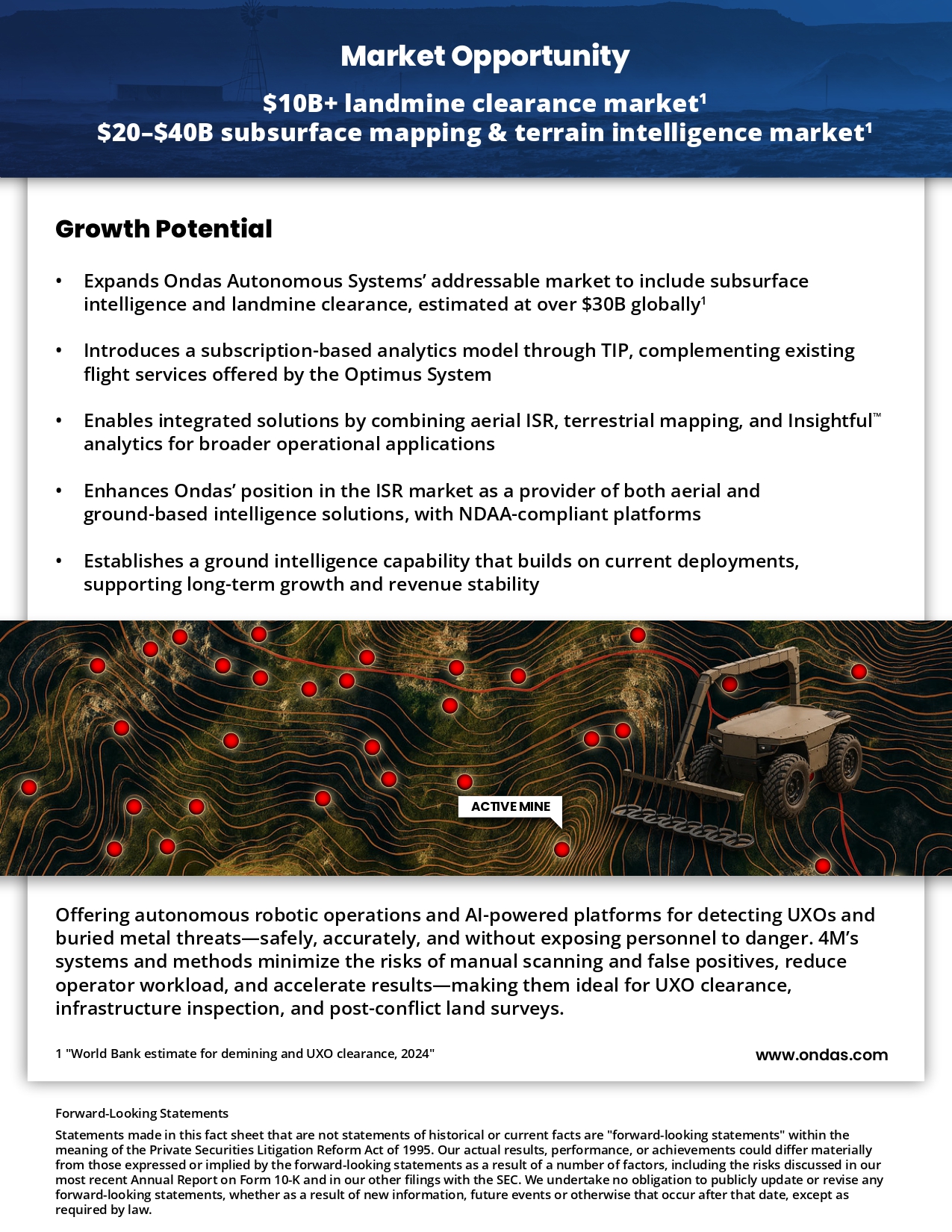 4M’s systems and methods minimize the risks of manual scanning and false positives, reduce operator workload, and accelerate results — making them ideal for UXO clearance, infrastructure inspection, and post - conflict land surveys. 1 "World Bank estimate for demining and UXO clearance, 2024" www.ondas.com ACTIVE MINE Forward - Looking Statements Statements made in this fact sheet that are not statements of historical or current facts are "forward - looking statements" within the meaning of the Private Securities Litigation Reform Act of 1995. Our actual results, performance, or achievements could differ materially from those expressed or implied by the forward - looking statements as a result of a number of factors, including the risks discussed in our most recent Annual Report on Form 10 - K and in our other filings with the SEC. We undertake no obligation to publicly update or revise any forward - looking statements, whether as a result of new information, future events or otherwise that occur after that date, except as required by law.