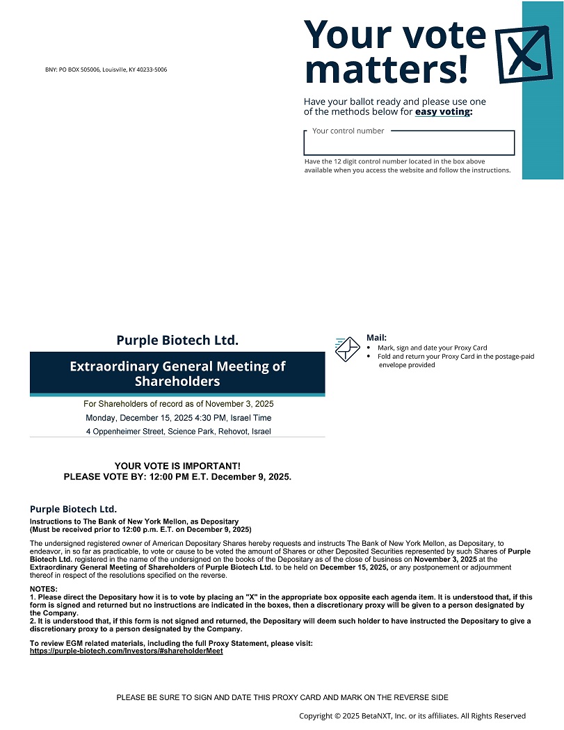 PLEASE BE SURE TO SIGN AND DATE THIS PROXY CARD AND MARK ON THE REVERSE SIDE Copyright © 2025 BetaNXT, Inc. or its affiliates. All Rights Reserved Purple Biotech Ltd. Extraordinary General Meeting of Shareholders For Shareholders of record as of November 3 , 2025 Monday, December 15 , 2025 4 : 30 PM, Israel Time 4 Oppenheimer Street, Science Park, Rehovot, Israel YOUR VOTE IS IMPORTANT! PLEASE VOTE BY: 12:00 PM E.T. December 9, 2025. Purple Biotech Ltd. Instructions to The Bank of New York Mellon, as Depositary (Must be received prior to 12:00 p.m. E.T. on December 9, 2025) The undersigned registered owner of American Depositary Shares hereby requests and instructs The Bank of New York Mellon, as Depositary, to endeavor, in so far as practicable, to vote or cause to be voted the amount of Shares or other Deposited Securities represented by such Shares of Purple Biotech Ltd. registered in the name of the undersigned on the books of the Depositary as of the close of business on November 3, 2025 at the Extraordinary General Meeting of Shareholders of Purple Biotech Ltd. to be held on December 15, 2025, or any postponement or adjournment thereof in respect of the resolutions specified on the reverse. NOTES: 1. Please direct the Depositary how it is to vote by placing an "X" in the appropriate box opposite each agenda item. It is understood that, if this form is signed and returned but no instructions are indicated in the boxes, then a discretionary proxy will be given to a person designated by the Company. 2. It is understood that, if this form is not signed and returned, the Depositary will deem such holder to have instructed the Depositary to give a discretionary proxy to a person designated by the Company. To review EGM related materials, including the full Proxy Statement, please visit: https://purple - biotech.com/Investors/#shareholderMeet BNY: PO BOX 505006, Louisville, KY 40233 - 5006 Mail: • Mark, sign and date your Proxy Card • Fold and return your Proxy Card in the postage - paid envelope provided Your vote matters! Have your ballot ready and please use one of the methods below for easy voting : Your control number Have the 12 digit control number located in the box above available when you access the website and follow the instructions.