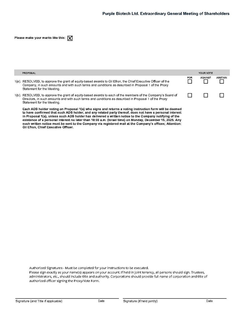 Purple Biotech Ltd. Extraordinary General Meeting of Shareholders Please make your marks like this: PROPOSAL YOUR VOTE FOR AGAINST ABSTAIN (a) RESOLVED, to approve the grant of equity - based awards to Gil Efron, the Chief Executive Officer of the Company, in such amounts and with such terms and conditions as described in Proposal 1 of the Proxy Statement for the Meeting. (b) RESOLVED, to approve the grant of equity - based awards to each of the members of the Company's Board of Directors, in such amounts and with such terms and conditions as described in Proposal 1 of the Proxy Statement for the Meeting. Each ADS holder voting on Proposal 1(a) who signs and returns a voting instruction form will be deemed to have confirmed that such ADS holder, and any related party thereof, does not have a personal interest in Proposal 1(a), unless such ADS holder has delivered a written notice to the Company notifying of the existence of a personal interest no later than 10:00 a.m. (Israel time) on Monday, December 15, 2025. Any such written notice must be sent to the Company via registered mail at the Company's offices; Attention: Gil Efron, Chief Executive Officer. Authorized Signatures - Must be completed for your instructions to be executed. Please sign exactly as your name(s) appears on your account. If held in joint tenancy, all persons should sign. Trustees, administrators, etc., should include title and authority. Corporations should provide full name of corporation and title of authorized officer signing the Proxy/Vote Form. Signature (and Title if applicable) Date Date Signature (if held jointly)