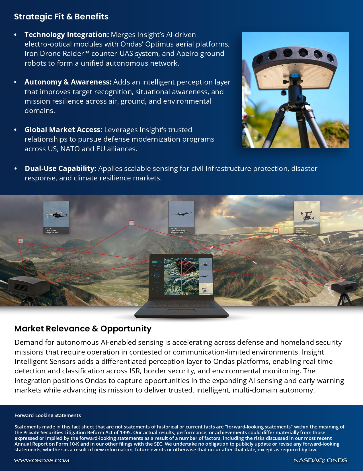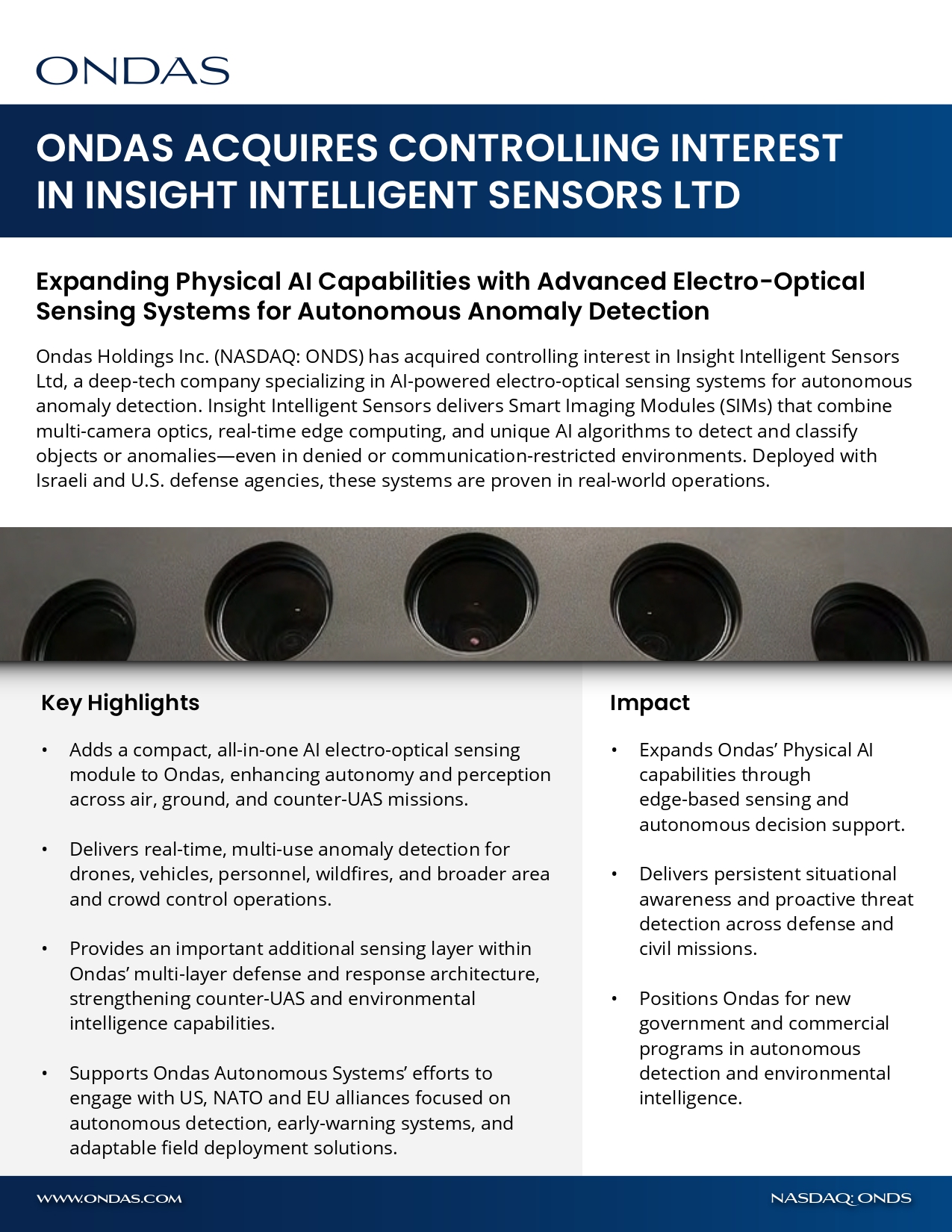 BOSTON, MA / October 29, 2025 / Ondas Holdings Inc. (Nasdaq: ONDS) (“Ondas” or the “Company”), a leading provider of autonomous aerial and ground robot intelligence through its Ondas Autonomous Systems (OAS) business unit and private wireless solutions through Ondas Networks, today announced the acquisition of a controlling interest in Insight Intelligent Sensors, an Israeli developer of AI-driven electro-optical sensing systems.