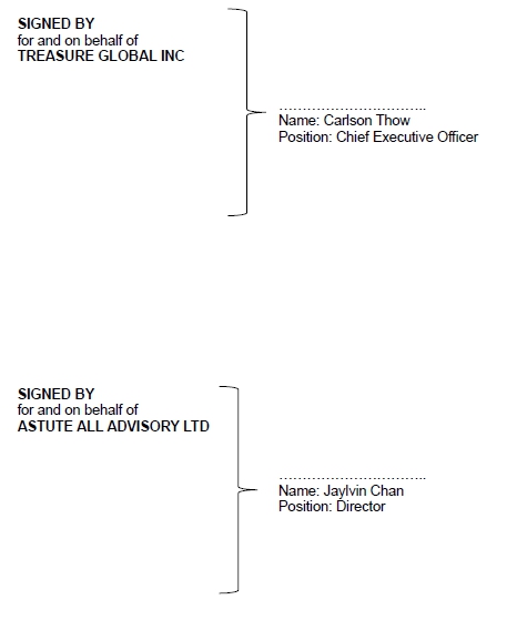 AN AGREEMENT is made on this date and year more particularly described in Section 1 of the Schedule (“the Agreement Date”) between TREASURE GLOBAL INC (Delaware Department of State’s File No. 7908921) a company incorporate in Delaware, of the one part and having its address for service at 276, 5th Avenue Suite, 704 #739 New York, NY10001 and the party whose name and particularly described in Section 2 of the Schedule (“the Service Provider”) of the other part. The Company and Service Provider are hereinafter individually referred to as “Party” and collectively referred to as “the Parties”.