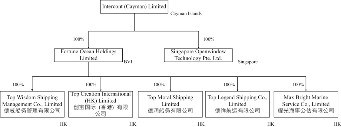 | ● | “Shipping Subsidiaries” or “Hong Kong Subsidiaries” refers to Top Wisdom Shipping Management Co., Limited, a Hong Kong company formed on February 1, 2013 (“Top Wisdom”), Top Creation International (HK) Limited, a Hong Kong company formed on July 29, 2011 (“Top Creation”), Top Moral Shipping Limited, a Hong Kong company formed on December 12, 2013 (“Top Moral”), Top Legend Shipping Co., Limited, a Hong Kong company formed on March 6, 2013 (“Top Legend”), and Max Bright Marine Service Co., Limited, a Hong Kong company formed on April 2, 2014 (“Max Bright”); |