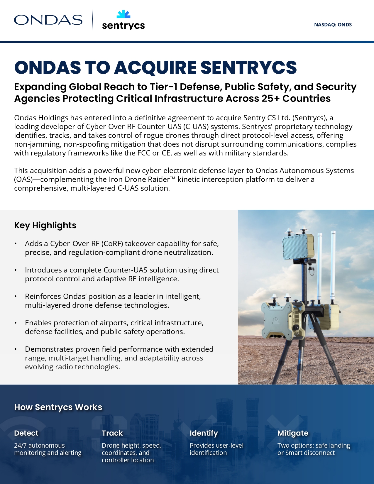 NASDAQ: ONDS Expanding Global Reach to Tier - 1 Defense, Public Safety, and Security Agencies Protecting Critical Infrastructure Across 25+ Countries Ondas Holdings has entered into a definitive agreement to acquire Sentry CS Ltd. (Sentrycs), a leading developer of Cyber - Over - RF Counter - UAS (C - UAS) systems. Sentrycs’ proprietary technology identifies, tracks, and takes control of rogue drones through direct protocol - level access, offering non - jamming, non - spoofing mitigation that does not disrupt surrounding communications, complies with regulatory frameworks like the FCC or CE, as well as with military standards. This acquisition adds a powerful new cyber - electronic defense layer to Ondas Autonomous Systems (OAS) — complementing the Iron Drone Raider kinetic interception platform to deliver a comprehensive, multi - layered C - UAS solution. ONDAS TO ACQUIRE SENTRYCS Key Highlights • Adds a Cyber - Over - RF (CoRF) takeover capability for safe, precise, and regulation - compliant drone neutralization. • Introduces a complete Counter - UAS solution using direct protocol control and adaptive RF intelligence. • Reinforces Ondas’ position as a leader in intelligent, multi - layered drone defense technologies. • Enables protection of airports, critical infrastructure, defense facilities, and public - safety operations. • Demonstrates proven field performance with extended range, multi - target handling, and adaptability across evolving radio technologies. How Sentrycs Works Detect 24/7 autonomous monitoring and alerting Track Drone height, speed, coordinates, and controller location Identify Provides user - level identification Mitigate Two options: safe landing or Smart disconnect