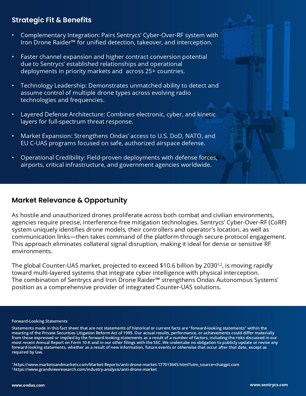 Forward - Looking Statements Statements made in this fact sheet that are not statements of historical or current facts are "forward - looking statements" within the meaning of the Private Securities Litigation Reform Act of 1995. Our actual results, performance, or achievements could differ materially from those expressed or implied by the forward - looking statements as a result of a number of factors, including the risks discussed in our most recent Annual Report on Form 10 - K and in our other filings with the SEC. We undertake no obligation to publicly update or revise any forward - looking statements, whether as a result of new information, future events or otherwise that occur after that date, except as required by law. 1 https://www.marketsandmarkets.com/Market - Reports/anti - drone - market - 177013645.html?utm_source=chatgpt.com 2 https://www.grandviewresearch.com/industry - analysis/anti - drone - market www.sentrycs.com Market Relevance & Opportunity As hostile and unauthorized drones proliferate across both combat and civilian environments, agencies require precise, interference - free mitigation technologies. Sentrycs’ Cyber - Over - RF (CoRF) system uniquely identifies drone models, their controllers and operator's location, as well as communication links — then takes command of the platform through secure protocol engagement. This approach eliminates collateral signal disruption, making it ideal for dense or sensitive RF environments. The global Counter - UAS market, projected to exceed $10.6 billion by 2030 1,2 , is moving rapidly toward multi - layered systems that integrate cyber intelligence with physical interception. The combination of Sentrycs and Iron Drone Raider strengthens Ondas Autonomous Systems’ position as a comprehensive provider of integrated Counter - UAS solutions. Strategic Fit & Benefits • Complementary Integration: Pairs Sentrycs’ Cyber - Over - RF system with Iron Drone Raider for unified detection, takeover, and interception. • Faster channel expansion and higher contract conversion potential due to Sentrycs’ established relationships and operational deployments in priority markets and across 25+ countries. • Technology Leadership: Demonstrates unmatched ability to detect and assume control of multiple drone types across evolving radio technologies and frequencies. • Layered Defense Architecture: Combines electronic, cyber, and kinetic layers for full - spectrum threat response. • Market Expansion: Strengthens Ondas’ access to U.S. DoD, NATO, and EU C - UAS programs focused on safe, authorized airspace defense. • Operational Credibility: Field - proven deployments with defense forces, airports, critical infrastructure, and government agencies worldwide. www.ondas.com