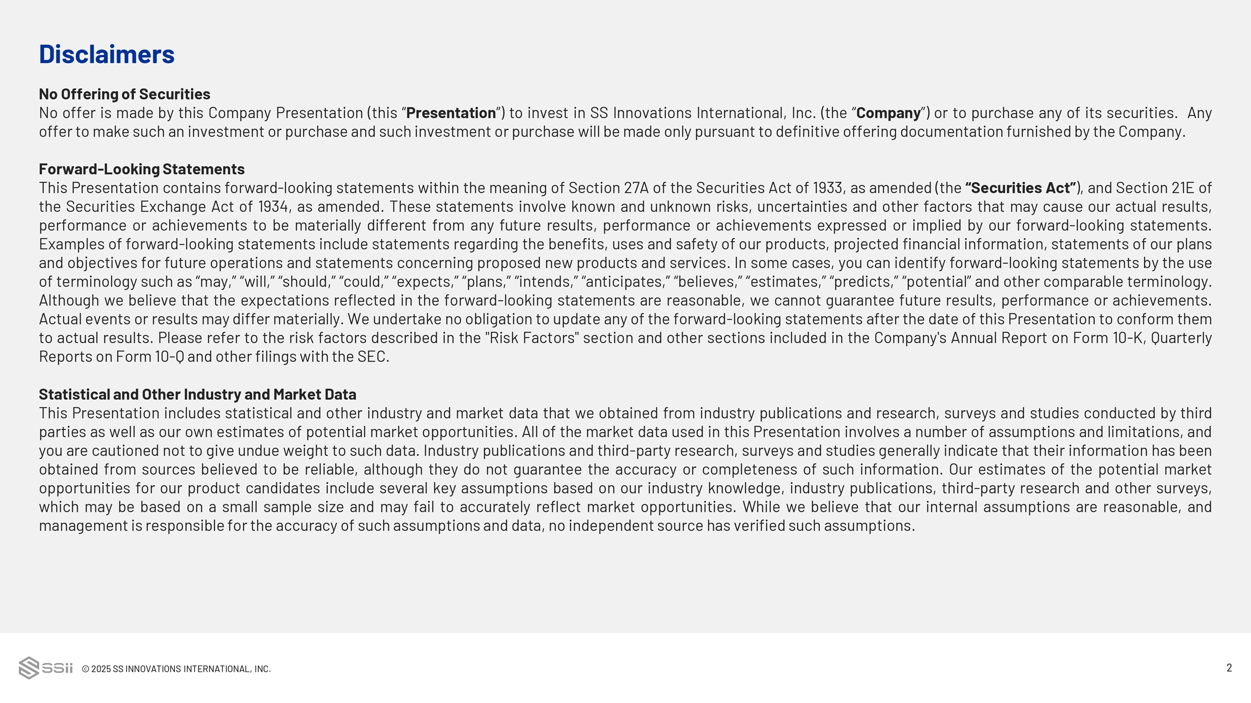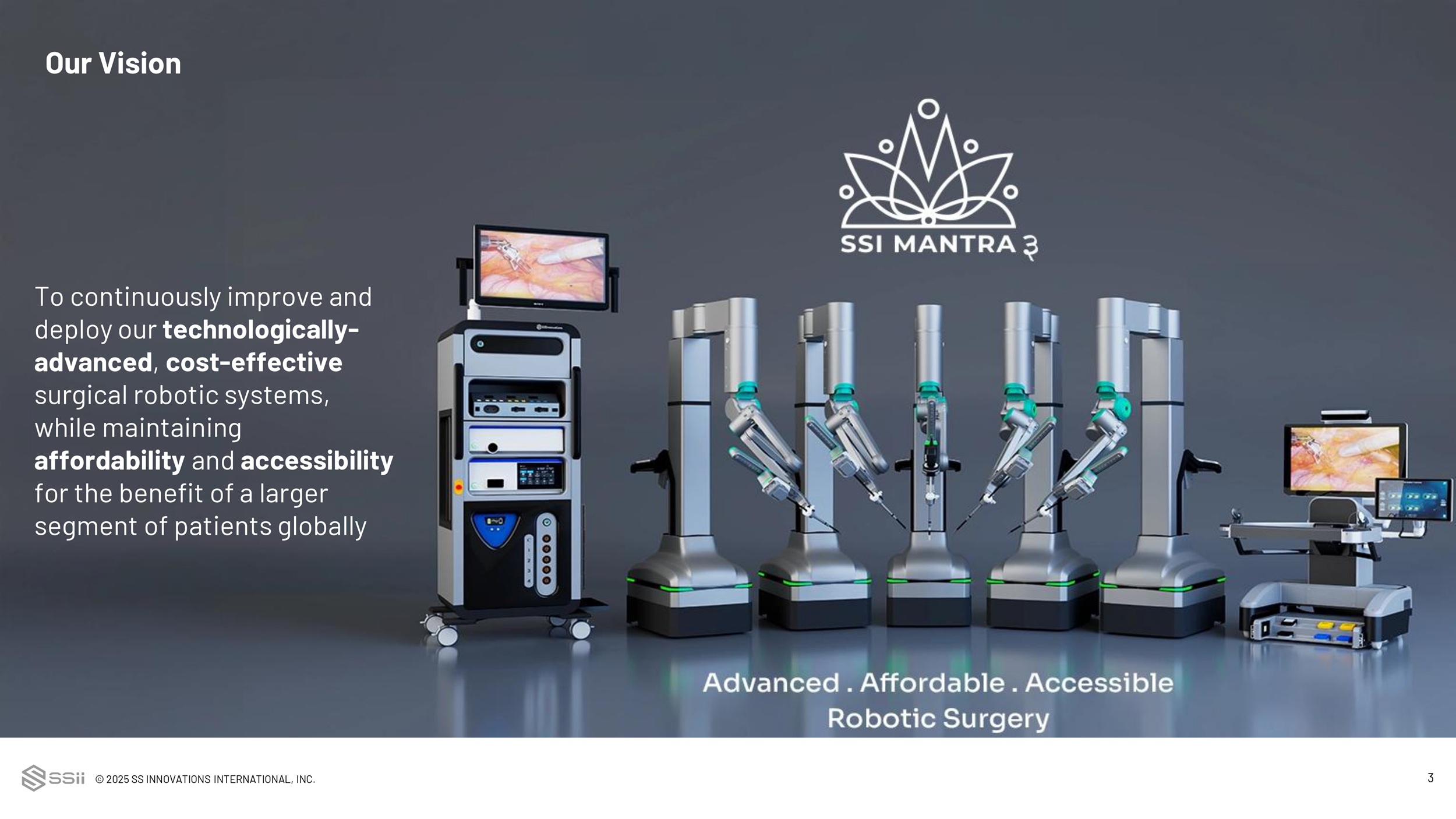 Company Presentation November 2025 Nasdaq: SSII © 2025 SS INNOVATIONS INTERNATIONAL, INC. 2 No Offering of Securities No offer is made by this Company Presentation (this “ Presentation ”) to invest in SS Innovations International, Inc . (the “ Company ”) or to purchase any of its securities . Any offer to make such an investment or purchase and such investment or purchase will be made only pursuant to definitive offering documentation furnished by the Company . Forward - Looking Statements This Presentation contains forward - looking statements within the meaning of Section 27 A of the Securities Act of 1933 , as amended (the “Securities Act” ), and Section 21 E of the Securities Exchange Act of 1934 , as amended . These statements involve known and unknown risks, uncertainties and other factors that may cause our actual results, performance or achievements to be materially different from any future results, performance or achievements expressed or implied by our forward - looking statements . Examples of forward - looking statements include statements regarding the benefits, uses and safety of our products, projected financial information, statements of our plans and objectives for future operations and statements concerning proposed new products and services . In some cases, you can identify forward - looking statements by the use of terminology such as “may,” “will,” “should,” “could,” “expects,” “plans,” “intends,” “anticipates,” “believes,” “estimates,” “predicts,” “potential” and other comparable terminology . Although we believe that the expectations reflected in the forward - looking statements are reasonable, we cannot guarantee future results, performance or achievements . Actual events or results may differ materially . We undertake no obligation to update any of the forward - looking statements after the date of this Presentation to conform them to actual results . Please refer to the risk factors described in the "Risk Factors" section and other sections included in the Company's Annual Report on Form 10 - K, Quarterly Reports on Form 10 - Q and other filings with the SEC . Statistical and Other Industry and Market Data This Presentation includes statistical and other industry and market data that we obtained from industry publications and research, surveys and studies conducted by third parties as well as our own estimates of potential market opportunities . All of the market data used in this Presentation involves a number of assumptions and limitations, and you are cautioned not to give undue weight to such data . Industry publications and third - party research, surveys and studies generally indicate that their information has been obtained from sources believed to be reliable, although they do not guarantee the accuracy or completeness of such information . Our estimates of the potential market opportunities for our product candidates include several key assumptions based on our industry knowledge, industry publications, third - party research and other surveys, which may be based on a small sample size and may fail to accurately reflect market opportunities . While we believe that our internal assumptions are reasonable, and management is responsible for the accuracy of such assumptions and data, no independent source has verified such assumptions .