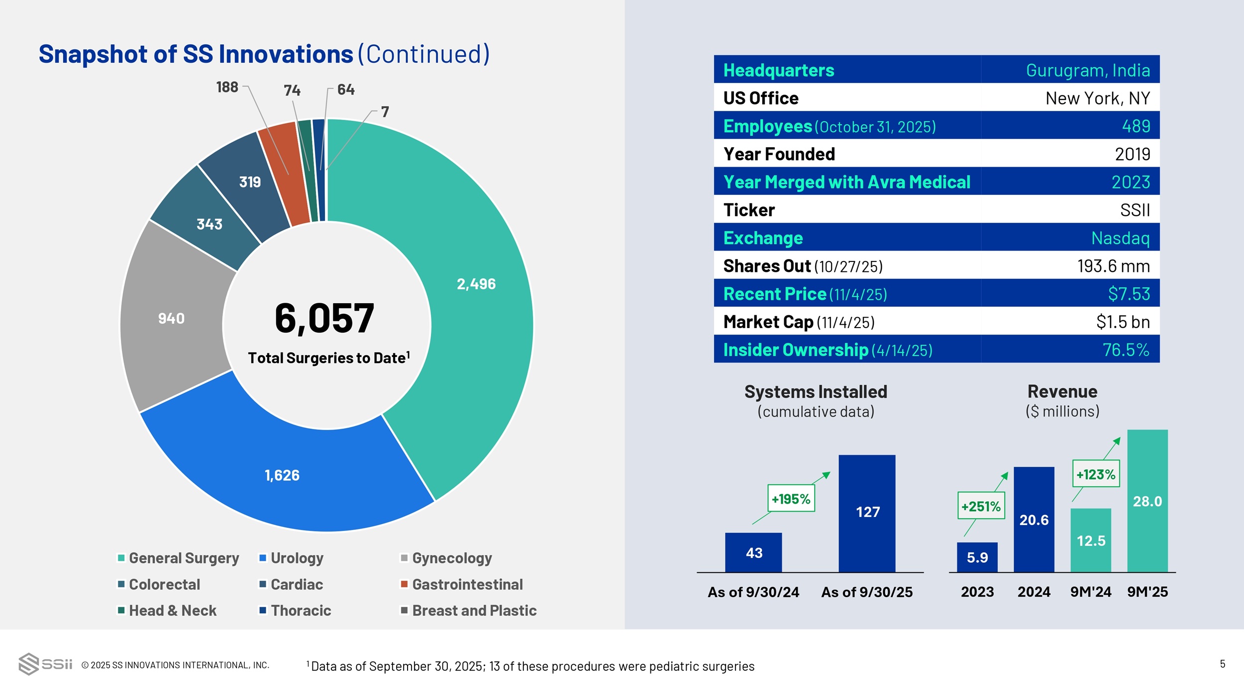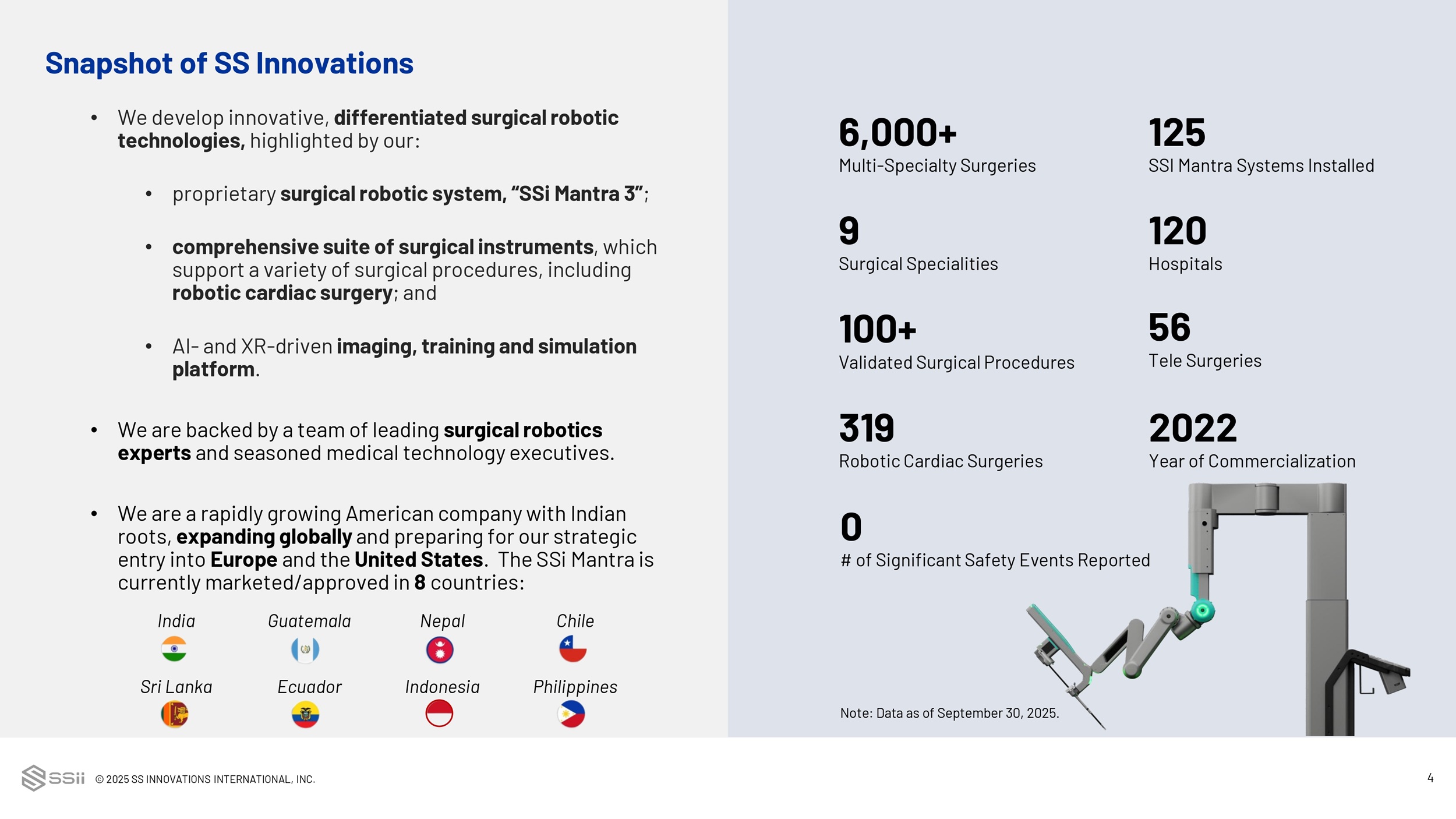 3 Our Vision To continuously improve and deploy our technologically - advanced , cost - effective surgical robotic systems, while maintaining affordability and accessibility for the benefit of a larger segment of patients globally © 2025 SS INNOVATIONS INTERNATIONAL, INC. 4 Snapshot of SS Innovations • We develop innovative, differentiated surgical robotic technologies, highlighted by our: • proprietary surgical robotic system, “SSi Mantra 3” ; • comprehensive suite of surgical instruments , which support a variety of surgical procedures, including robotic cardiac surgery ; and • AI - and XR - driven imaging, training and simulation platform . • We are backed by a team of leading surgical robotics experts and seasoned medical technology executives. • We are a rapidly growing American company with Indian roots, expanding globally and preparing for our strategic entry into Europe and the United States . The SSi Mantra is currently marketed/approved in 8 countries: 6,000+ Multi - Specialty Surgeries 125 SSI Mantra Systems Installed 120 Hospitals 100+ Validated Surgical Procedures 9 Surgical Specialities 319 Robotic Cardiac Surgeries 56 Tele Surgeries 0 # of Significant Safety Events Reported Note: Data as of September 30, 2025.