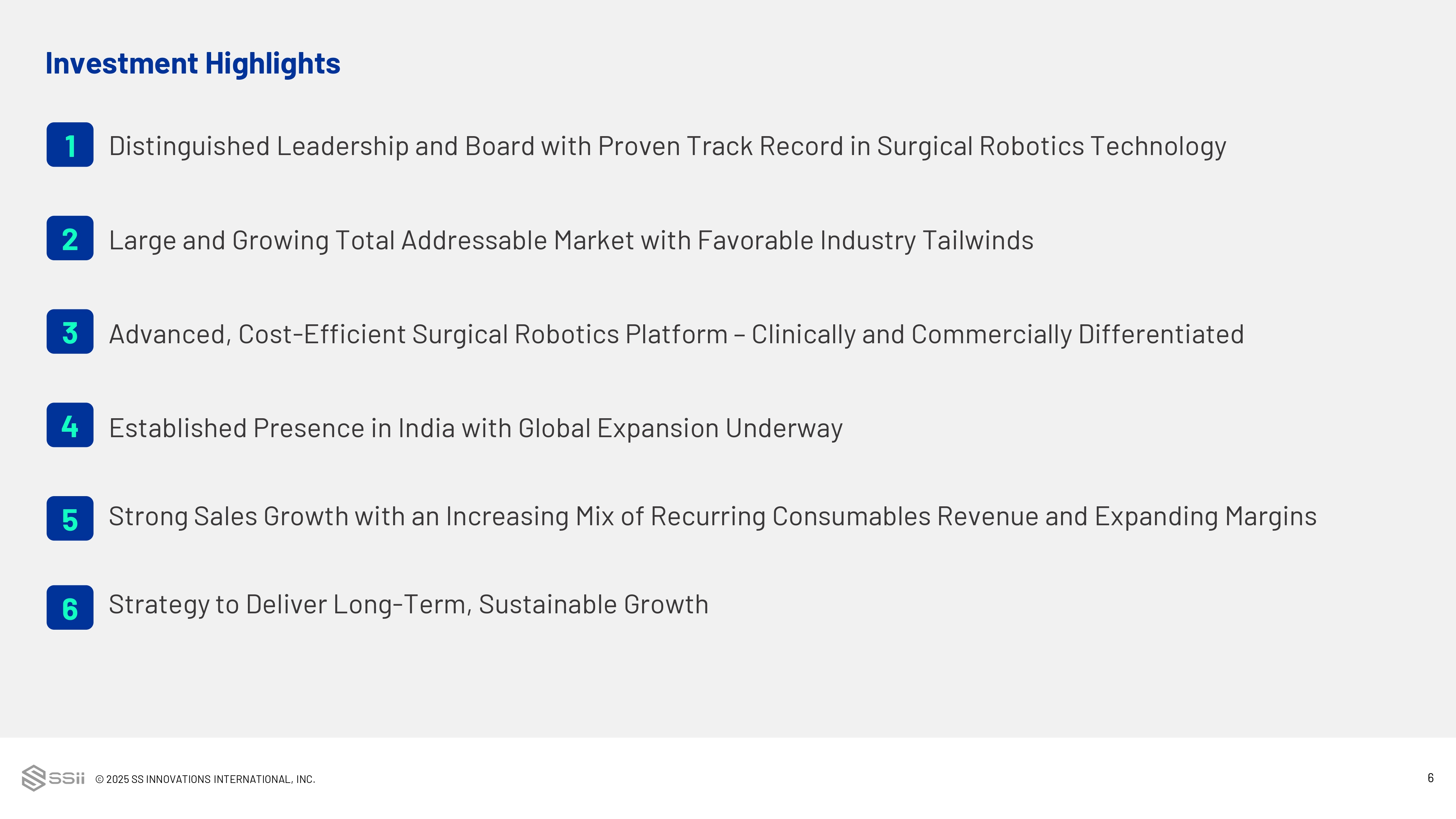 2022 Year of Commercialization Chile Nepal Guatemala India Philippines Indonesia Ecuador Sri Lanka © 2025 SS INNOVATIONS INTERNATIONAL, INC. 5 Snapshot of SS Innovations (Continued) Gurugram, India Headquarters New York, NY US Office 489 Employees (October 31, 2025) 2019 Year Founded 2023 Year Merged with Avra Medical SSII Ticker Nasdaq Exchange 193.6 mm Shares Out (10/27/25) $7.53 Recent Price (11/4/25) $1.5 bn Market Cap (11/4/25) 76.5% Insider Ownership (4/14/25) 2,496 1,626 940 343 319 188 74 64 7 General Surgery Urology Gynecology Colorectal Cardiac Gastrointestinal Head & Neck Thoracic Breast and Plastic 6,057 Total Surgeries to Date 1 1 Data as of September 30, 2025; 13 of these procedures were pediatric surgeries 43 127 As of 9/30/24 As of 9/30/25 Systems Installed (cumulative data) 5.9 20.6 12.5 28.0 2023 2024 9M'24 9M'25 Revenue ($ millions) +195% +251% +123% © 2025 SS INNOVATIONS INTERNATIONAL, INC. 6 • Distinguished Leadership and Board with Proven Track Record in Surgical Robotics Technology • Large and Growing Total Addressable Market with Favorable Industry Tailwinds • Advanced, Cost - Efficient Surgical Robotics Platform – Clinically and Commercially Differentiated • Established Presence in India with Global Expansion Underway • Strong Sales Growth with an Increasing Mix of Recurring Consumables Revenue and Expanding Margins • Strategy to Deliver Long - Term, Sustainable Growth 1 2 3 4 5 Investment Highlights 6