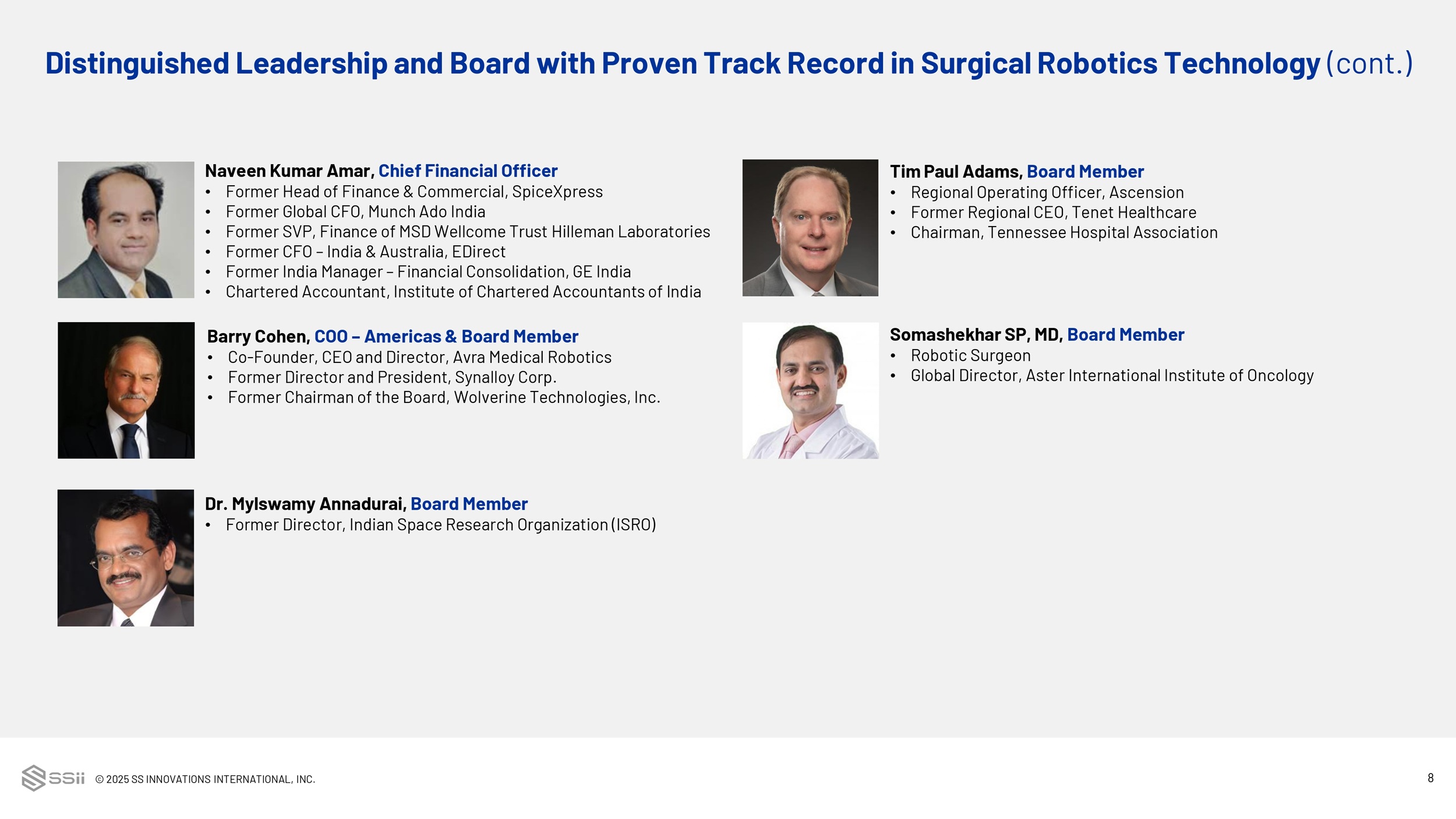 © 2025 SS INNOVATIONS INTERNATIONAL, INC. 7 Sudhir Srivastava, MD, Founder, Chairman & CEO • Robotic Cardiac Surgeon • Pioneered many of the world’s first robotic cardiac procedures • 40+ years of surgical experience • Performed numerous robotic cardiac surgeries and trained surgical teams worldwide • University of British Columbia, University of Chicago, Alliance Hospital • Owns 117,158,445 shares, or 58.9% of SSII shares outstanding 1 Frederic Moll, MD, Vice - Chairman • Former Chief Development Officer, J&J Medical Devices • Founder, Intuitive Surgical, Hansen Medical, Auris Health • Co - Founder & Partner, Sonder Capital Management • Board Member, PROCEPT BioRobotics, Neptune Medical, Moon Surgical • Former Board Member, Shockwave Medical, Restoration Robotics, Intersect ENT • Widely regarded as the “Father of Surgical Robotics” • Owns 20,335,045 shares, or 10.2% of SSII shares outstanding 1 Vishwajyoti Srivastava, MD, Chief Executive Officer, APAC & Board Member • Led the development of the OMNI 3D Medical Visualization system • Serves as the President of OMNI 3D HD to advance the existing technological platform for availability in the global surgical and endoscopic marketplace • Previously served as the VP of Marketing and Technology at the International Centre for Robotic Surgery in New Delhi • Columbia University, Saint James School of Medicine Distinguished Leadership and Board with Proven Track Record in Surgical Robotics Technology 1 As of 4/14/2025 © 2025 SS INNOVATIONS INTERNATIONAL, INC. 8 Distinguished Leadership and Board with Proven Track Record in Surgical Robotics Technology (cont.) Naveen Kumar Amar , Chief Financial Officer • Former Head of Finance & Commercial, SpiceXpress • Former Global CFO, Munch Ado India • Former SVP, Finance of MSD Wellcome Trust Hilleman Laboratories • Former CFO – India & Australia, EDirect • Former India Manager – Financial Consolidation, GE India • Chartered Accountant, Institute of Chartered Accountants of India Barry Cohen, COO – Americas & Board Member • Co - Founder, CEO and Director, Avra Medical Robotics • Former Director and President, Synalloy Corp. • Former Chairman of the Board, Wolverine Technologies, Inc. Tim Paul Adams, Board Member • Regional Operating Officer, Ascension • Former Regional CEO, Tenet Healthcare • Chairman, Tennessee Hospital Association Somashekhar SP, MD, Board Member • Robotic Surgeon • Global Director, Aster International Institute of Oncology Dr. Mylswamy Annadurai, Board Member • Former Director, Indian Space Research Organization (ISRO)