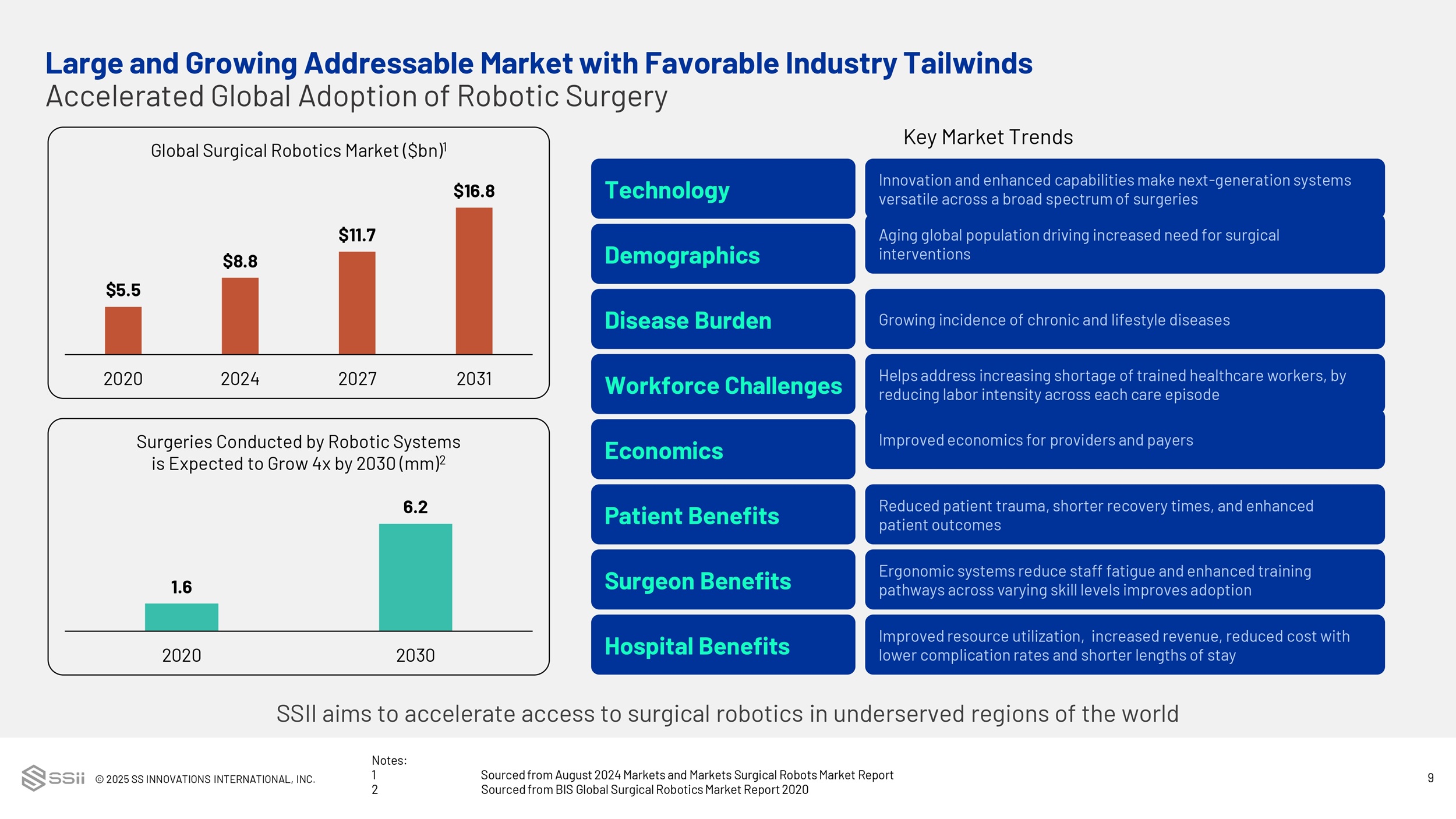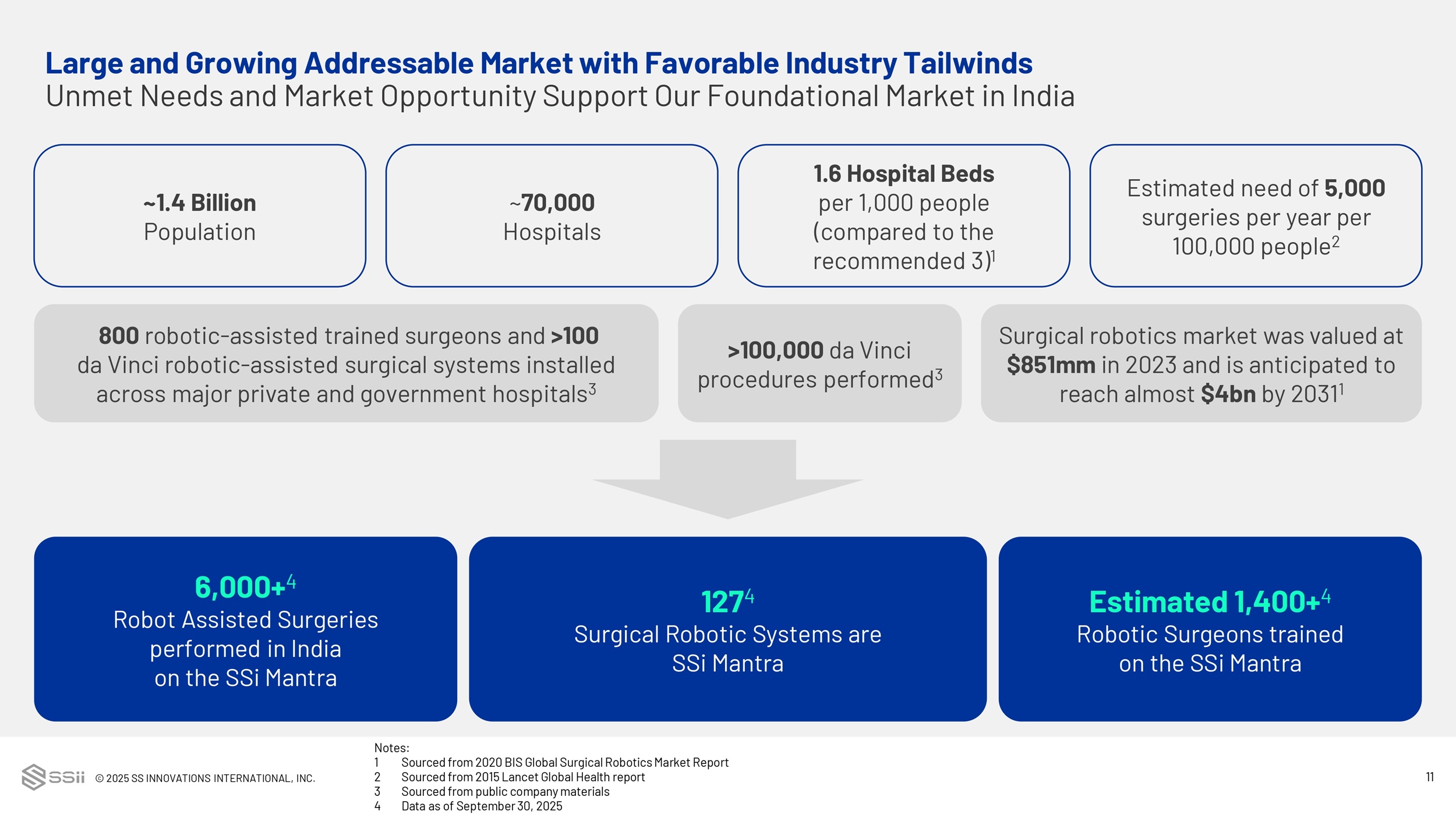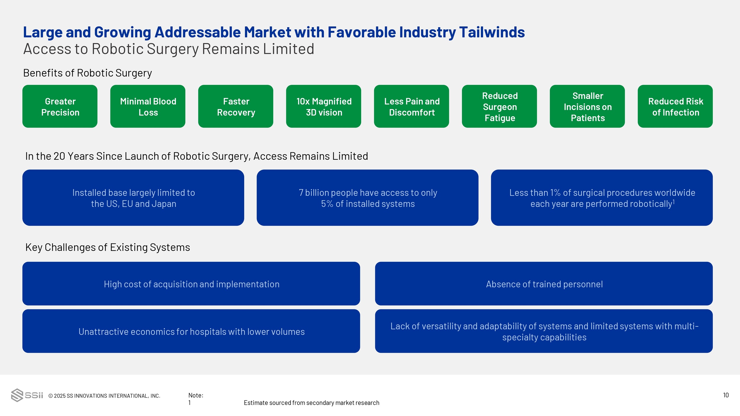 © 2025 SS INNOVATIONS INTERNATIONAL, INC. 9 Demographics Disease Burden Workforce Challenges Economics Patient Benefits Surgeon Benefits Improved resource utilization, increased revenue, reduced cost with lower complication rates and shorter lengths of stay $5.5 $8.8 $11.7 $16.8 2020 2024 2027 2031 Global Surgical Robotics Market ($bn) 1 1.6 6.2 2020 2030 Surgeries Conducted by Robotic Systems is Expected to Grow 4x by 2030 (mm) 2 SSII aims to accelerate access to surgical robotics in underserved regions of the world Key Market Trends Technology Innovation and enhanced capabilities make next - generation systems versatile across a broad spectrum of surgeries Aging global population driving increased need for surgical interventions Growing incidence of chronic and lifestyle diseases Helps address increasing shortage of trained healthcare workers, by reducing labor intensity across each care episode Improved economics for providers and payers Reduced patient trauma, shorter recovery times, and enhanced patient outcomes Ergonomic systems reduce staff fatigue and enhanced training pathways across varying skill levels improves adoption Hospital Benefits Notes: 1 Sourced from August 2024 Markets and Markets Surgical Robots Market Report 2 Sourced from BIS Global Surgical Robotics Market Report 2020 Large and Growing Addressable Market with Favorable Industry Tailwinds Accelerated Global Adoption of Robotic Surgery © 2025 SS INNOVATIONS INTERNATIONAL, INC. 10 Benefits of Robotic Surgery In the 20 Years Since Launch of Robotic Surgery, Access Remains Limited Installed base largely limited to the US, EU and Japan 7 billion people have access to only 5% of installed systems Less than 1% of surgical procedures worldwide each year are performed robotically 1 Key Challenges of Existing Systems High cost of acquisition and implementation Unattractive economics for hospitals with lower volumes Absence of trained personnel Lack of versatility and adaptability of systems and limited systems with multi - specialty capabilities Greater Precision Minimal Blood Loss Faster Recovery 10x Magnified 3D vision Less Pain and Discomfort Reduced Surgeon Fatigue Smaller Incisions on Patients Reduced Risk of Infection Note: 1 Estimate sourced from secondary market research Large and Growing Addressable Market with Favorable Industry Tailwinds Access to Robotic Surgery Remains Limited