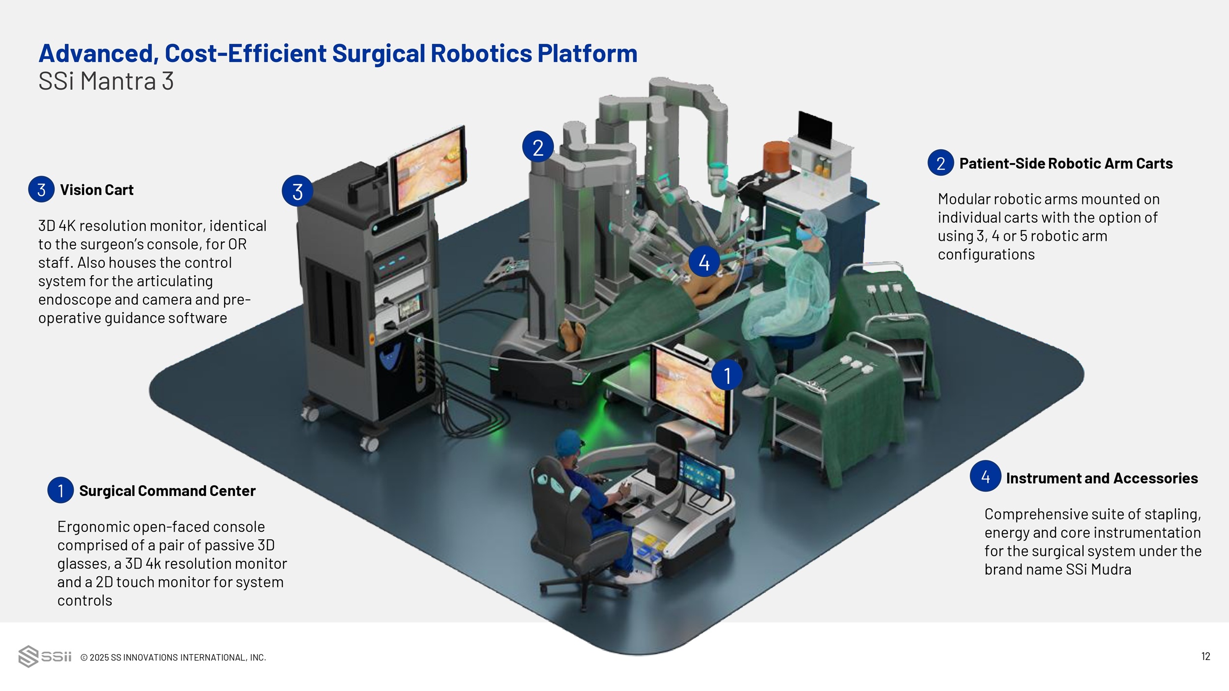 © 2025 SS INNOVATIONS INTERNATIONAL, INC. 11 ~ 70,000 Hospitals 1.6 Hospital Beds per 1,000 people (compared to the recommended 3) 1 Estimated need of 5,000 surgeries per year per 100,000 people 2 ~1.4 Billion Population 127 4 Surgical Robotic Systems are SSi Mantra 6,000+ 4 Robot Assisted Surgeries performed in India on the SSi Mantra Estimated 1,400+ 4 Robotic Surgeons trained on the SSi Mantra Notes: 1 Sourced from 2020 BIS Global Surgical Robotics Market Report 2 Sourced from 2015 Lancet Global Health report 3 Sourced from public company materials 4 Data as of September 30, 2025 800 robotic - assisted trained surgeons and >100 da Vinci robotic - assisted surgical systems installed across major private and government hospitals 3 >100,000 da Vinci procedures performed 3 Surgical robotics market was valued at $851mm in 2023 and is anticipated to reach almost $4bn by 2031 1 Large and Growing Addressable Market with Favorable Industry Tailwinds Unmet Needs and Market Opportunity Support Our Foundational Market in India © 2025 SS INNOVATIONS INTERNATIONAL, INC. 12 Advanced, Cost - Efficient Surgical Robotics Platform SSi Mantra 3 1 2 3 1 Surgical Command Center Ergonomic open - faced console comprised of a pair of passive 3D glasses, a 3D 4k resolution monitor and a 2D touch monitor for system controls 2 Patient - Side Robotic Arm Carts Modular robotic arms mounted on individual carts with the option of using 3, 4 or 5 robotic arm configurations 3 Vision Cart 3D 4K resolution monitor, identical to the surgeon’s console, for OR staff. Also houses the control system for the articulating endoscope and camera and pre - operative guidance software 4 Instrument and Accessories Comprehensive suite of stapling, energy and core instrumentation for the surgical system under the brand name SSi Mudra 4