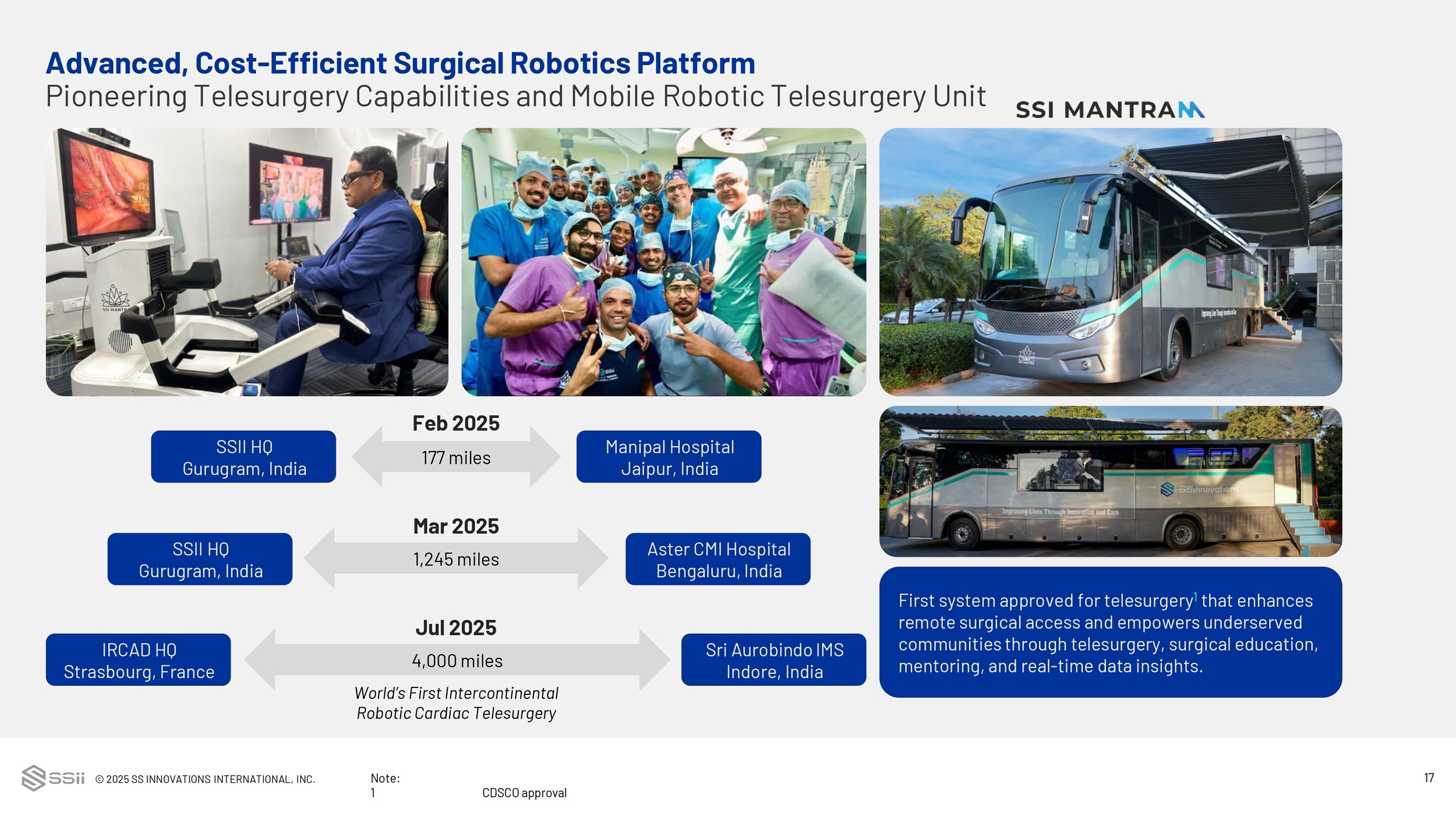 1 1 © 2025 SS INNOVATIONS INTERNATIONAL, INC. 16 Advanced, Cost - Efficient Surgical Robotics Platform SSi Maya – Enhancing Surgical Capabilities with Mixed Reality and AI Enabled Technologies SSi Guru XR Tele Proctoring System • Mixed Reality Headset • Portable 3D Surgery Viewer • Interactive Virtual Screens • CDSCO Approved • Virtual Tele Illustration Feature • Proctored over 1,200 miles under 400 ms latency AR Smart Glasses 1 3D Visualization System • 3D HD 1080p vision • Variable IPD adjustments • Direct from endoscope video signal processing • IMU based head tracking Cognitive Skill Simulator 1 A different approach to train surgeons • Overlaid instruments tracking • Guided procedure steps • Trains cognition and muscle memory • Enhancing motor skills through repetition • Console and VR based learning system Mixed reality - powered and AI - enabled technologies for better training, visualization, and simulation for the entire surgical team.