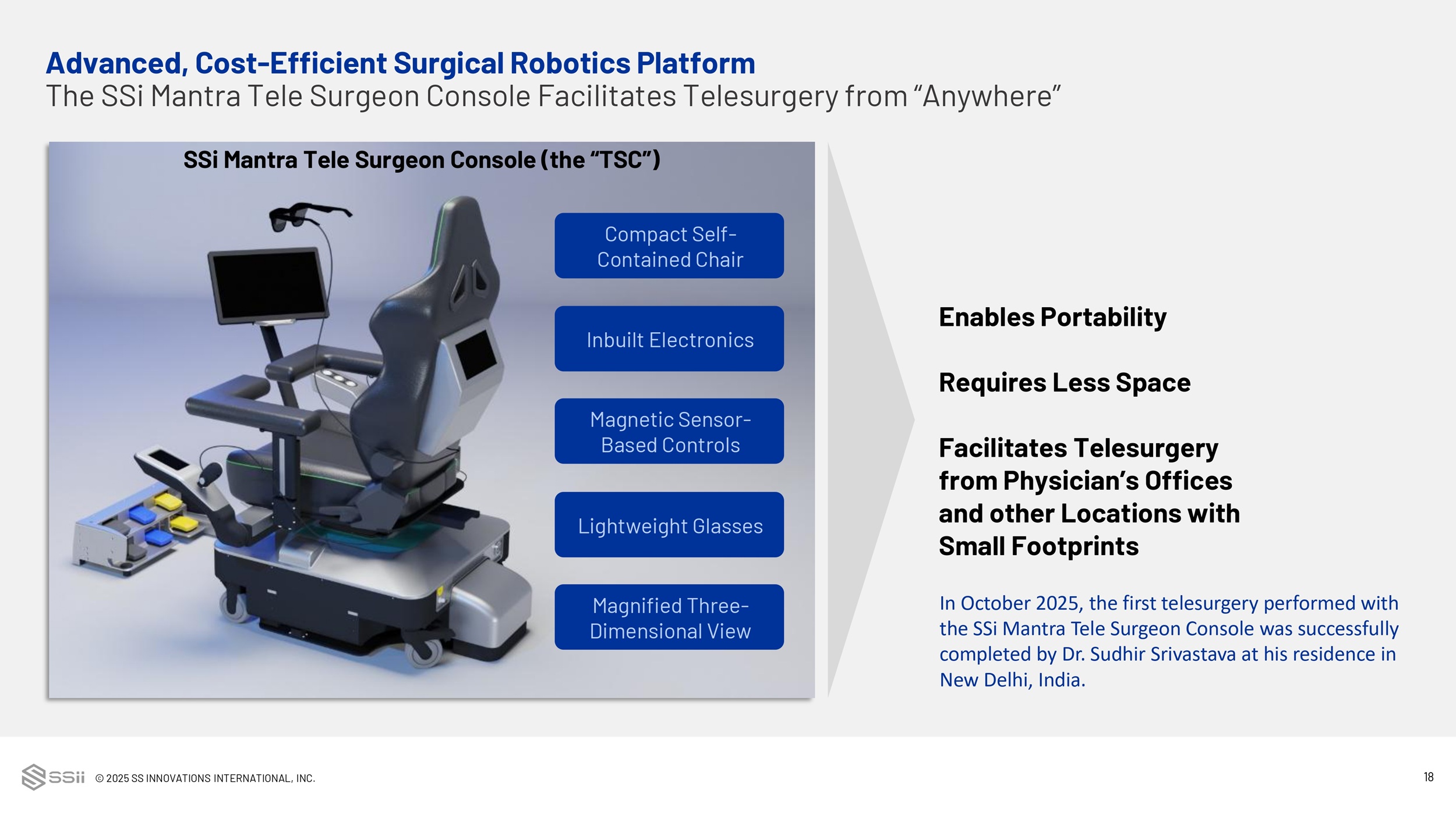 Note: 1 CDSCO approval SSII HQ Gurugram, India Manipal Hospital Jaipur, India 177 miles Feb 2025 SSII HQ Gurugram, India Aster CMI Hospital Bengaluru, India 1,245 miles Mar 2025 IRCAD HQ Strasbourg, France Sri Aurobindo IMS Indore, India 4,000 miles Jul 2025 World’s First Intercontinental Robotic Cardiac Telesurgery © 2025 SS INNOVATIONS INTERNATIONAL, INC. 18 Advanced, Cost - Efficient Surgical Robotics Platform The SSi Mantra Tele Surgeon Console Facilitates Telesurgery from “Anywhere” Compact Self - Contained Chair Inbuilt Electronics Magnetic Sensor - Based Controls Lightweight Glasses Magnified Three - Dimensional View SSi Mantra Tele Surgeon Console (the “TSC”) Enables Portability Requires Less Space Facilitates Telesurgery from Physician’s Offices and other Locations with Small Footprints In October 2025, the first telesurgery performed with the SSi Mantra Tele Surgeon Console was successfully completed by Dr. Sudhir Srivastava at his residence in New Delhi, India.