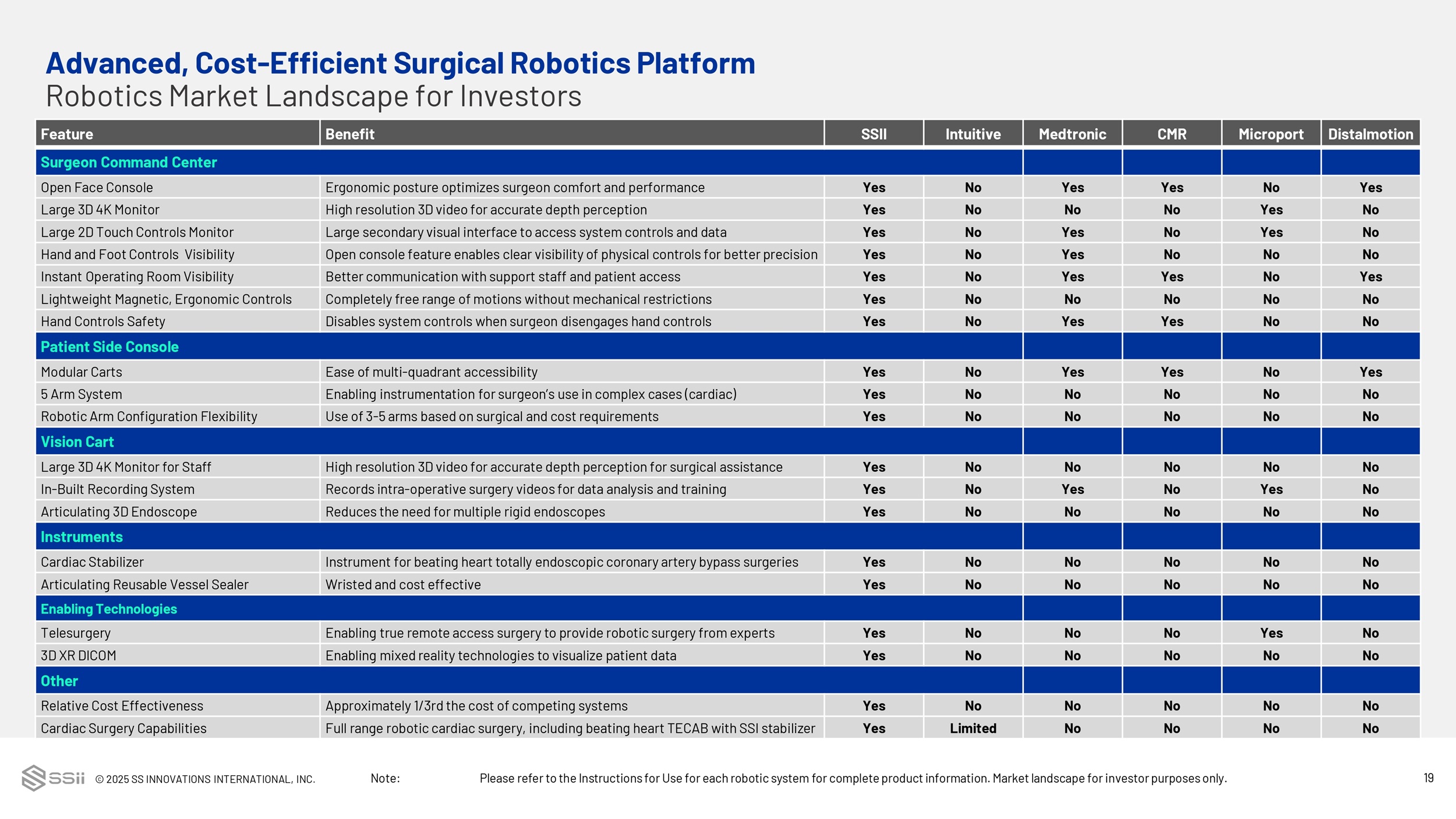 © 2025 SS INNOVATIONS INTERNATIONAL, INC. 19 Distalmotion Microport CMR Medtronic Intuitive SSII Benefit Feature Surgeon Command Center Yes No Yes Yes No Yes Ergonomic posture optimizes surgeon comfort and performance Open Face Console No Yes No No No Yes High resolution 3D video for accurate depth perception Large 3D 4K Monitor No Yes No Yes No Yes Large secondary visual interface to access system controls and data Large 2D Touch Controls Monitor No No No Yes No Yes Open console feature enables clear visibility of physical controls for better precision Hand and Foot Controls Visibility Yes No Yes Yes No Yes Better communication with support staff and patient access Instant Operating Room Visibility No No No No No Yes Completely free range of motions without mechanical restrictions Lightweight Magnetic, Ergonomic Controls No No Yes Yes No Yes Disables system controls when surgeon disengages hand controls Hand Controls Safety Patient Side Console Yes No Yes Yes No Yes Ease of multi - quadrant accessibility Modular Carts No No No No No Yes Enabling instrumentation for surgeon’s use in complex cases (cardiac) 5 Arm System No No No No No Yes Use of 3 - 5 arms based on surgical and cost requirements Robotic Arm Configuration Flexibility Vision Cart No No No No No Yes High resolution 3D video for accurate depth perception for surgical assistance Large 3D 4K Monitor for Staff No Yes No Yes No Yes Records intra - operative surgery videos for data analysis and training In - Built Recording System No No No No No Yes Reduces the need for multiple rigid endoscopes Articulating 3D Endoscope Instruments No No No No No Yes Instrument for beating heart totally endoscopic coronary artery bypass surgeries Cardiac Stabilizer No No No No No Yes Wristed and cost effective Articulating Reusable Vessel Sealer Enabling Technologies No Yes No No No Yes Enabling true remote access surgery to provide robotic surgery from experts Telesurgery No No No No No Yes Enabling mixed reality technologies to visualize patient data 3D XR DICOM Other No No No No No Yes Approximately 1/3rd the cost of competing systems Relative Cost Effectiveness No No No No Limited Yes Full range robotic cardiac surgery, including beating heart TECAB with SSI stabilizer Cardiac Surgery Capabilities Note: Please refer to the Instructions for Use for each robotic system for complete product information. Market landscape for in vestor purposes only.