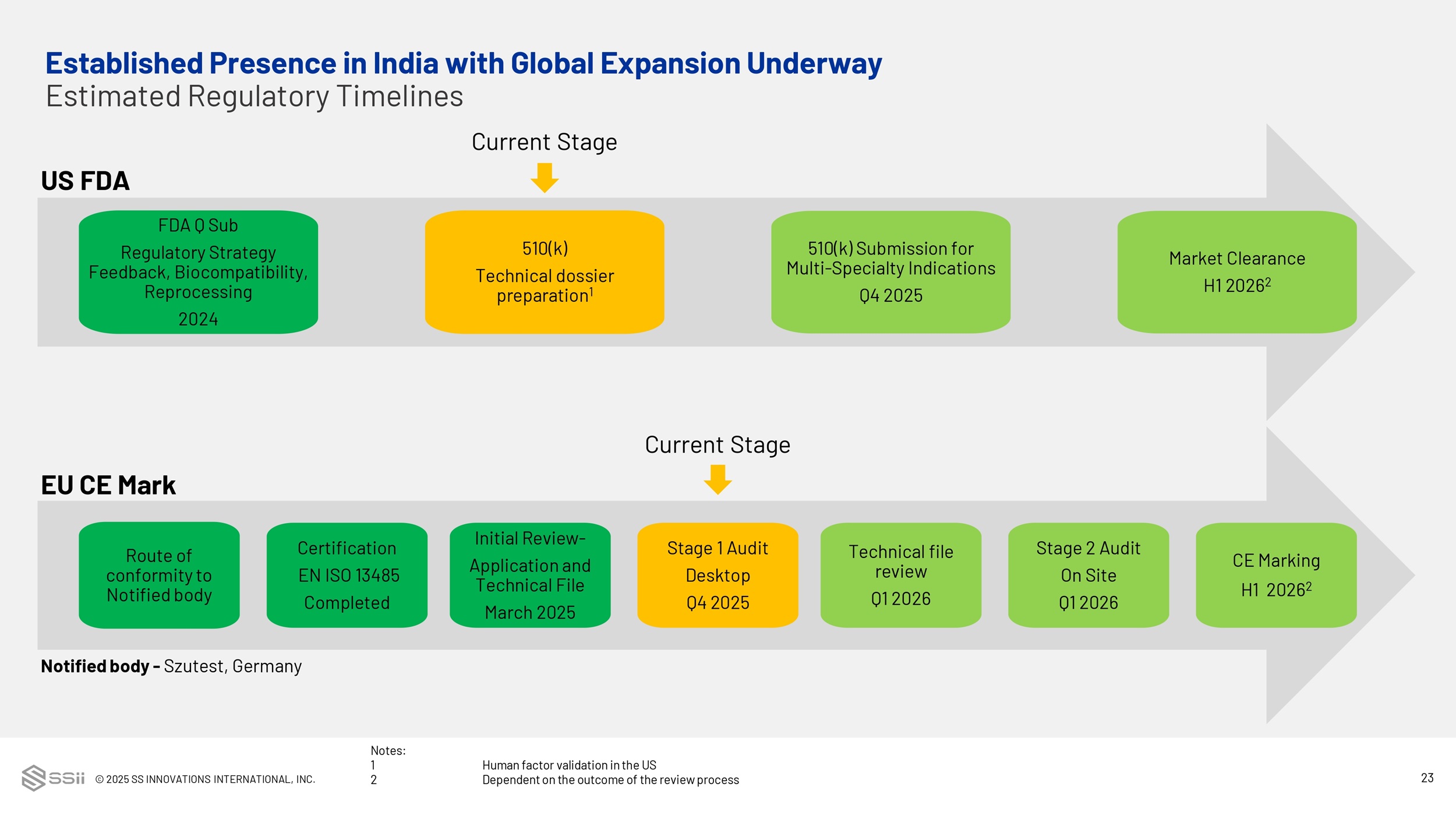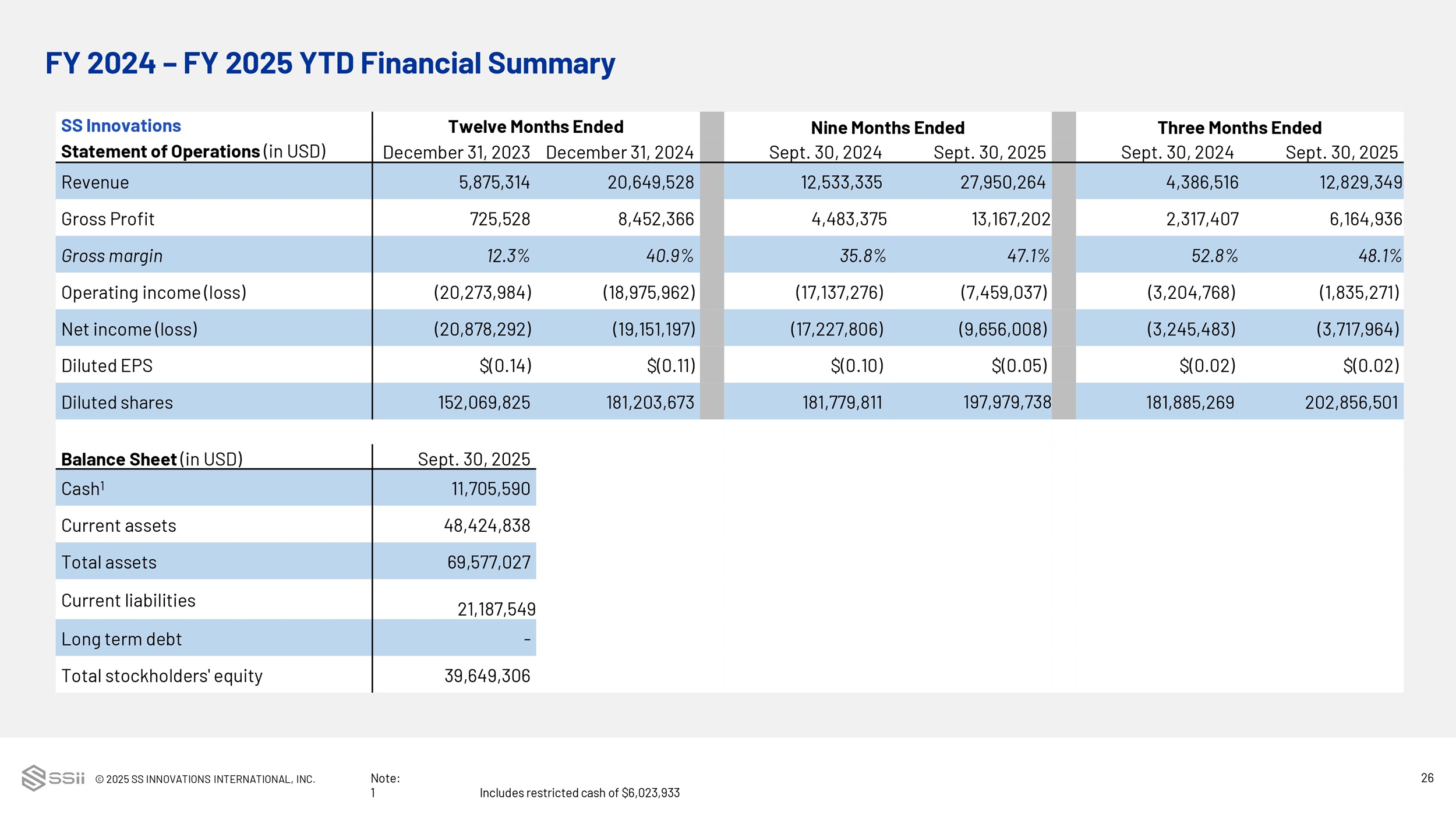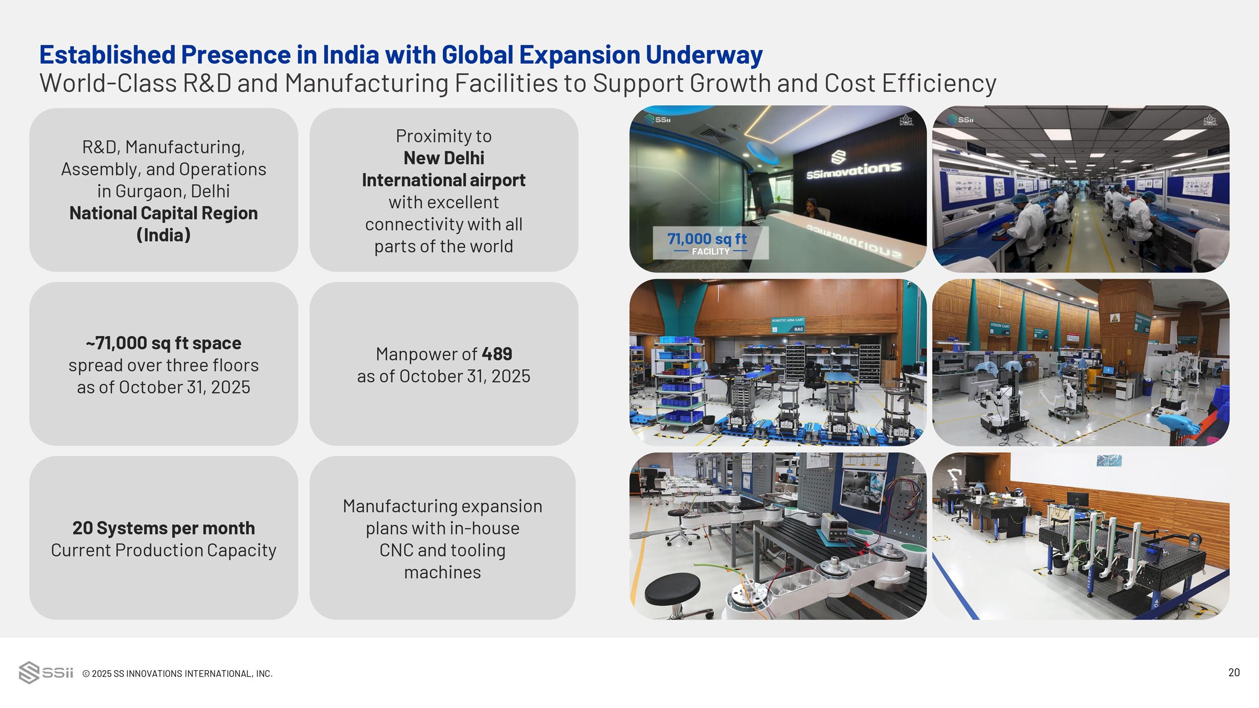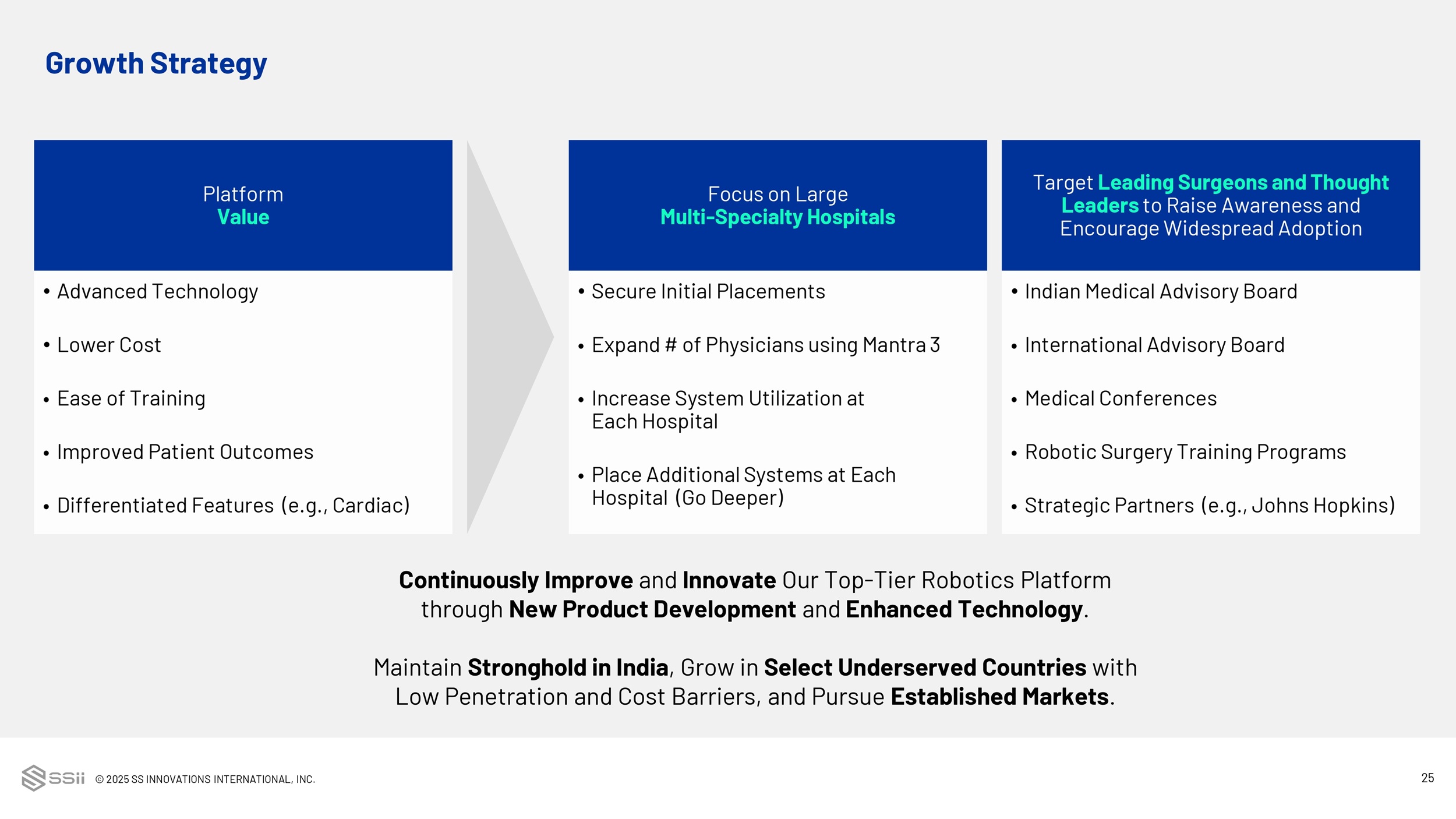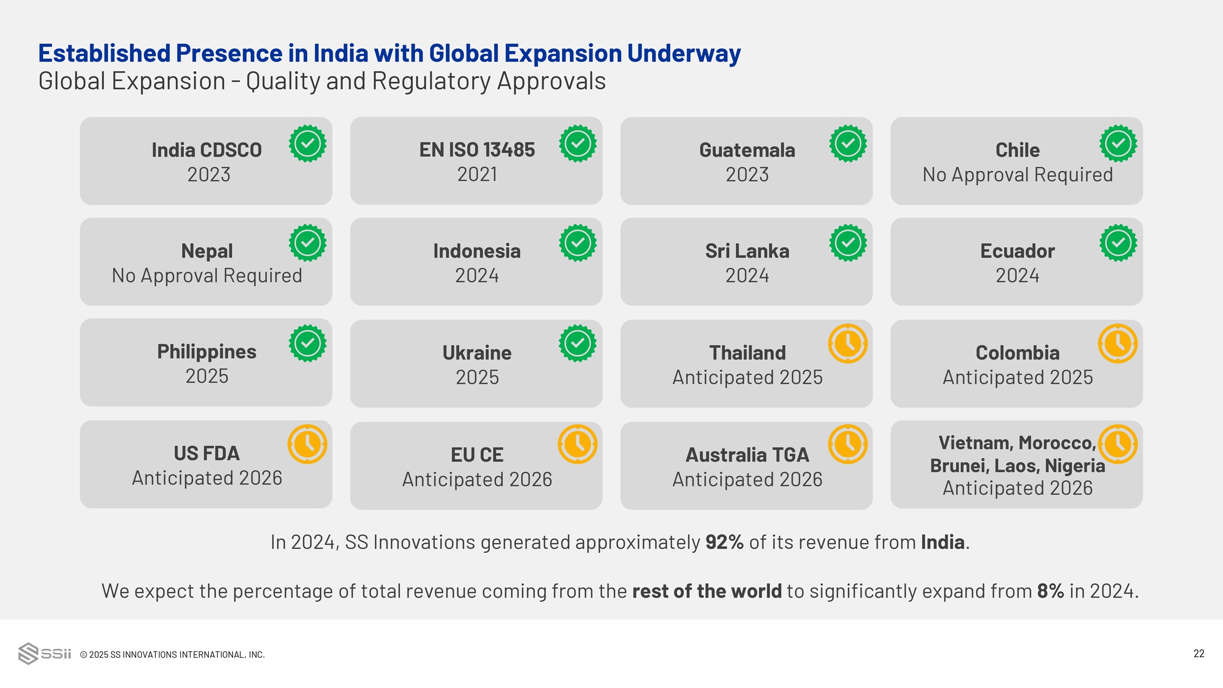 Philippines 2025 Colombia Anticipated 2025 US FDA Anticipated 2026 EU CE Anticipated 2026 Nepal No Approval Required Indonesia 2024 Ukraine 2025 Sri Lanka 2024 Chile No Approval Required Thailand Anticipated 2025 Australia TGA Anticipated 2026 Vietnam, Morocco, Brunei, Laos, Nigeria Anticipated 2026 © 2025 SS INNOVATIONS INTERNATIONAL, INC. 23 Route of conformity to Notified body Certification EN ISO 13485 Completed Stage 1 Audit Desktop Q4 2025 Stage 2 Audit On Site Q1 2026 CE Marking H1 2026 2 Initial Review - Application and Technical File March 2025 Notified body - Szutest , Germany Current Stage Technical file review Q1 2026 EU CE Mark Notes: 1 Human factor validation in the US 2 Dependent on the outcome of the review process Established Presence in India with Global Expansion Underway Estimated Regulatory Timelines FDA Q Sub Regulatory Strategy Feedback, Biocompatibility, Reprocessing 2024 510(k) Technical dossier preparation 1 510(k) Submission for Multi - Specialty Indications Q4 2025 Market Clearance H1 2026 2 Current Stage US FDA © 2025 SS INNOVATIONS INTERNATIONAL, INC. 24 94% 6% $20.6 mm Revenue 2024 Strong Sales Growth with an Increasing Mix of Recurring Consumables Revenue and Expanding Margins $ 5.9 $ 20.6 $12.5 $28.0 2023 2024 9M '24 9M '25 Revenue ($ millions) Note: 1 Recurring revenue defined as systems on rental / lease, instruments and consumables sales and maintenance service fees + 251 % + 123 % Gross Margin (%) 12.35% 40.93% 35.77% 47.11% 2023 2024 9M '24 9M '25 +2,858 bps +1,134 bps Revenue Mix (%) Systems Capital Sales Recurring As of third quarter 2025, recurring revenue exceeds 10% of total revenue. 1