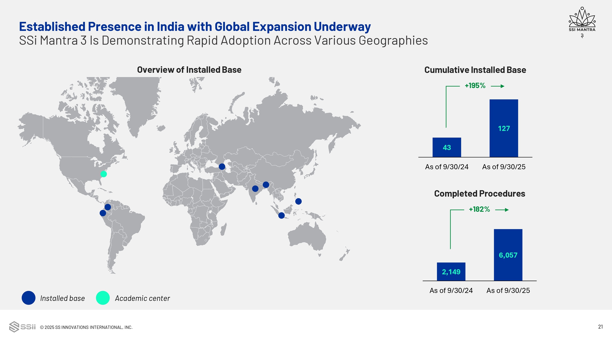 Advanced, Cost - Efficient Surgical Robotics Platform Robotics Market Landscape for Investors © 2025 SS INNOVATIONS INTERNATIONAL, INC. 20 Established Presence in India with Global Expansion Underway World - Class R&D and Manufacturing Facilities to Support Growth and Cost Efficiency R&D, Manufacturing, Assembly, and Operations in Gurgaon, Delhi National Capital Region (India) Proximity to New Delhi International airport with excellent connectivity with all parts of the world ~71,000 s q ft space spread over three floors as of October 31, 2025 20 Systems per month Current Production Capacity Manpower of 489 as of October 31, 2025 Manufacturing expansion plans with in - house CNC and tooling machines 71,000 sq ft FACILITY © 2025 SS INNOVATIONS INTERNATIONAL, INC. 21 43 127 As of 9/30/24 As of 9/30/25 Cumulative Installed Base 2,149 6,057 As of 9/30/24 As of 9/30/25 Completed Procedures Installed base Overview of Installed Base +195% +182% Academic center Established Presence in India with Global Expansion Underway SSi Mantra 3 Is Demonstrating Rapid Adoption Across Various Geographies