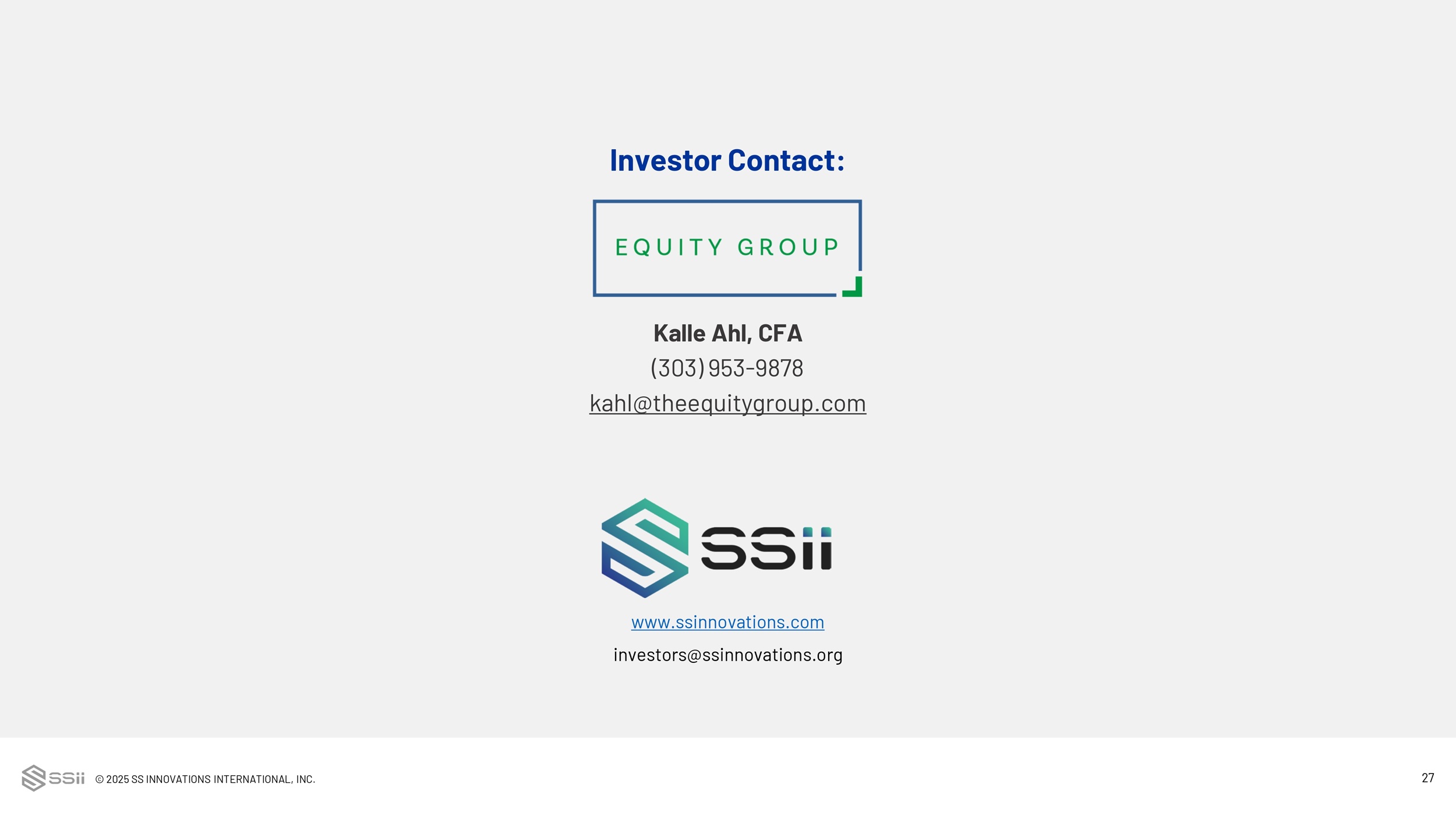 © 2025 SS INNOVATIONS INTERNATIONAL, INC. 26 FY 2024 – FY 2025 YTD Financial Summary Three Months Ended Nine Months Ended Twelve Months Ended SS Innovations Sept. 30, 2025 Sept. 30 , 2024 Sept. 30, 2025 Sept. 30 , 2024 December 31, 2024 December 31, 2023 Statement of Operations (in USD) 12,829,349 4,386,516 27,950,264 12,533,335 20,649,528 5,875,314 Revenue 6,164,936 2,317,407 13,167,202 4,483,375 8,452,366 725,528 Gross Profit 48.1% 52.8% 47.1% 35.8% 40.9% 12.3% Gross margin (1,835,271) (3,204,768) (7,459,037) (17,137,276) (18,975,962) (20,273,984) Operating income (loss) (3,717,964) (3,245,483) (9,656,008) (17,227,806) (19,151,197) (20,878,292) Net income (loss) $(0.02) $(0.02) $(0.05) $(0.10) $(0.11) $(0.14) Diluted EPS 202,856,501 181,885,269 197,979,738 181,779,811 181,203,673 152,069,825 Diluted shares Sept. 30, 2025 Balance Sheet (in USD) 11,705,590 Cash 1 48,424,838 Current assets 69,577,027 Total assets 21,187,549 Current liabilities - Long term debt 39,649,306 Total stockholders' equity Note: 1 Includes restricted cash of $6,023,933 © 2025 SS INNOVATIONS INTERNATIONAL, INC. 27 www.ssinnovations.com investors@ssinnovations.org Investor Contact: Kalle Ahl, CFA (303) 953 - 9878 kahl@theequitygroup.com