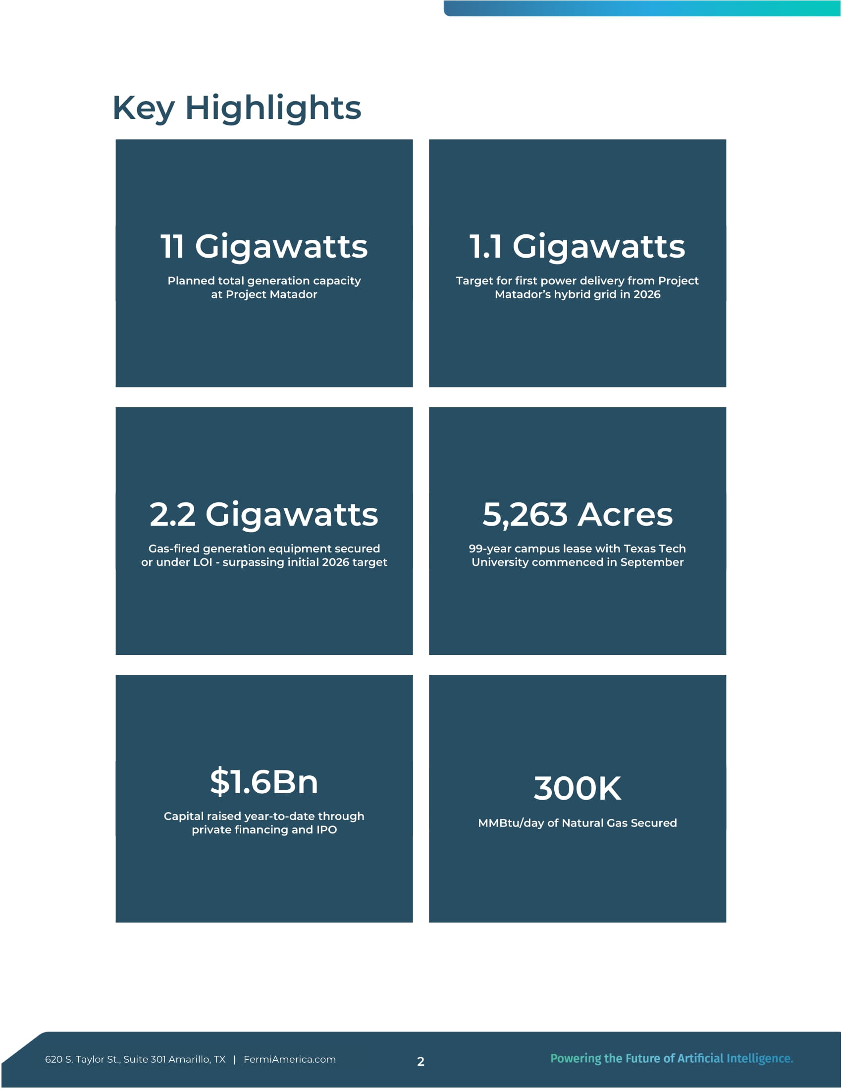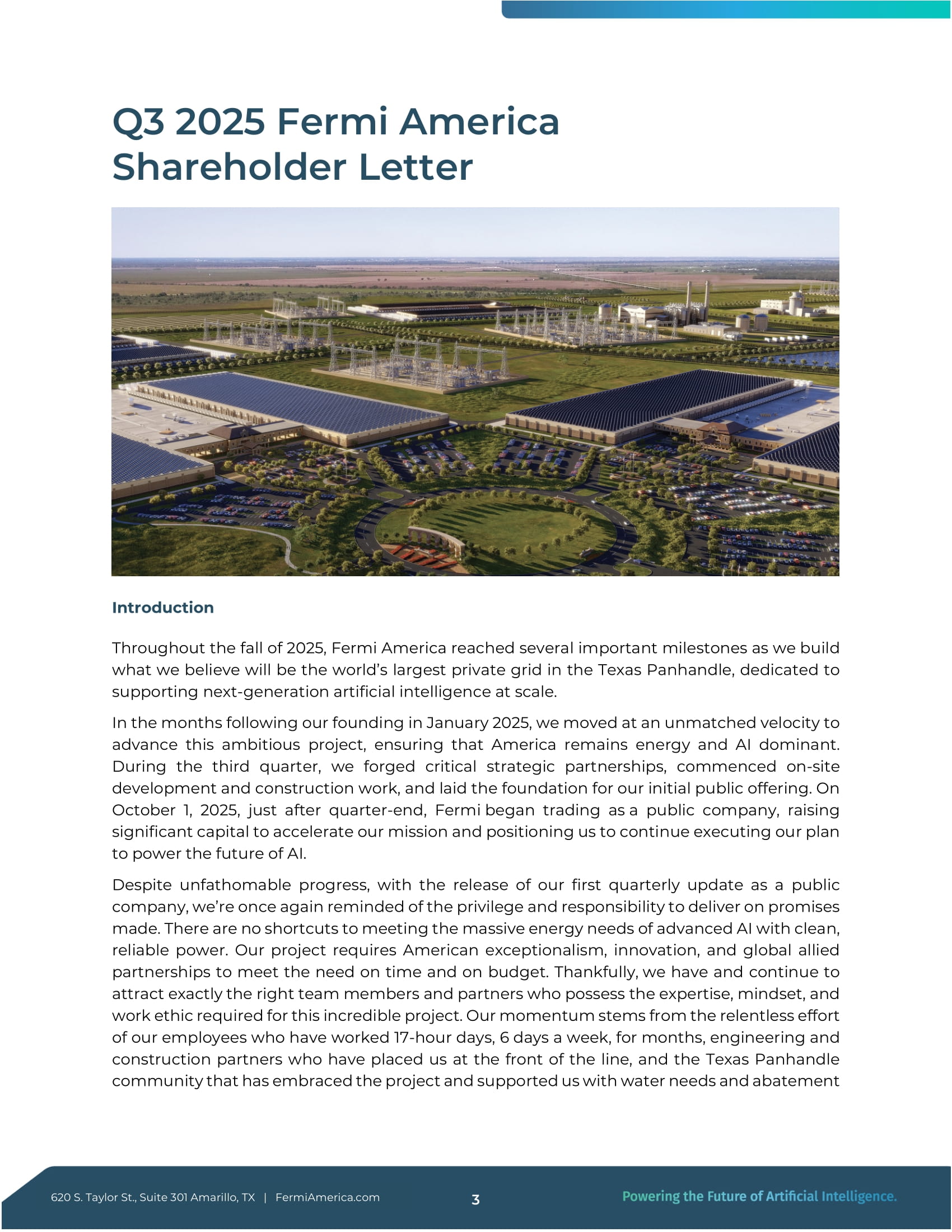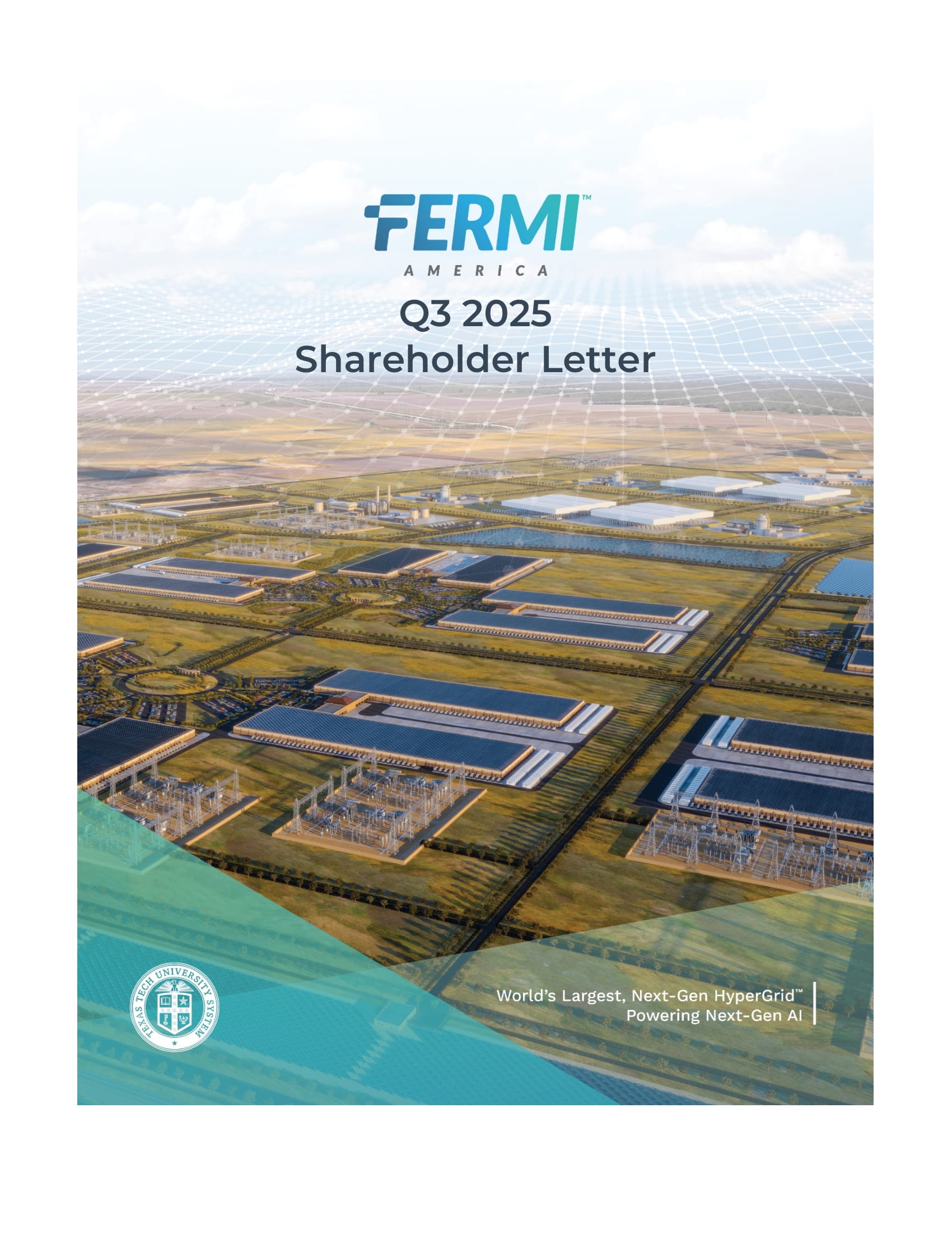 Taylor St、Suite 301 Amarillo, TX | FermiAmerica.com 2 1.1ギガワット プロジェクト・マタドールのハイブリッド・グリッドからの最初の電力供給目標は2026年 11ギガワット プロジェクト・マタドールの計画総発電容量は5,263エーカー 99年間のテキサス工科大学とのキャンパス・リースを9月に開始 2.2ギガワット ガス焚き発電設備を確保またはLOI中 - 2026年の当初目標を上回る 30万MMBtu/日の天然ガスを確保 1.2025 年第 3 四半期 フェルミ・アメリカ 株主通信 はじめに 2025 年秋、フェルミ・アメリカは、テキサス州パンハンドルに次世代人工知能を大規模にサポートする世界最大規模のプライベート・グリッドを建設するにあたり、いくつかの重要な節目を迎えました。2025年1月の設立から数ヶ月間、私たちはこの野心的なプロジェクトを推進するため、他に類を見ないスピードで前進し、アメリカがエネルギーとAIの優位国であり続けることを確実にしました。第3四半期には、重要な戦略的パートナーシップを構築し、現地開発と建設工事を開始し、株式公開の基礎を固めました。四半期末直後の2025年10月1日、フェルミは株式公開会社として取引を開始し、我々の使命を加速させるために多額の資金を調達し、AIの未来に電力を供給する計画を実行し続ける体制を整えました。計り知れない進展にもかかわらず、公開企業としての最初の四半期報告書を発表したことで、私たちは、約束したことを実現する特権と責任を改めて思い知らされました。クリーンで信頼性の高い電力で高度なAIの膨大なエネルギー需要を満たす近道はありません。私たちのプロジェクトは、米国の卓越性、革新性、そして世界的な提携関係を必要とし、期限内かつ予算内でニーズを満たす必要があります。ありがたいことに、私たちは、この素晴らしいプロジェクトに必要な専門知識、考え方、労働倫理を持つ、まさに適切なチームメンバーやパートナーを引きつけ、そして引きつけ続けている。私たちの勢いは、何カ月も週6日、17時間労働をこなしてきた従業員たち、私たちを最前線に置いてくれたエンジニアリングや建設のパートナーたち、そしてこのプロジェクトを受け入れ、水需要や除染で私たちを支援してくれたテキサス・パンハンドル地域社会の絶え間ない努力の賜物である。