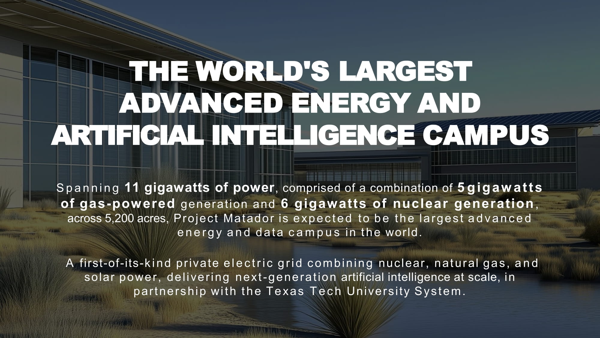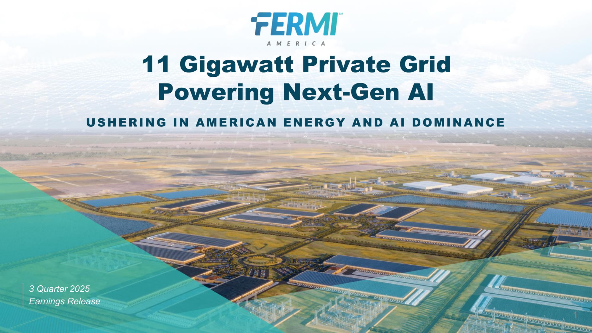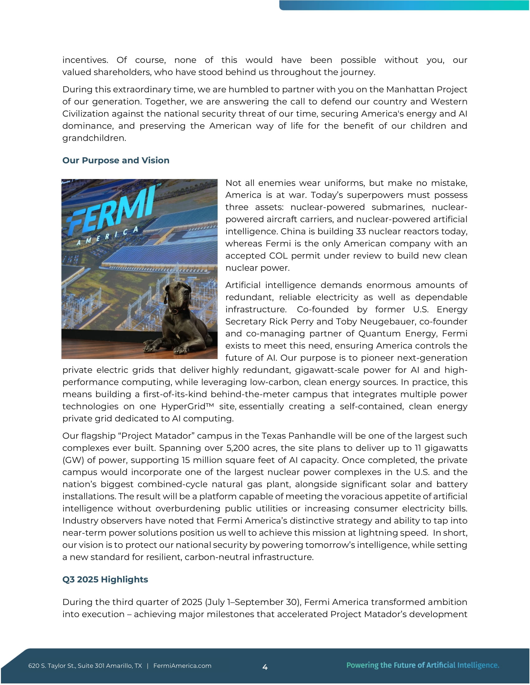 Taylor St., Suite 301 Amarillo, TX | FermiAmerica.com 3 インセンティブ .もちろん、このようなことが可能になったのは、この道のりをずっと支えてくださった大切な株主の皆様のおかげです。この特別な時期に、私たちの世代のマンハッタン・プロジェクトで皆様とともに歩むことができ、身の引き締まる思いです。私たちは共に、現代の国家安全保障上の脅威から我が国と西洋文明を守り、米国のエネルギーとAIの優位性を確保し、子々孫々のために米国の生活様式を守るという要請に応えているのです。我々の目的とビジョン すべての敵が制服を着ているわけではないが、間違いなくアメリカは戦争状態にある。原子力潜水艦、原子力空母、そして原子力人工知能である。中国は現在、33基の原子炉を建設しているが、フェルミはクリーンな原子力を新たに建設するために審査中のCOL許可を受けた唯一のアメリカ企業である。人工知能は、膨大な量の冗長で信頼できる電力と、信頼できるインフラを必要とする。フェルミ社は、リック・ペリー元米国エネルギー長官とトビー・フェルミ元米国エネルギー省長官によって設立された。リック・ペリー元米国エネルギー長官と、クォンタム・エナジーの共同設立者兼共同経営パートナーであるトビー・ノイゲバウアー氏によって共同設立されたフェルミは、このニーズに応え、米国がAIの未来を確実にコントロールするために存在します。我々の目的は、低炭素でクリーンなエネルギー源を活用しながら、AIと高性能コンピューティングのために高度に冗長化されたギガワット規模の電力を供給する次世代プライベート・エレクトリック・グリッドを開拓することである。具体的には、複数の電力技術を1つのHyperGridサイトに統合し、AIコンピューティングに特化した自己完結型のクリーン・エネルギー・プライベート・グリッドを構築する、世界初のビハインド・ザ・メーター・キャンパスの建設を意味する。テキサス・パンハンドルにある私たちのフラッグシップ・キャンパス「プロジェクト・マタドール」は、このような複合施設としては過去最大級のものとなる。敷地面積は5,200エーカーに及び、最大11ギガワット(GW)の電力を供給し、1,500万平方フィートのAI容量をサポートする計画だ。完成すれば、このプライベート・キャンパスは、米国最大級の原子力発電所と米国最大の天然ガス複合発電所、そして大規模な太陽光発電所とバッテリー設備を併せ持つことになる。その結果、公共事業に過度の負担をかけることなく、消費者の電気代を増やすことなく、人工知能の旺盛な食欲を満たすことができるプラットフォームとなる。業界のオブザーバーは、フェルミ・アメリカの特徴的な戦略と短期的な電力ソリューションを利用する能力が、この使命を電光石火のスピードで達成するのに適していると指摘している。つまり、当社のビジョンは、明日のインテリジェンスに電力を供給することで、国家安全保障を守ると同時に、弾力性のあるカーボンニュートラルなインフラの新たな基準を打ち立てることなのです。Q 3 2025 年ハイライト 2025 年第 3 四半期(7 月 1 日~9 月 30 日)、フェルミ・アメリカは野心を実行に移した。
