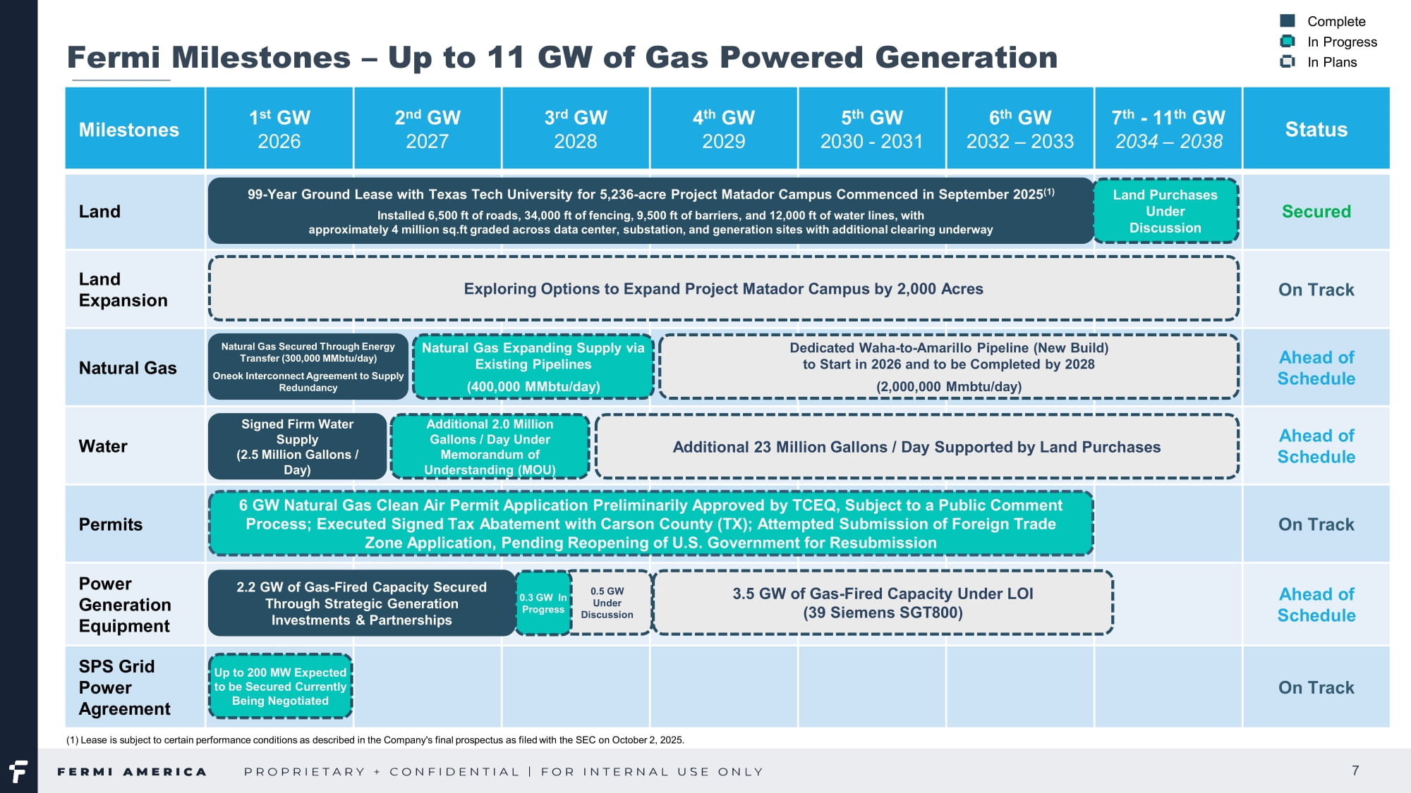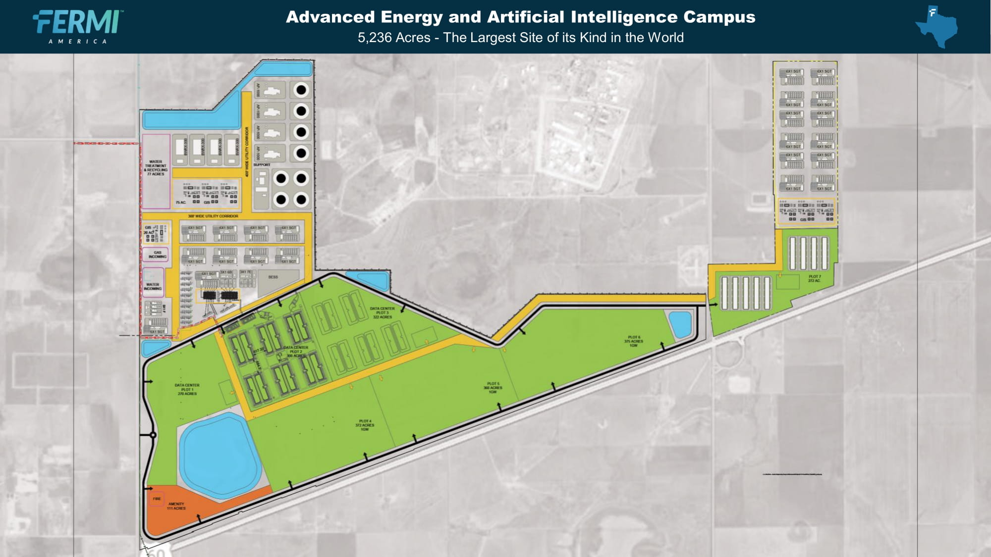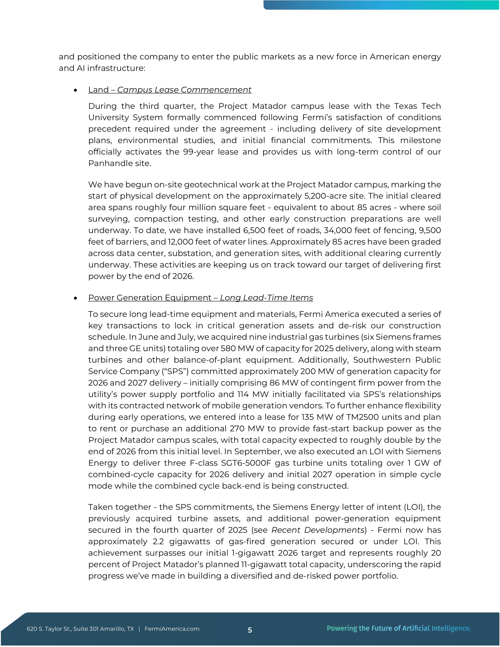 Taylor St., Suite 301 Amarillo, TX|FermiAmerica.com4、アメリカのエネルギーとAIインフラにおける新たな勢力として公共市場に参入するための位置づけ: 土地 - キャンパスのリース開始 第3四半期中、テキサス工科大学システムとのプロジェクト・マタドール・キャンパスのリースが正式に開始された。このマイルストーンにより、99年間のリースが正式に開始され、当社はパンハンドルの敷地を長期的に管理することになる。プロジェクト・マタドール・キャンパスでは、約5,200エーカーの敷地で物理的な開発を開始するため、敷地内での地質調査を開始した。初期整地面積は約400万平方フィート(約85エーカー相当)で、土壌調査、締固め試験、その他の初期建設準備が順調に進んでいる。現在までに、6,500フィートの道路、34,000フィートのフェンス、9,500フィートのバリア、12,000フィートの水道管を設置した。データセンター、変電所、発電所の各敷地では約85エーカーの整地が完了し、現在さらに整地が進行中である。これらの活動により、2026年末までに最初の電力を供給するという目標に向かって順調に進んでいる。 発電設備 - リードタイムの長いもの リードタイムの長い設備や資材を確保するため、フェルミ・アメリカは重要な発電資産を固定し、建設スケジュールのリスクを軽減する一連の重要な取引を実行した。6月と7月には、合計580MWを超える容量の産業用ガスタービン9基(シーメンス製6基とGE製3基)を蒸気タービンやその他の発電所設備とともに2025年に納入するために取得した。さらに、サウスウエスタン・パブリック・サービス・カンパニー(SPS)は、2026年と2027年に約200MWの発電容量を納入することを約束した。当初は、同公社の電力供給ポートフォリオから86MWの偶発的な固定電力と、SPSが契約している移動式発電ベンダーネットワークとの関係を通じて供給される114MWの発電容量から構成される。また、操業初期の柔軟性をさらに高めるため、135MWのTM2500ユニットのリース契約を締結し、プロジェクト・マタドール・キャンパスの規模が拡大するにつれて、迅速なバックアップ電力を供給するため、さらに270MWをレンタルまたは購入する予定である。また9月には、シーメンス・エナジー社との間で、2026年の納入と2027年の初期運転に向け、合計1GWを超える複合火力発電容量となるFクラスSGT6-5000Fガスタービン3基の納入に関するLOIを締結した。SPSのコミットメント、シーメンス・エナジーの趣意書(LOI)、以前に買収したタービン資産、2025年第4四半期に確保した追加発電設備(最近の動きを参照)を合わせると、フェルミは現在、約2.2ギガワットのガス火力発電を確保またはLOI下に置いていることになる。この実績は、当初の目標であった2026年の1ギガワットを上回るもので、プロジェクト・マタドールが計画している総発電容量11ギガワットの約20%に相当する。620 S.